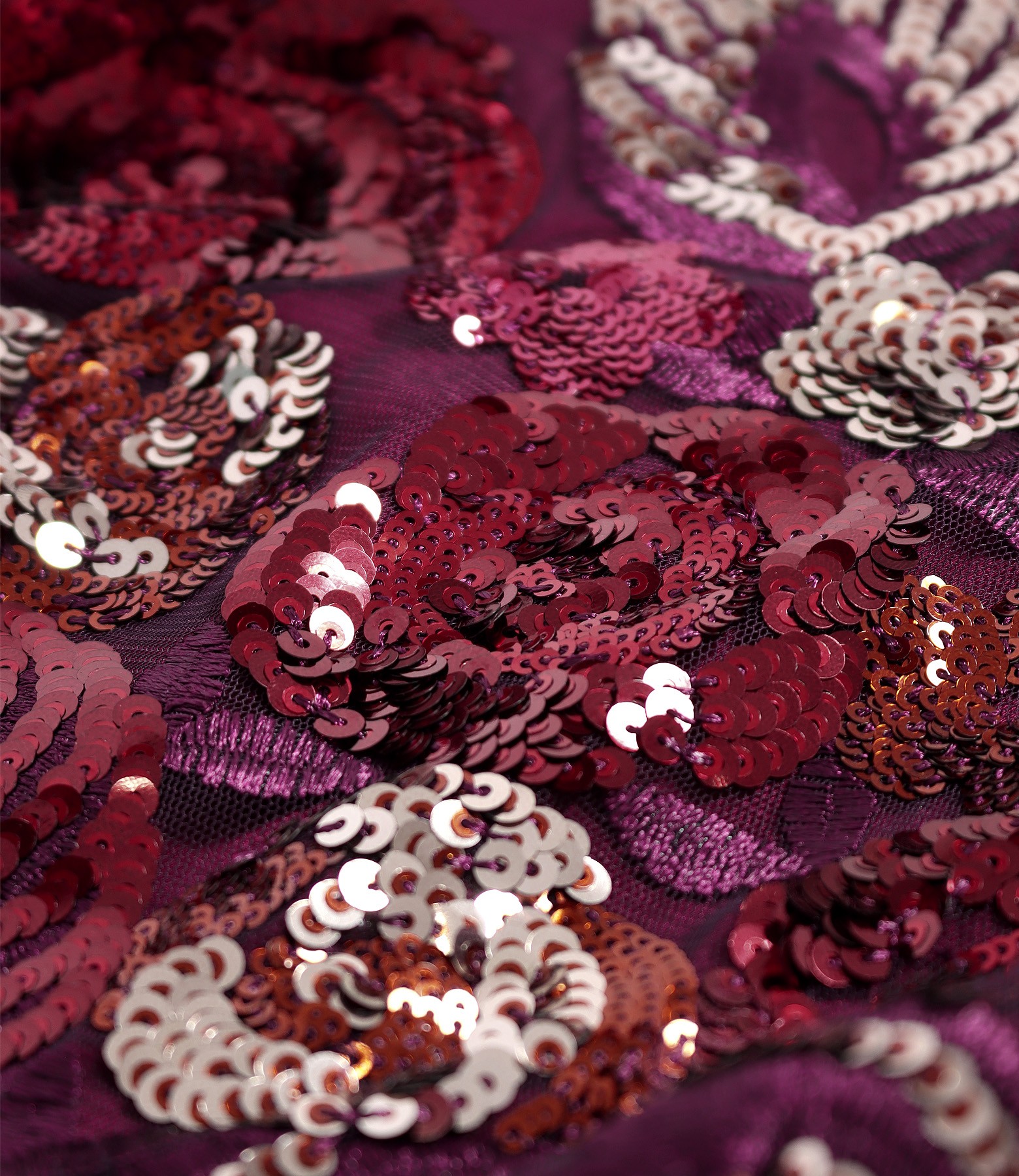 Satin midi dress with sequined bust with floral motifs, collar, wide sleeves gathered at the end, and a slit across the middle of the back. It closes with a hidden zipper in the middle of the back.