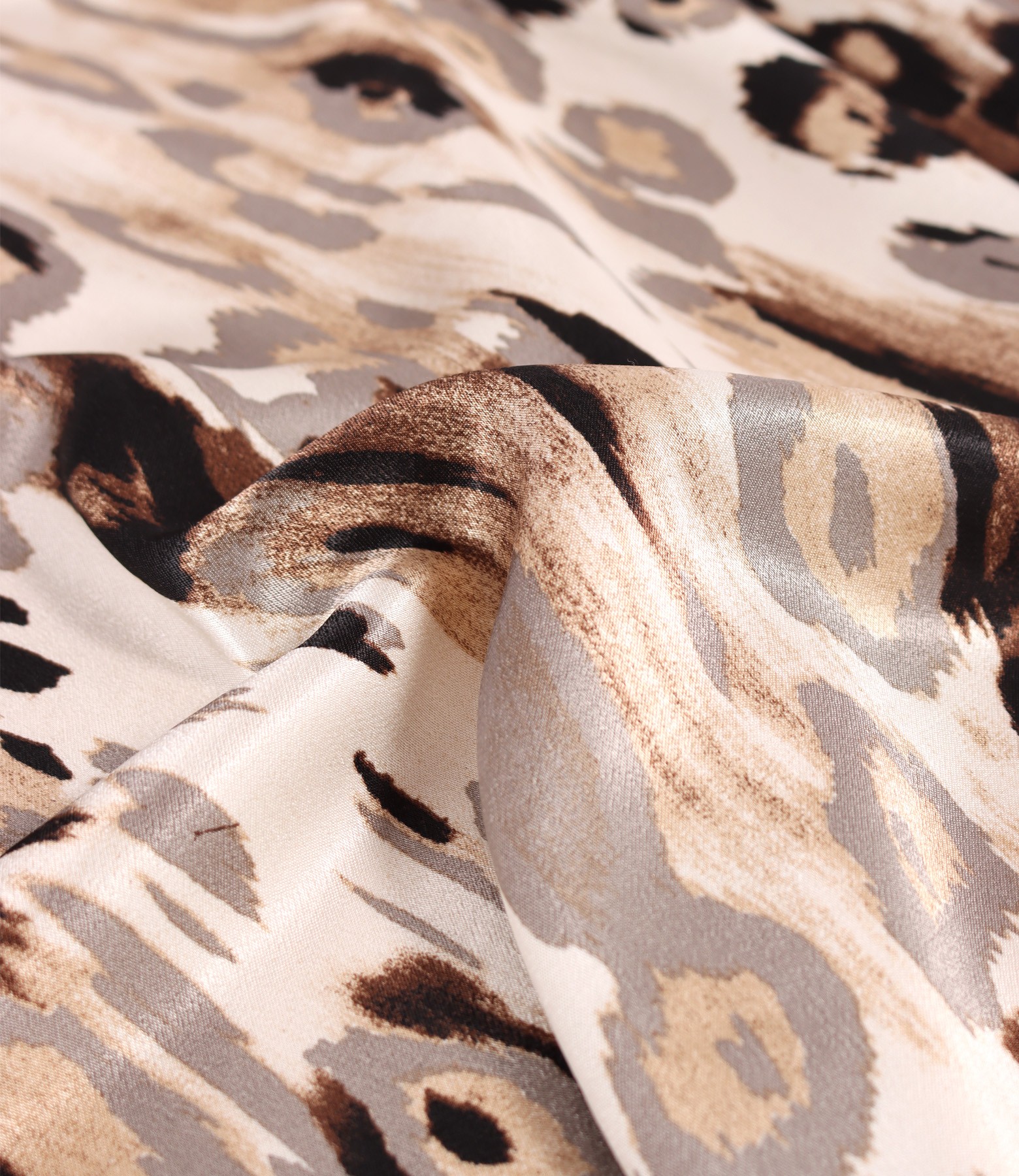 Blouse made of satin viscose with animal print, featuring 3/4 sleeves, a front pleat, and a round neckline. Fastens with a single button at the center back. The position of the print varies per product.