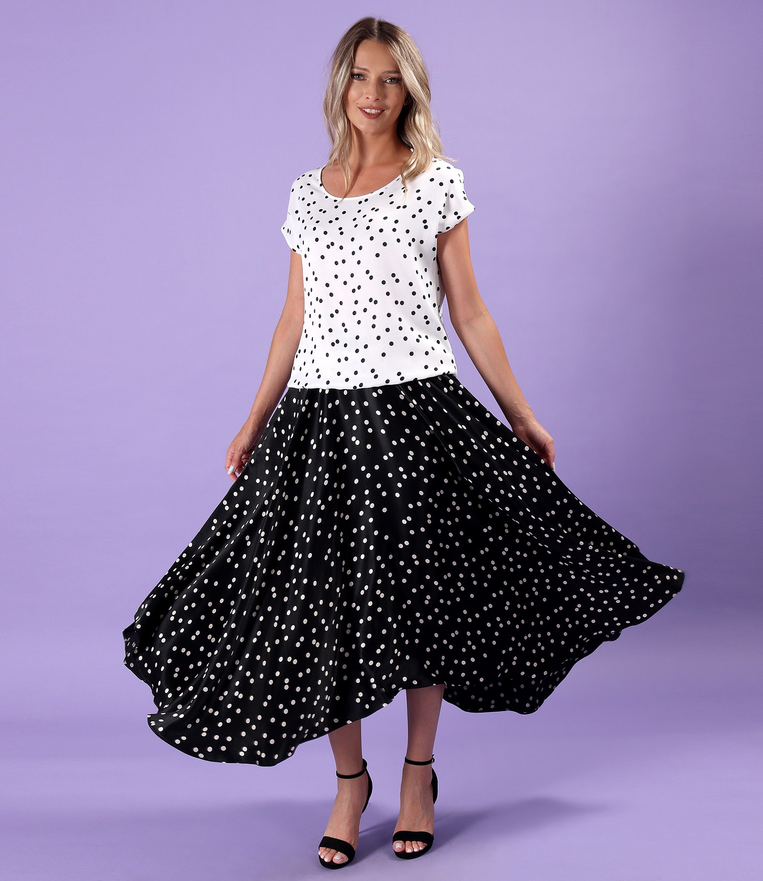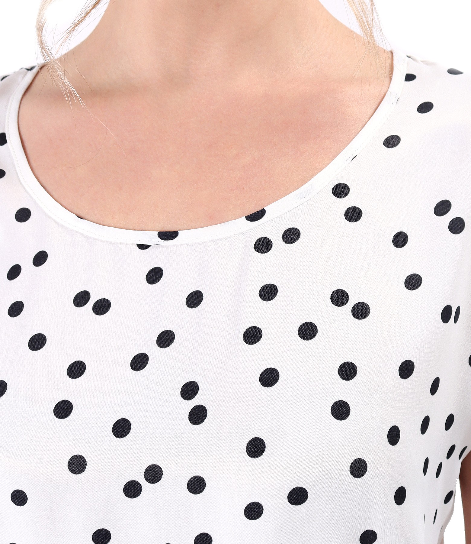Satin viscose blouse printed with polka dots, dropped shoulders, and elastic waist.
