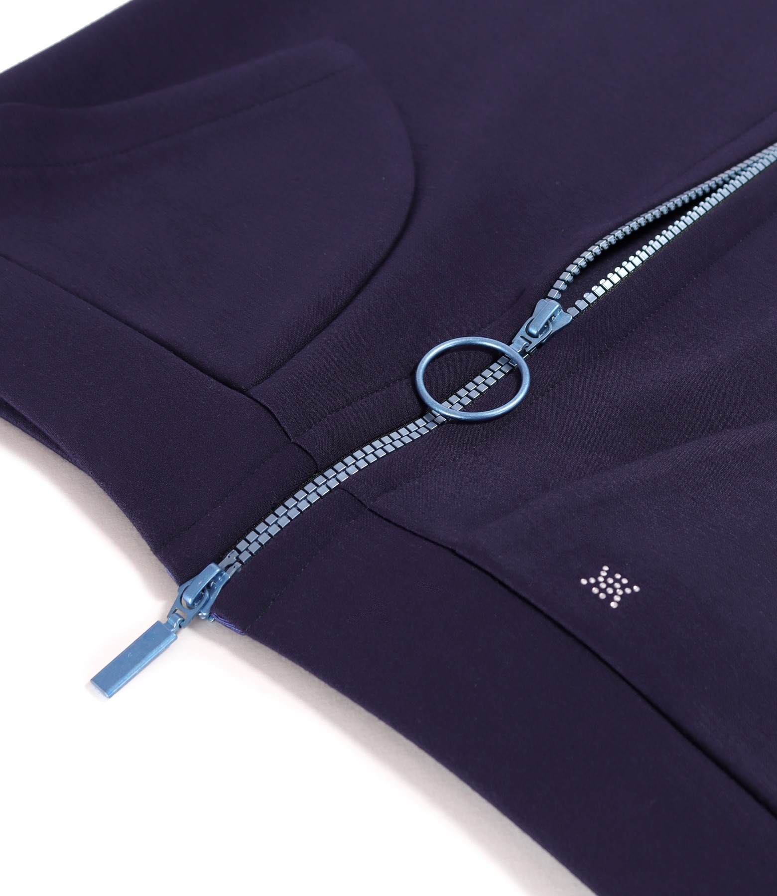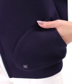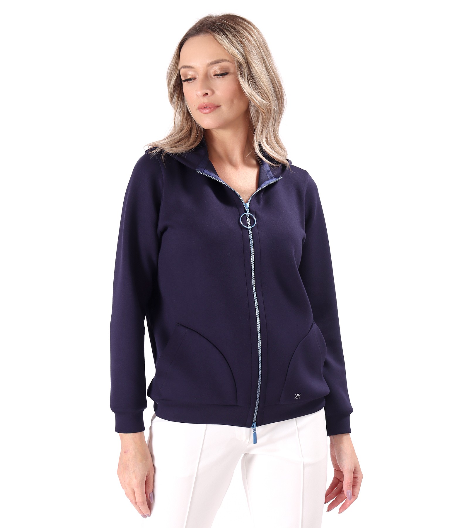 Scuba fabric sweatshirt with viscose, hood, side patch pockets on the front, and two-way zipper.