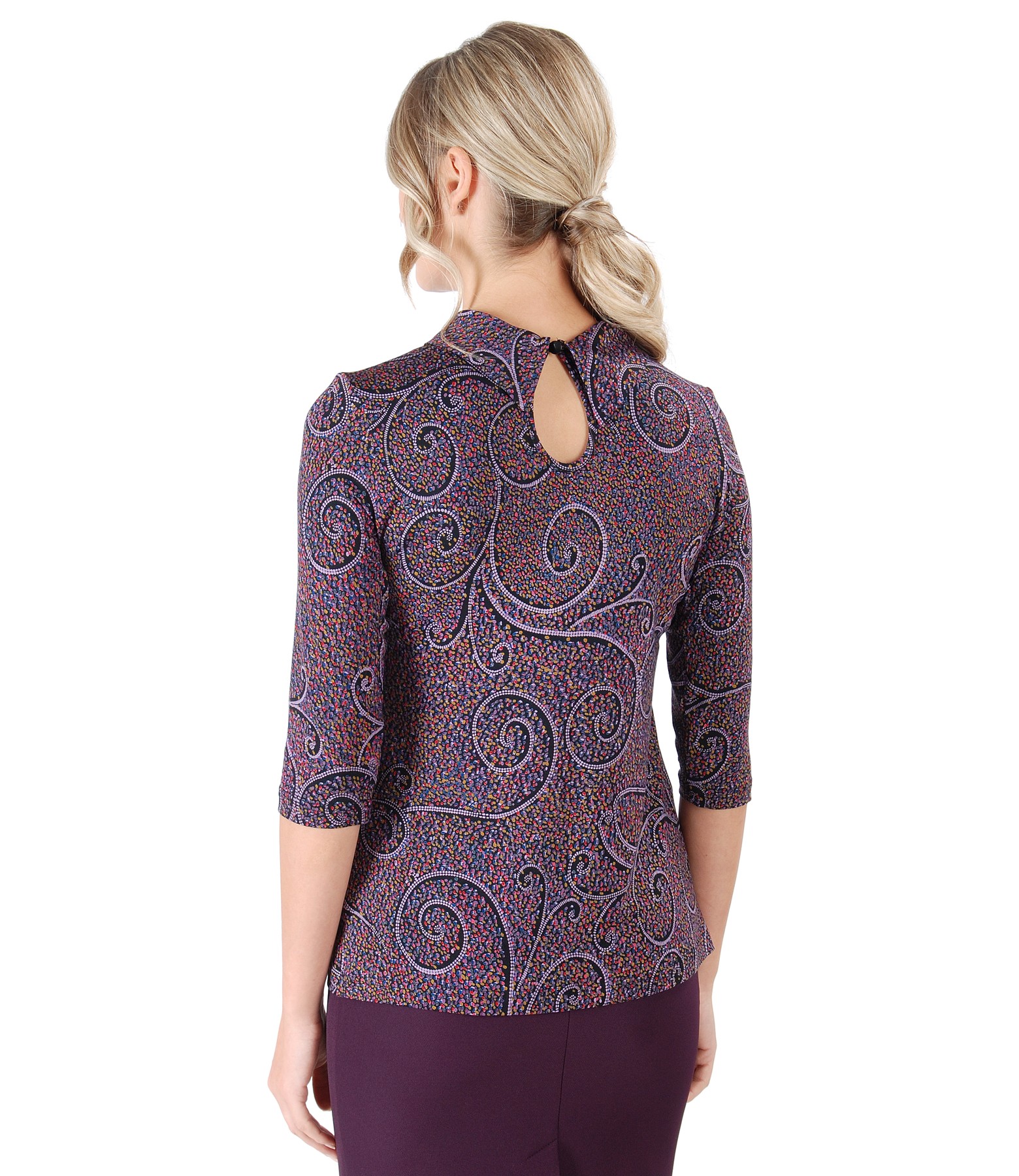 Shite made of elastic jersey printed, 3/4 sleeves, round collar at the base of the neck embellished with crystals from on the collar. It closes with a button on the middle back.