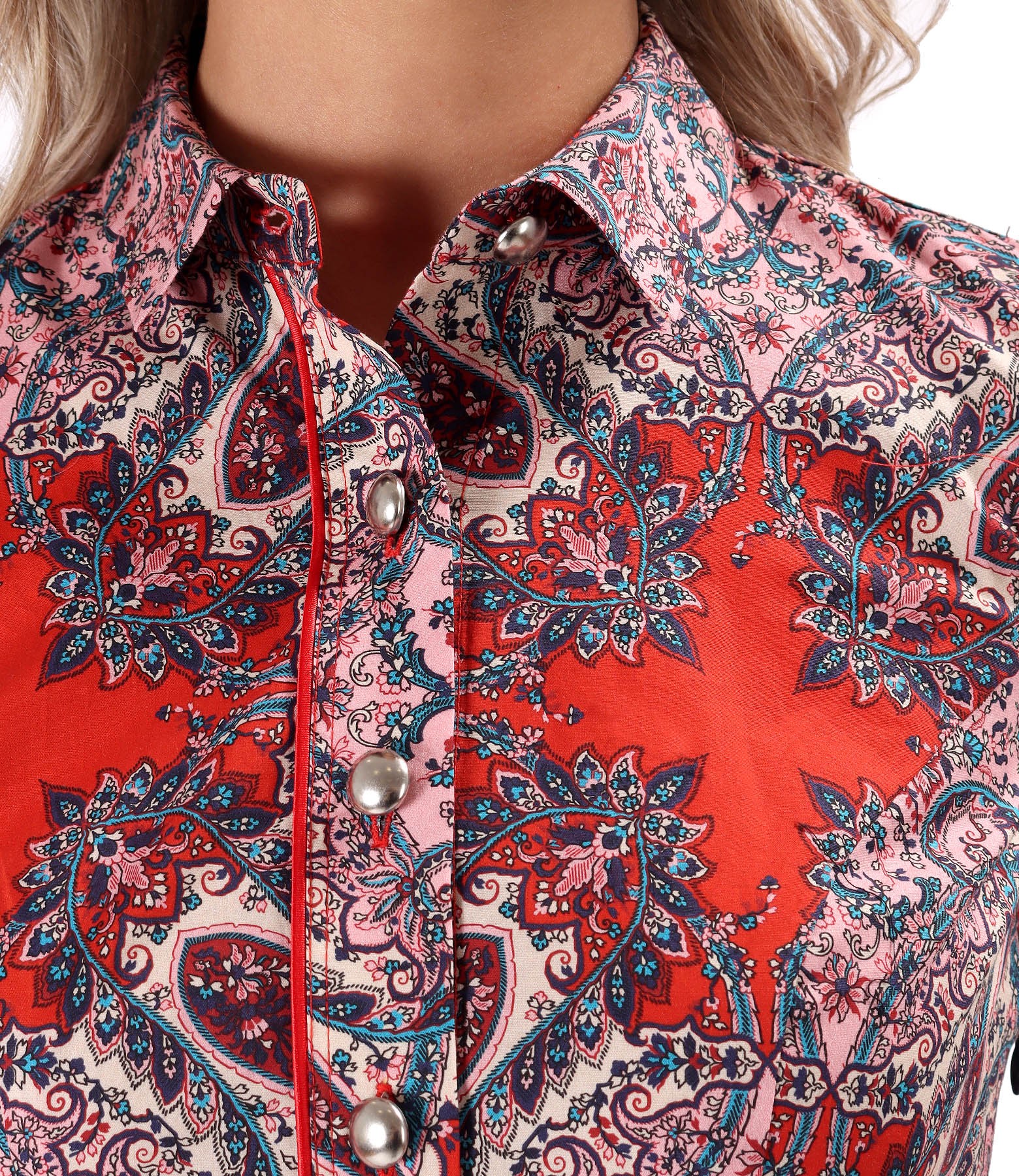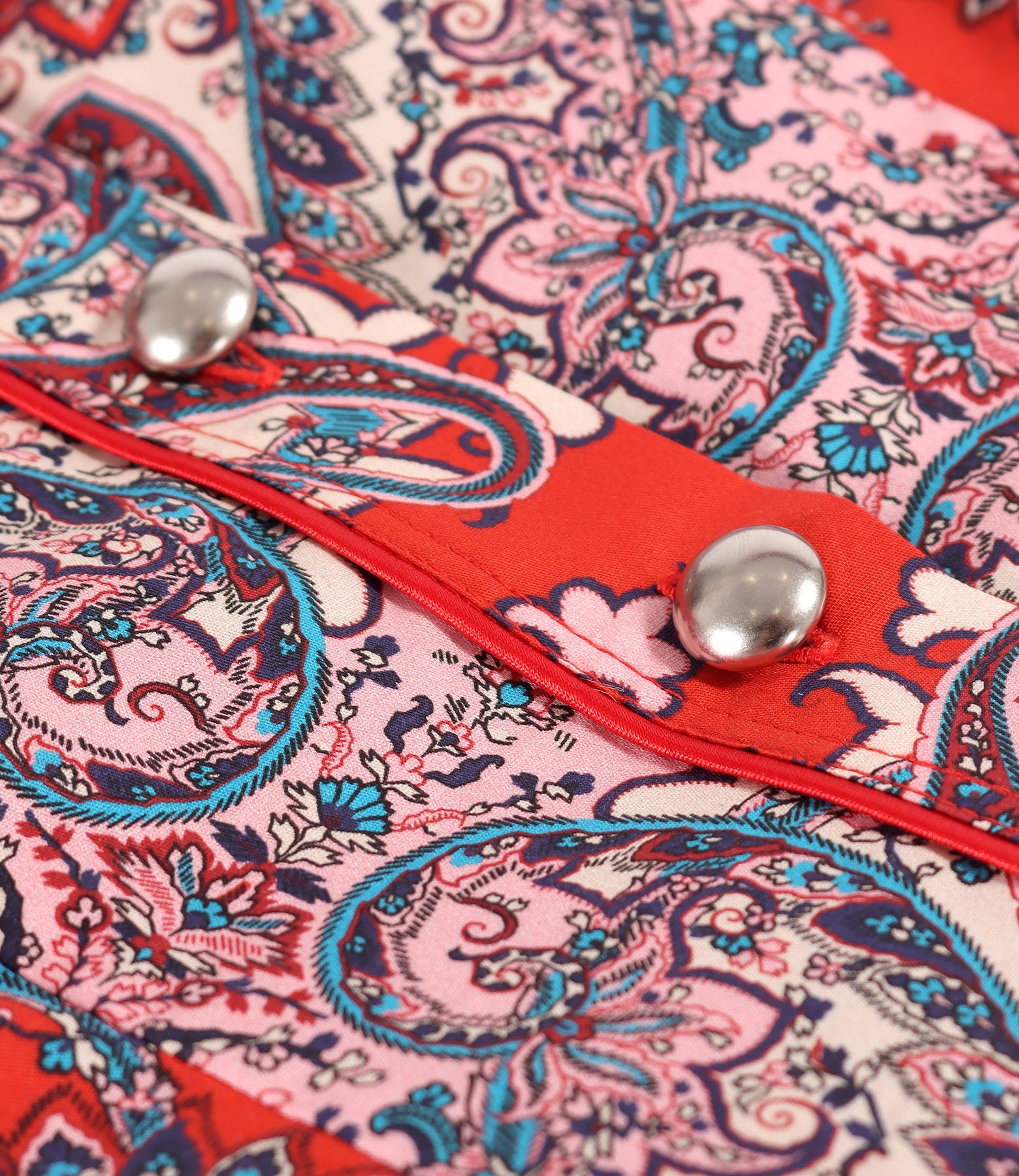 Shirt-type dress made of elastic cotton digitally printed with paisley motifs, with side pleats on the front and back, 3/4 sleeves, and drawstring at the waist. It closes with 5 buttons on the middle front and side zipper. The position of the print varies per product.