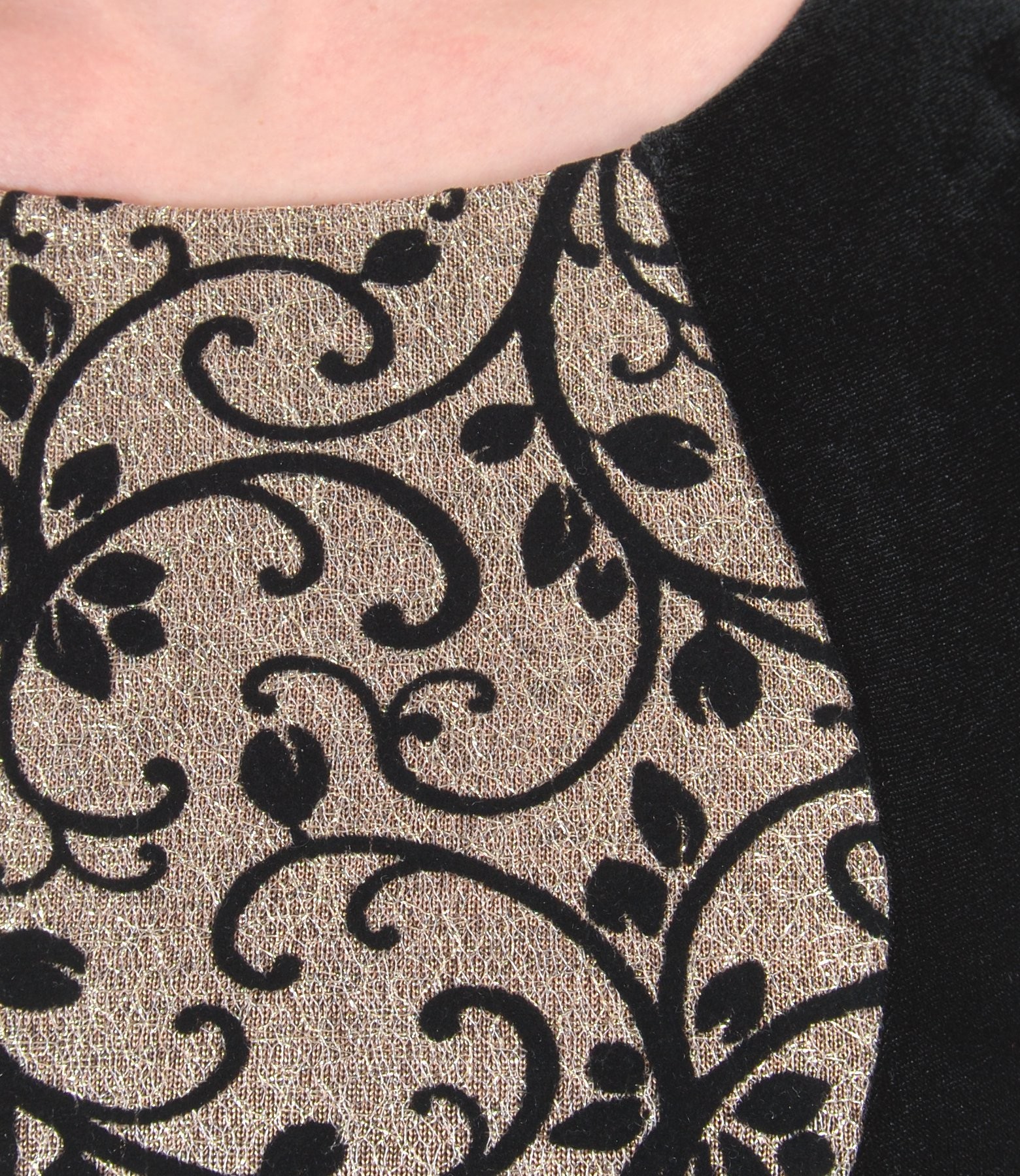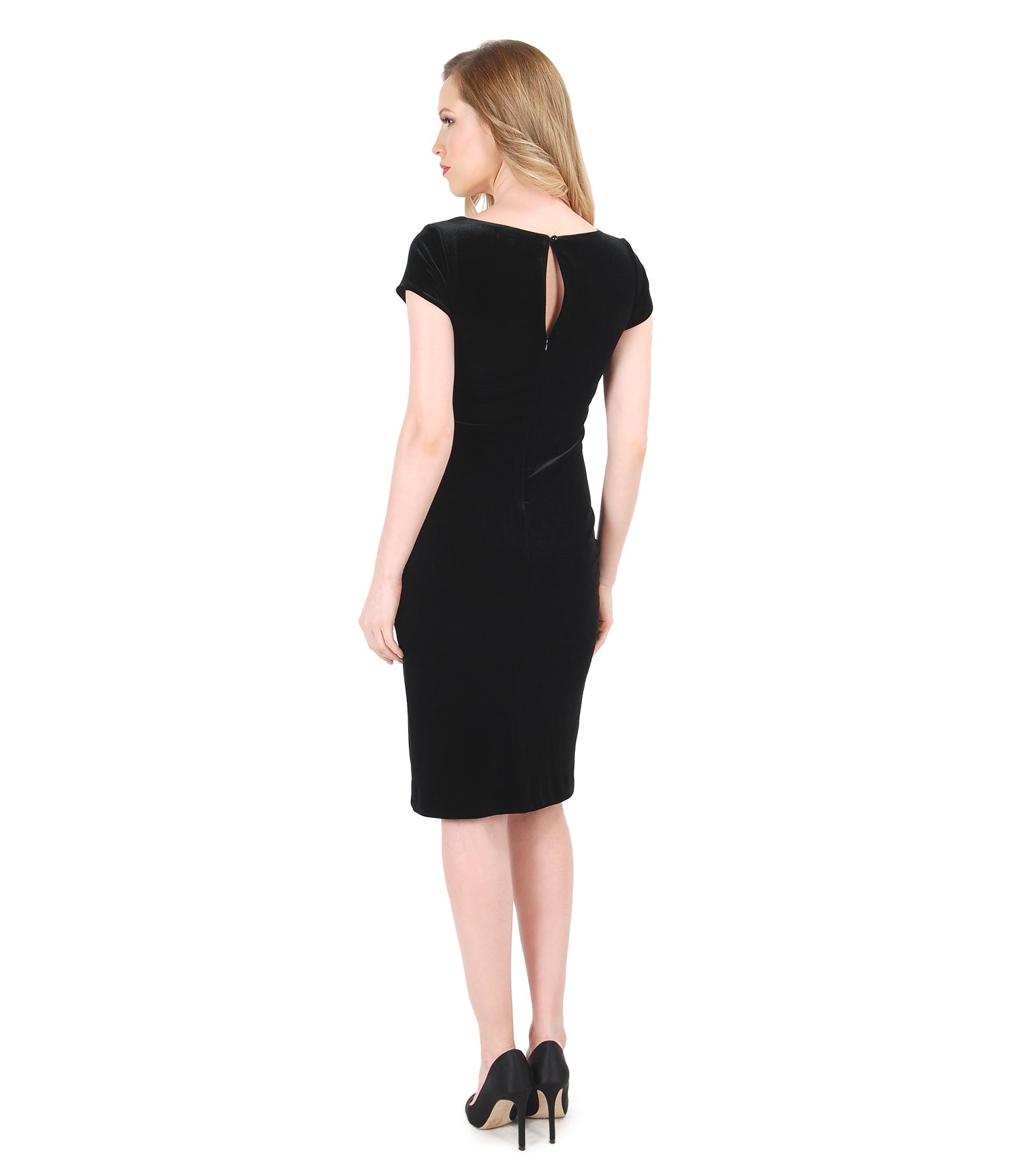 Black elastic velvet dress, with round decolletage and short sleeves. Golden brocade insert with floral velvet motifs on the middle front. Closes with hidden zipper on the middle back.