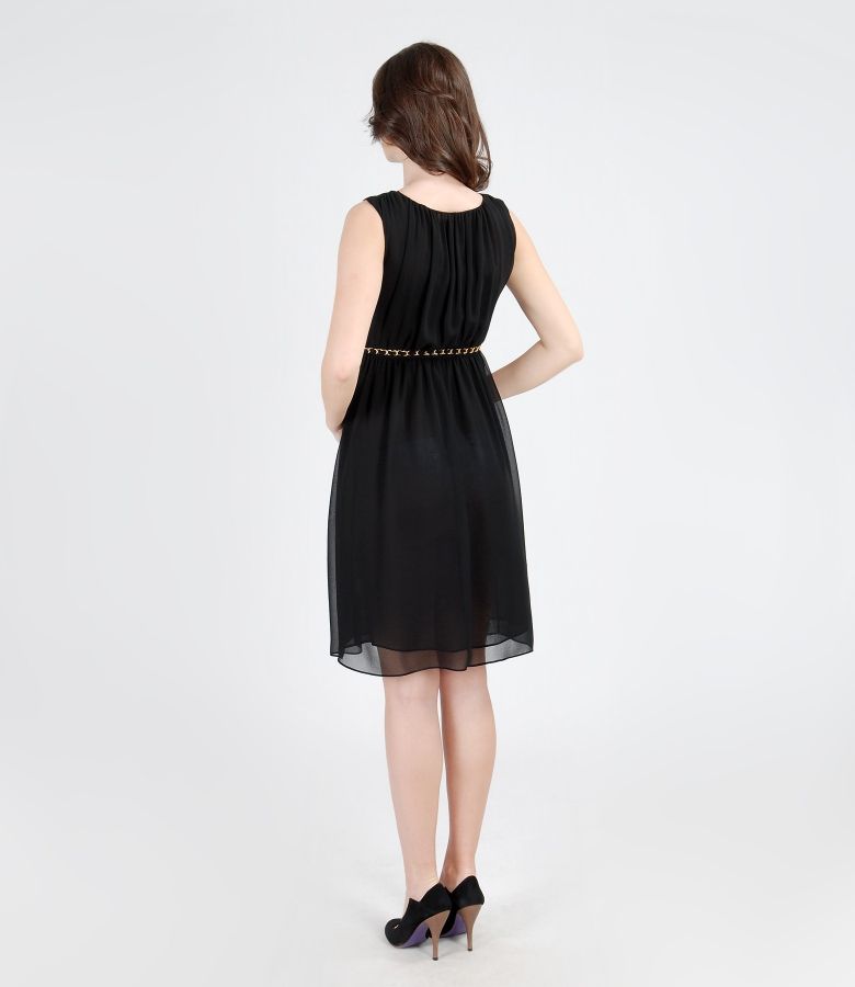 Veil sleeveless dress, doubled, with round neckline and button closed cleavage. Front and back folds and elastic waist. Detachable waist belt. No closing sistem.