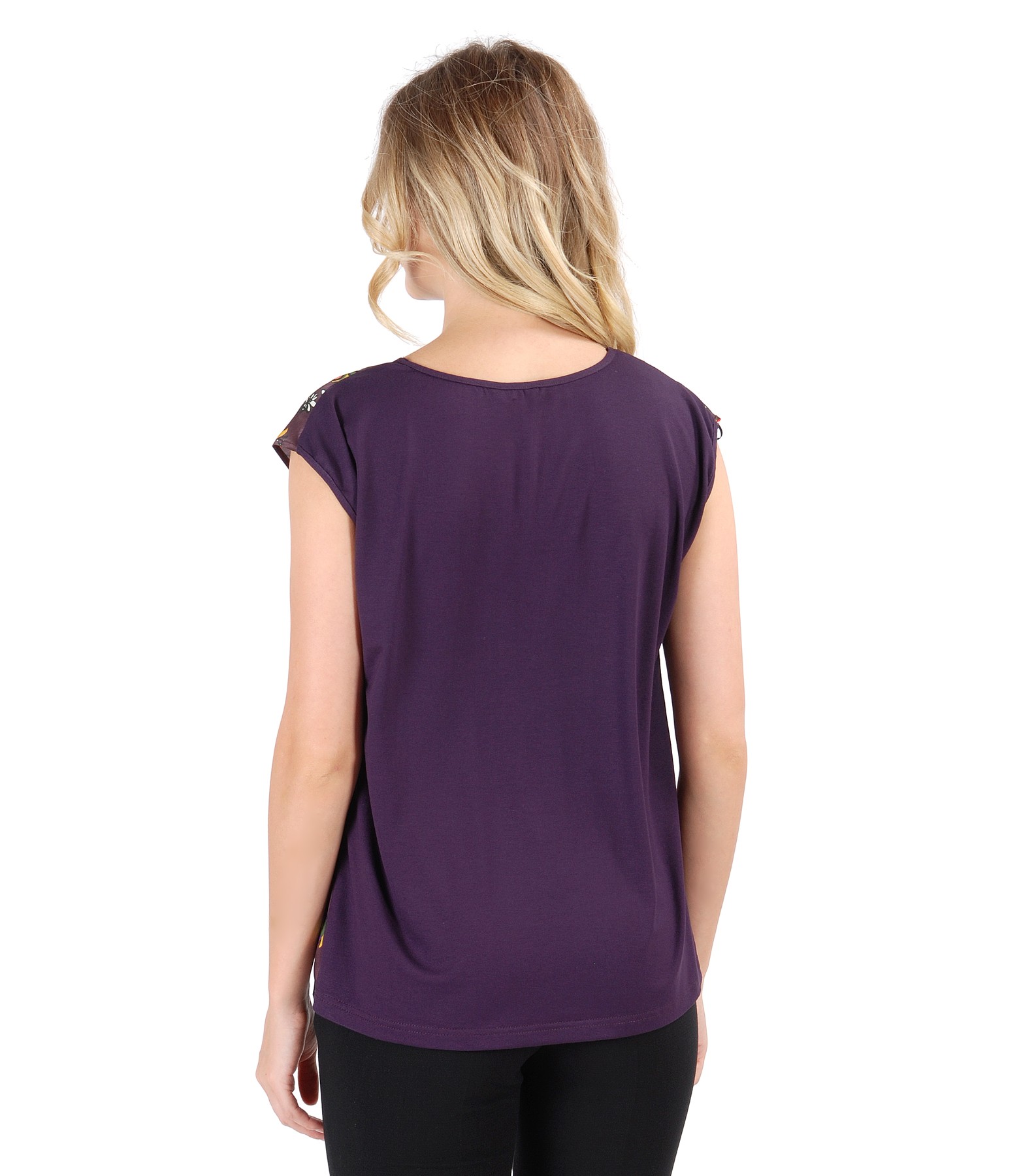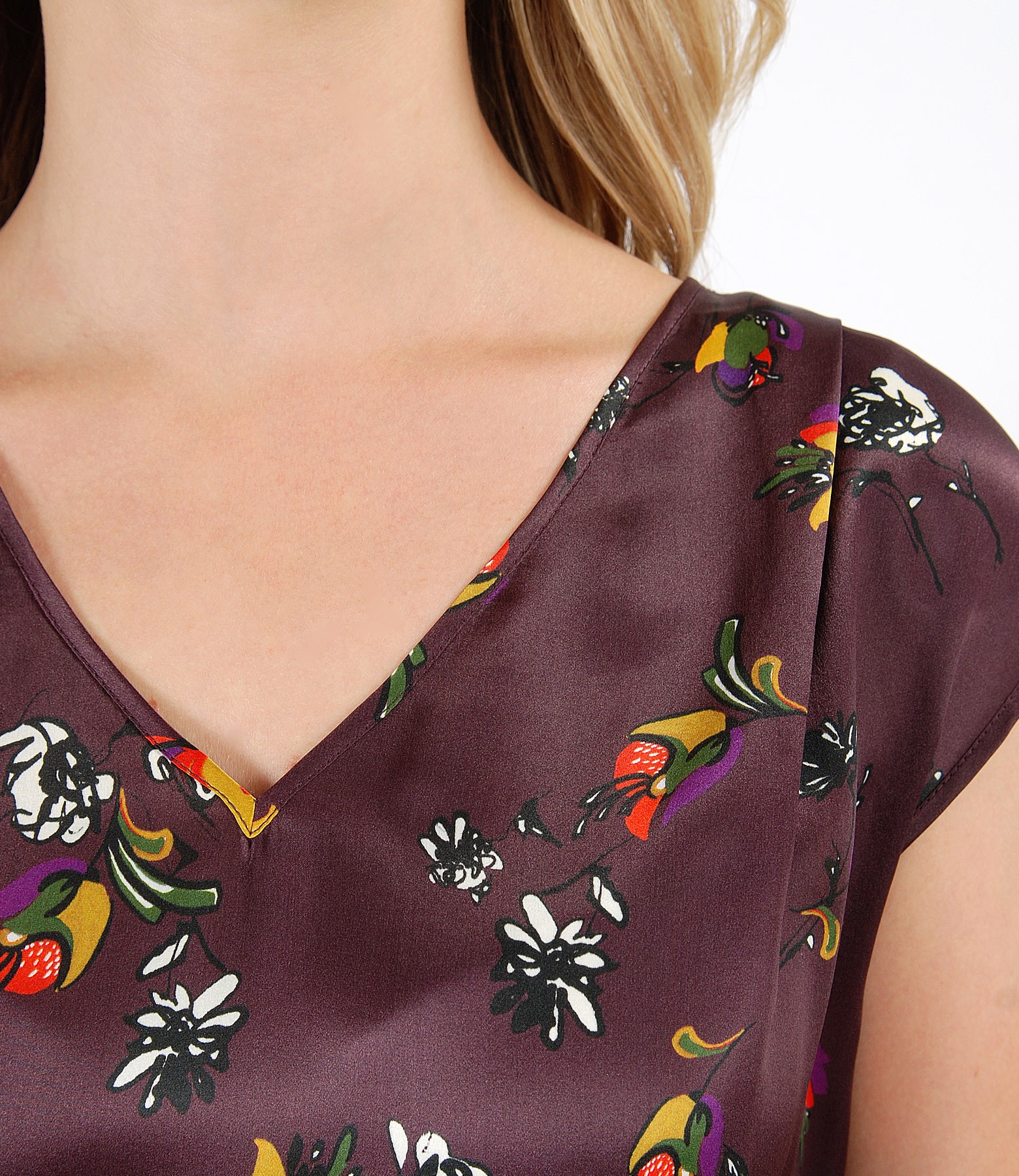 Casual blouse, with front made of silk with digital floral print, back made of uni elastic jersey and V low-cut neck.