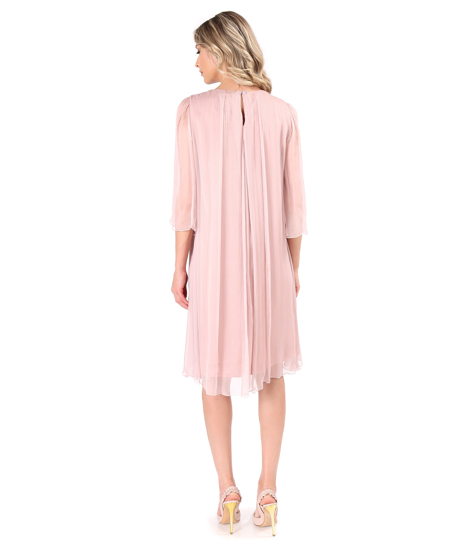 Flaring silk veil dress, doubled with satin, puffed sleeves, embellished with crystals on the round low-cut neck. Closes with a back button.