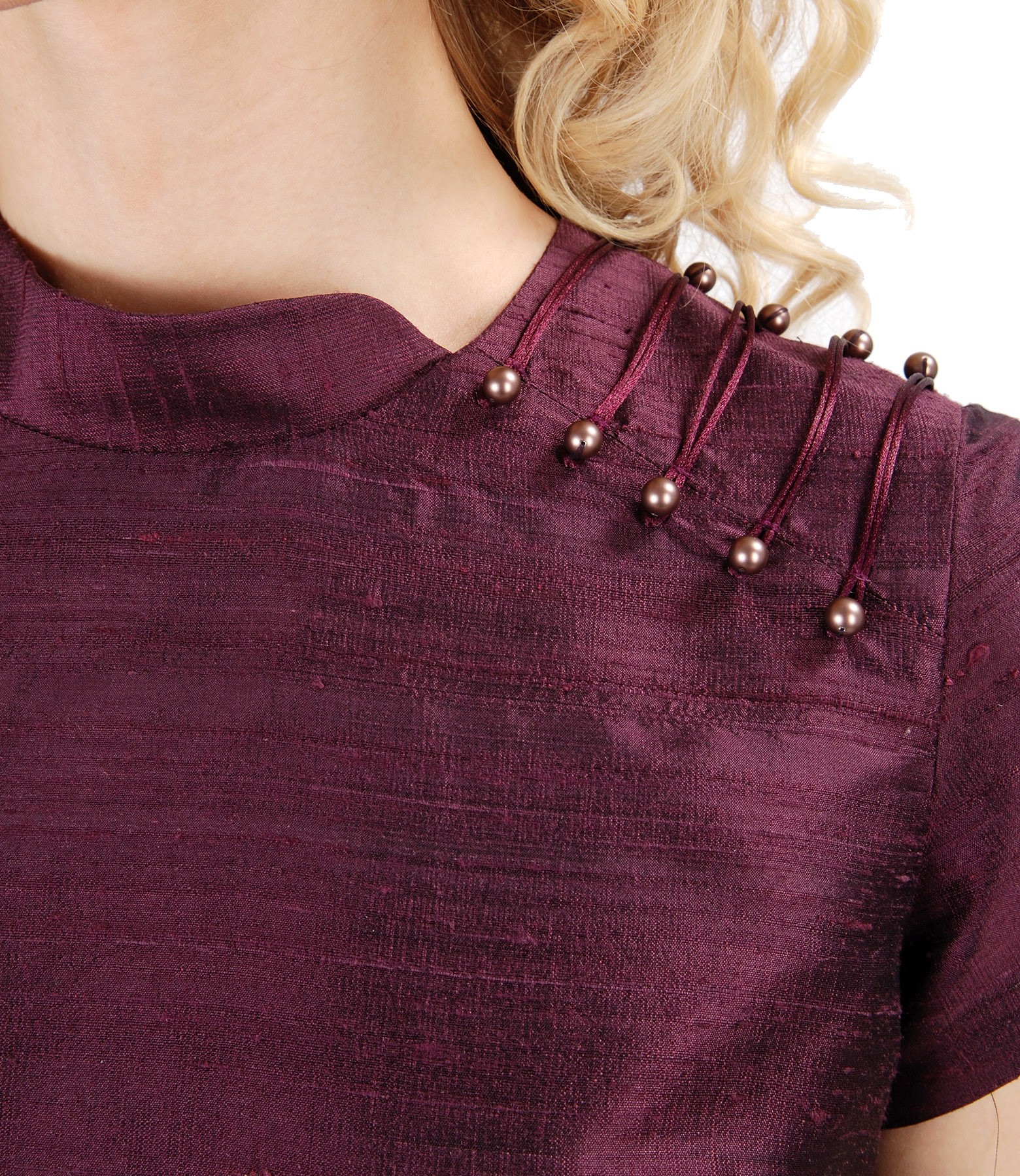 Evening dress made of silk taffeta, with tunic collar, embellished with crystals on the left shoulder. Closes with hidden zipper on the left.