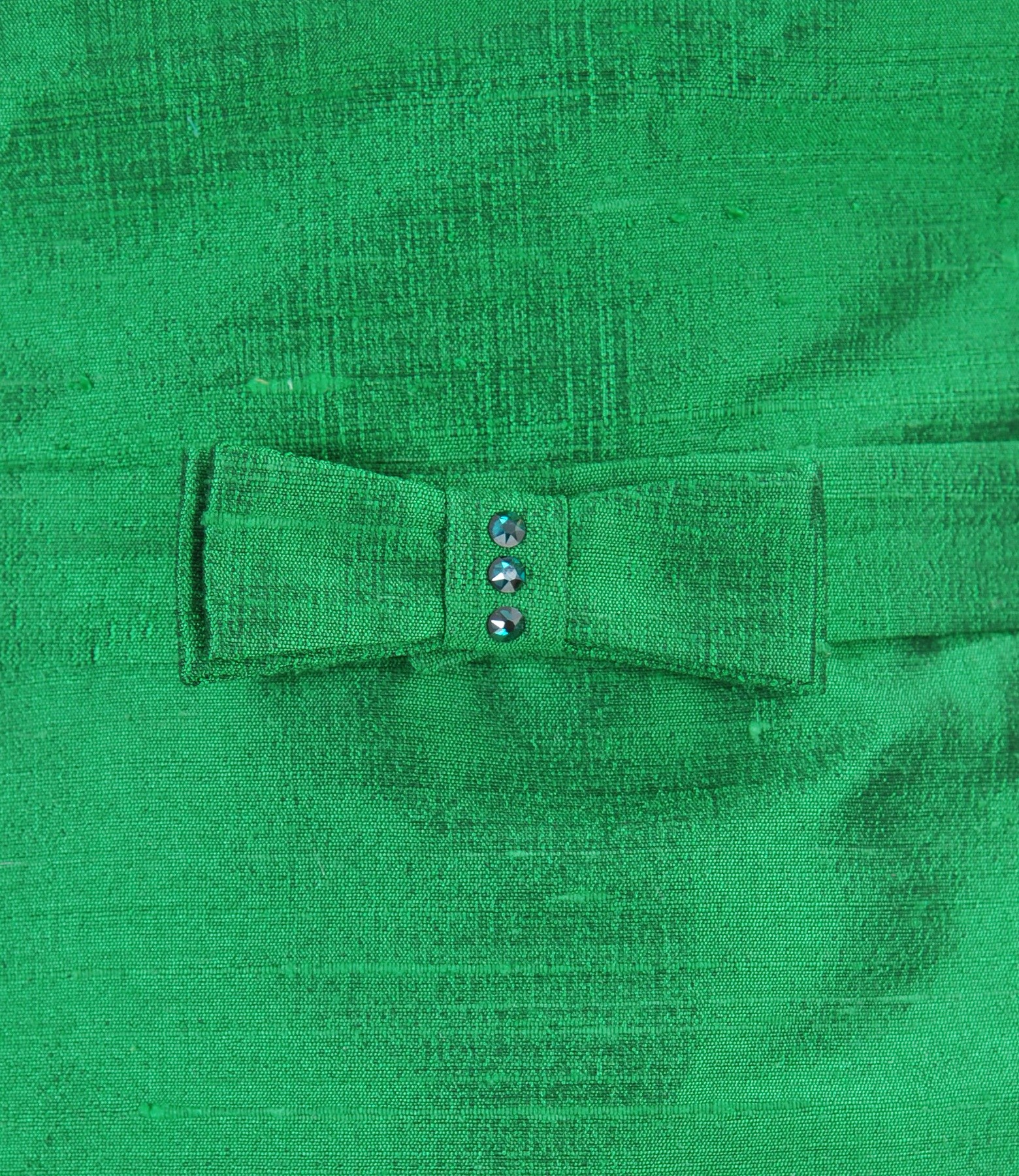 Silk taffeta short evening dress, without sleeves, with V low-cut neck. Tightens the waist with a removable belt embellished with crystals. Closes with hidden zipper on the middle back.