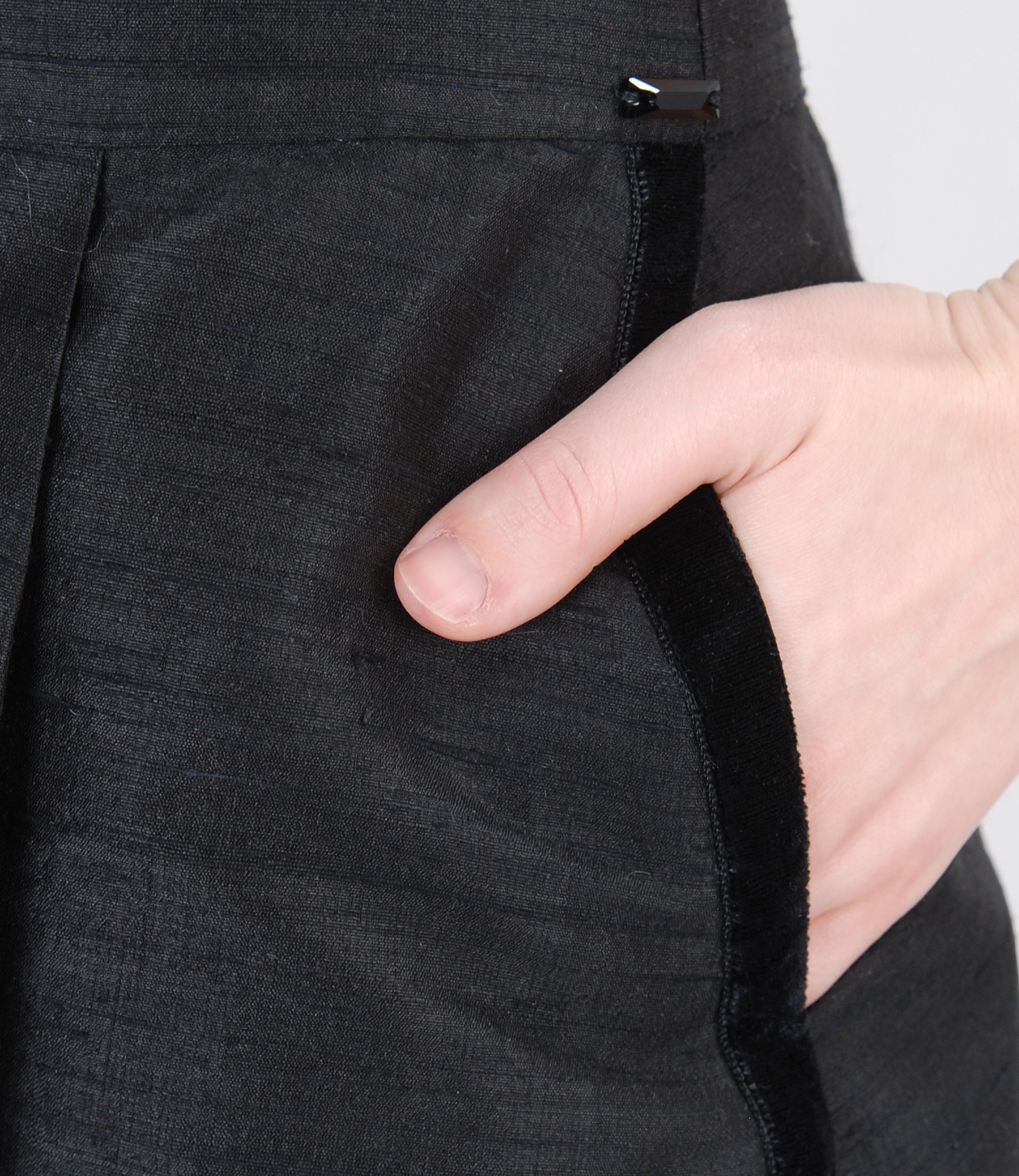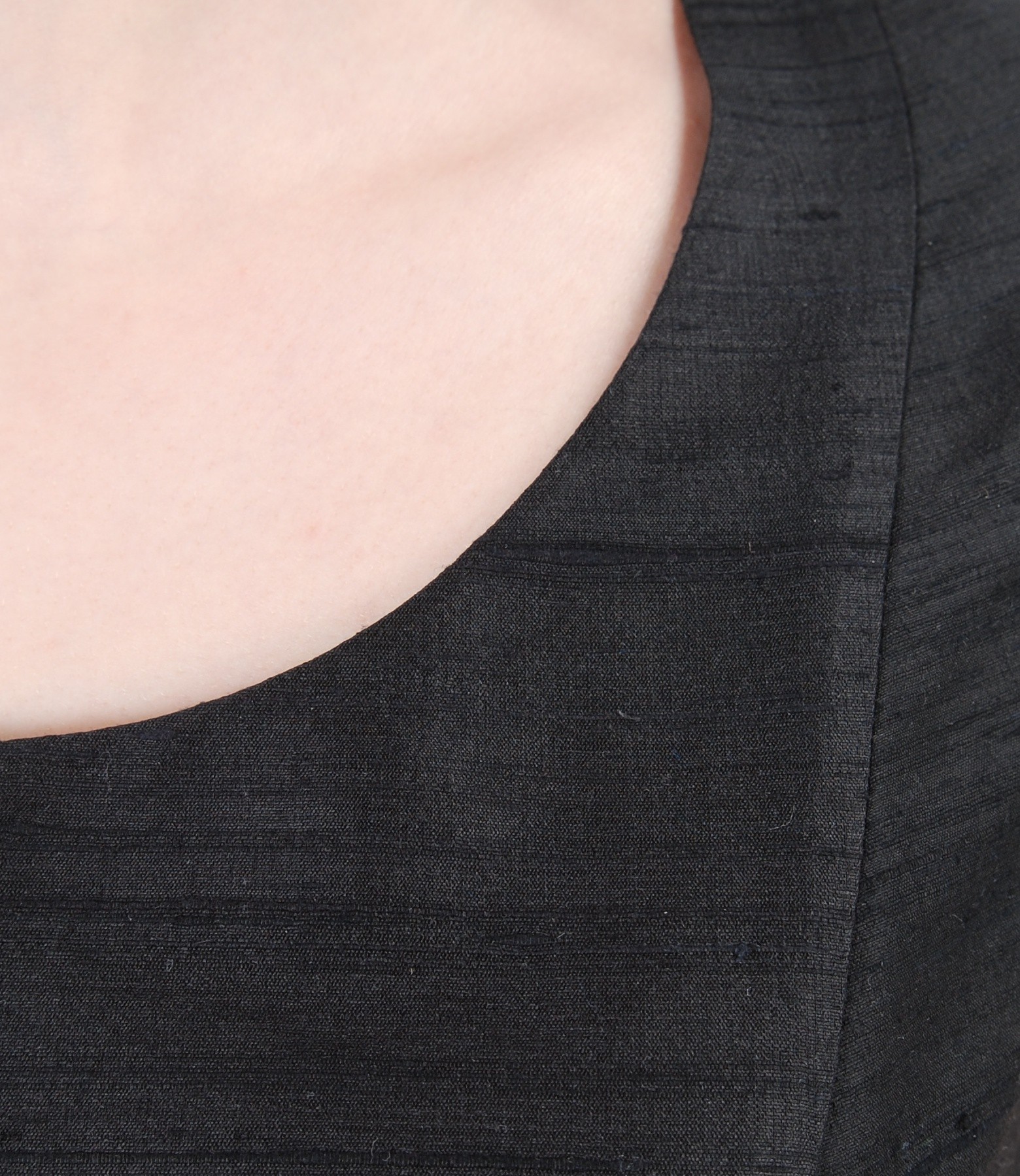 Silk taffeta flaring short evening dress, with rond low-cut neck and hidden side pockets embellished with crystals. Closes with hidden zipper on the middle back.