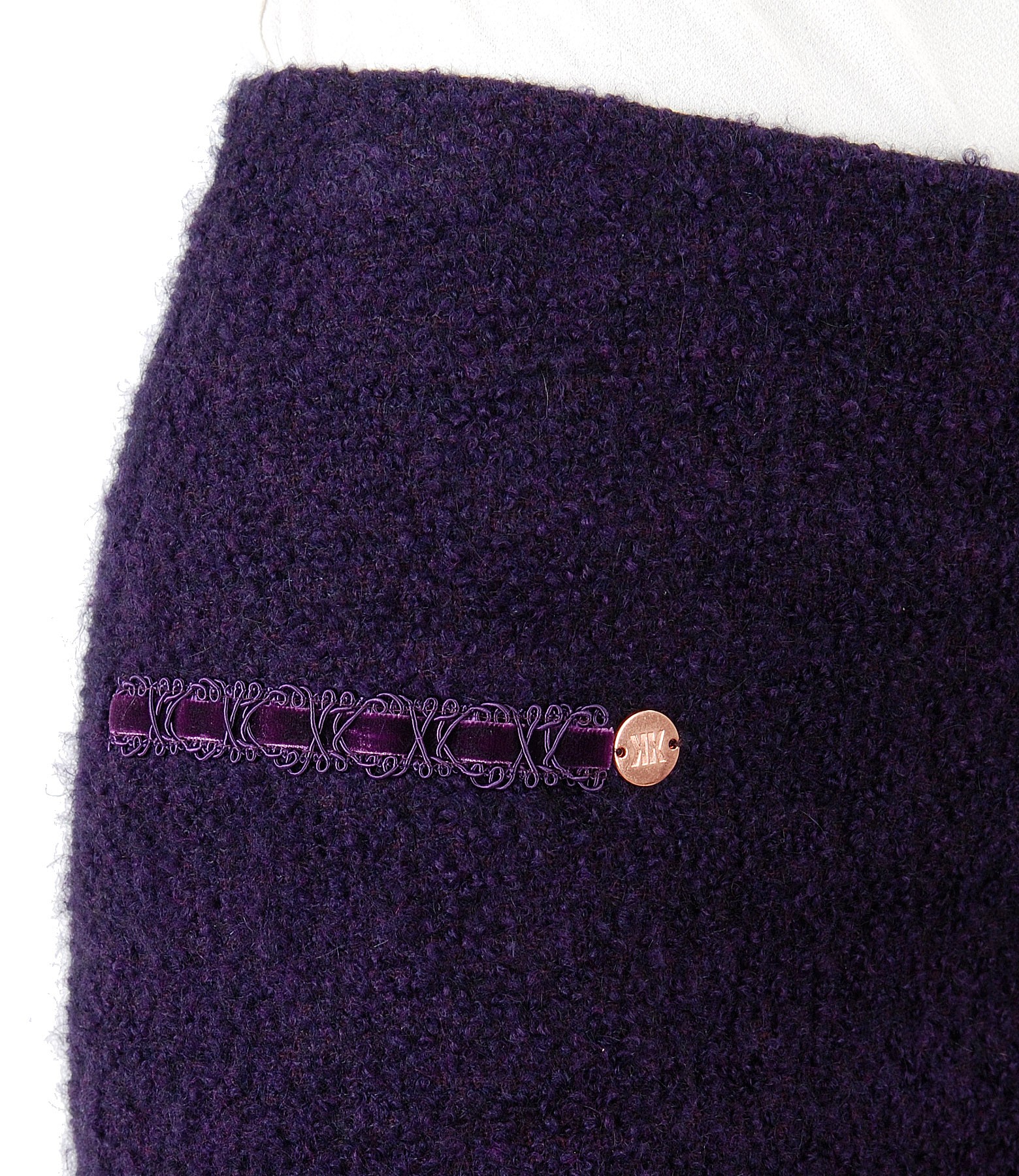 Skirt from wool and alpaca loops, lined, with velvet trim. Middle-back concealed zip fastening.