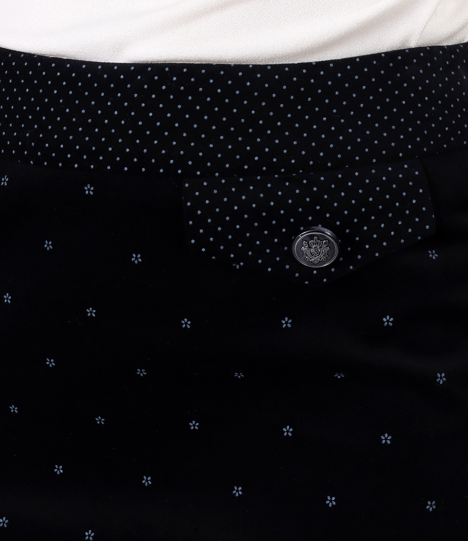 Velvet cotton skirt, with floral print, padded, with wide waist belt made of velvet printed with lace corner and flap with front button.It closes with a hidden zipper on the middle back.
