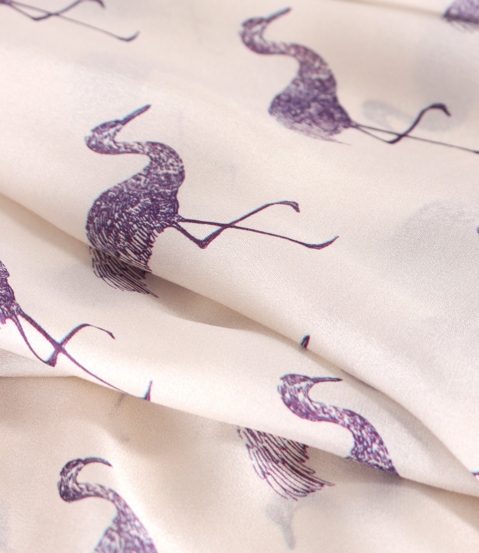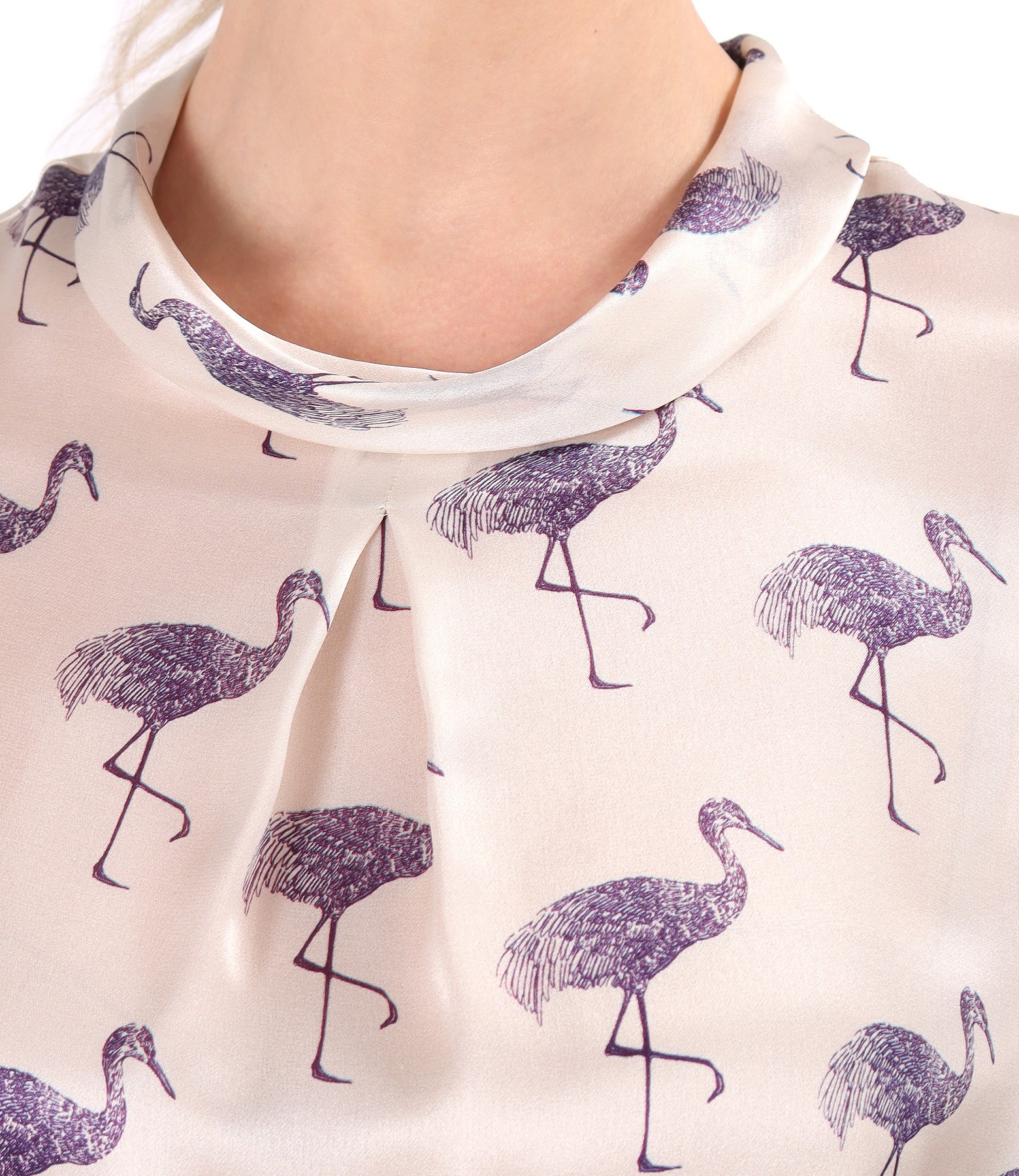 Natural silk blouse printed with flamingos and slightly transparent, short sleeves, with a pleat in the middle of the front and a round neckline. It closes with a button on the middle back. The position of the print varies per product.