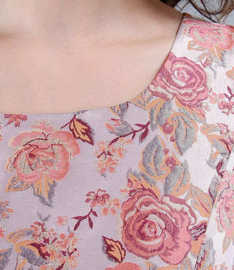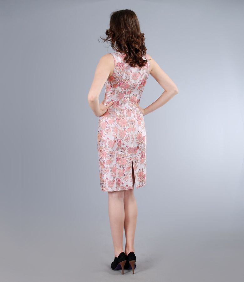 Elegant brocade dress with flower print, with round neckline, without sleeves. Middle back concealed zip-fastening.