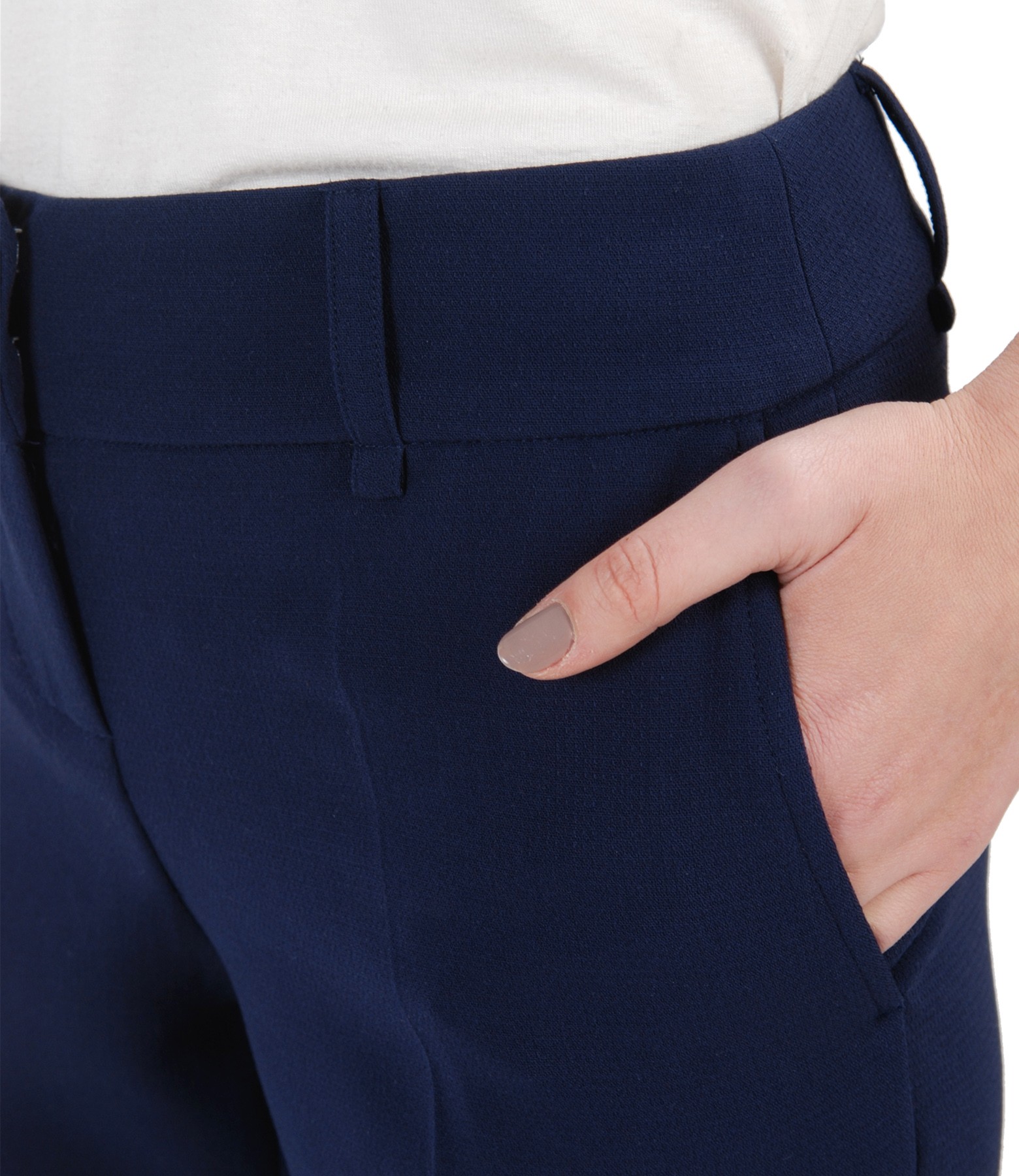 Straight pants made of elastic fabric, with front stripe, waist belt and oblique side pockets. Closes with normal zipper, button and 2 front staples.