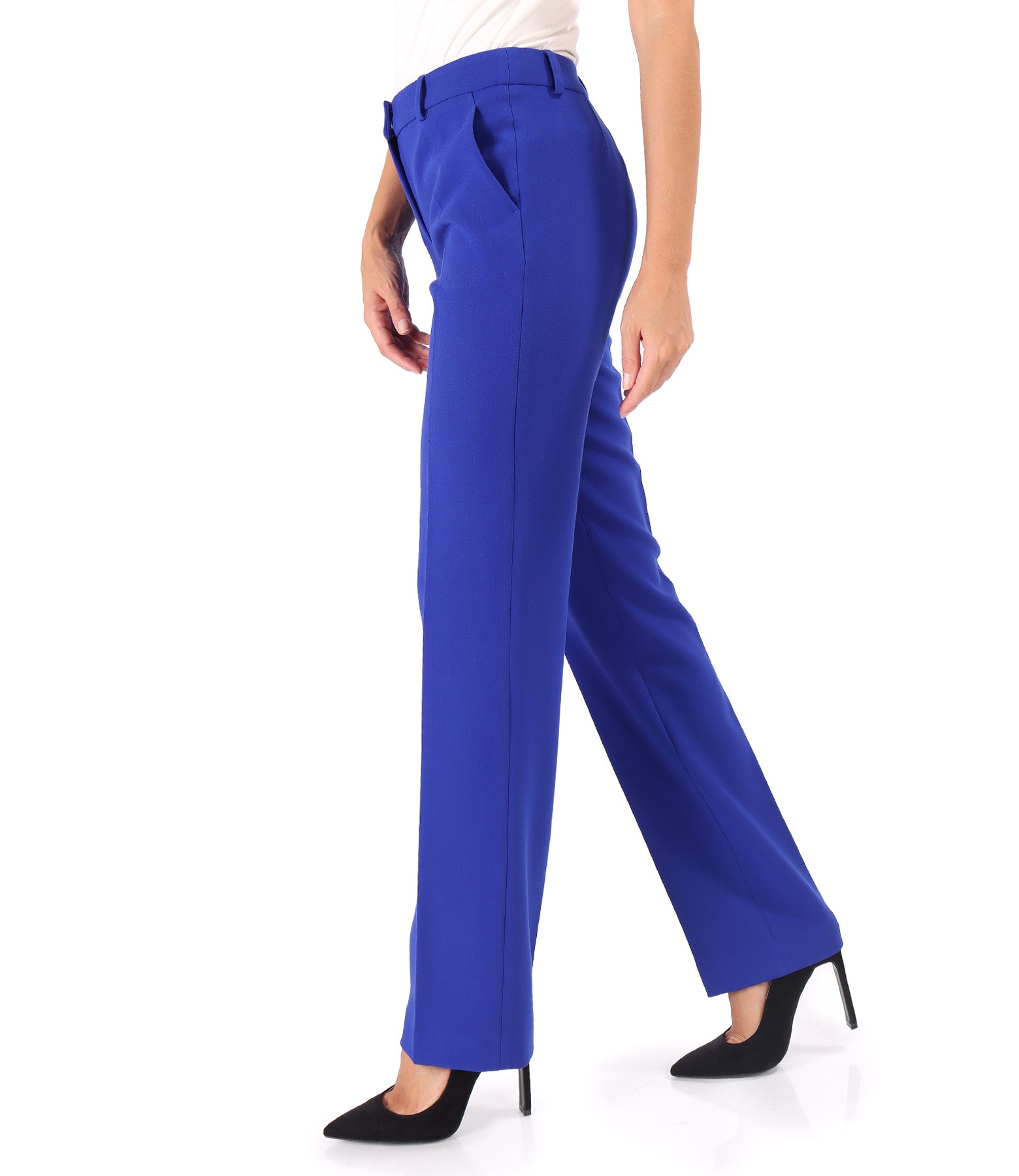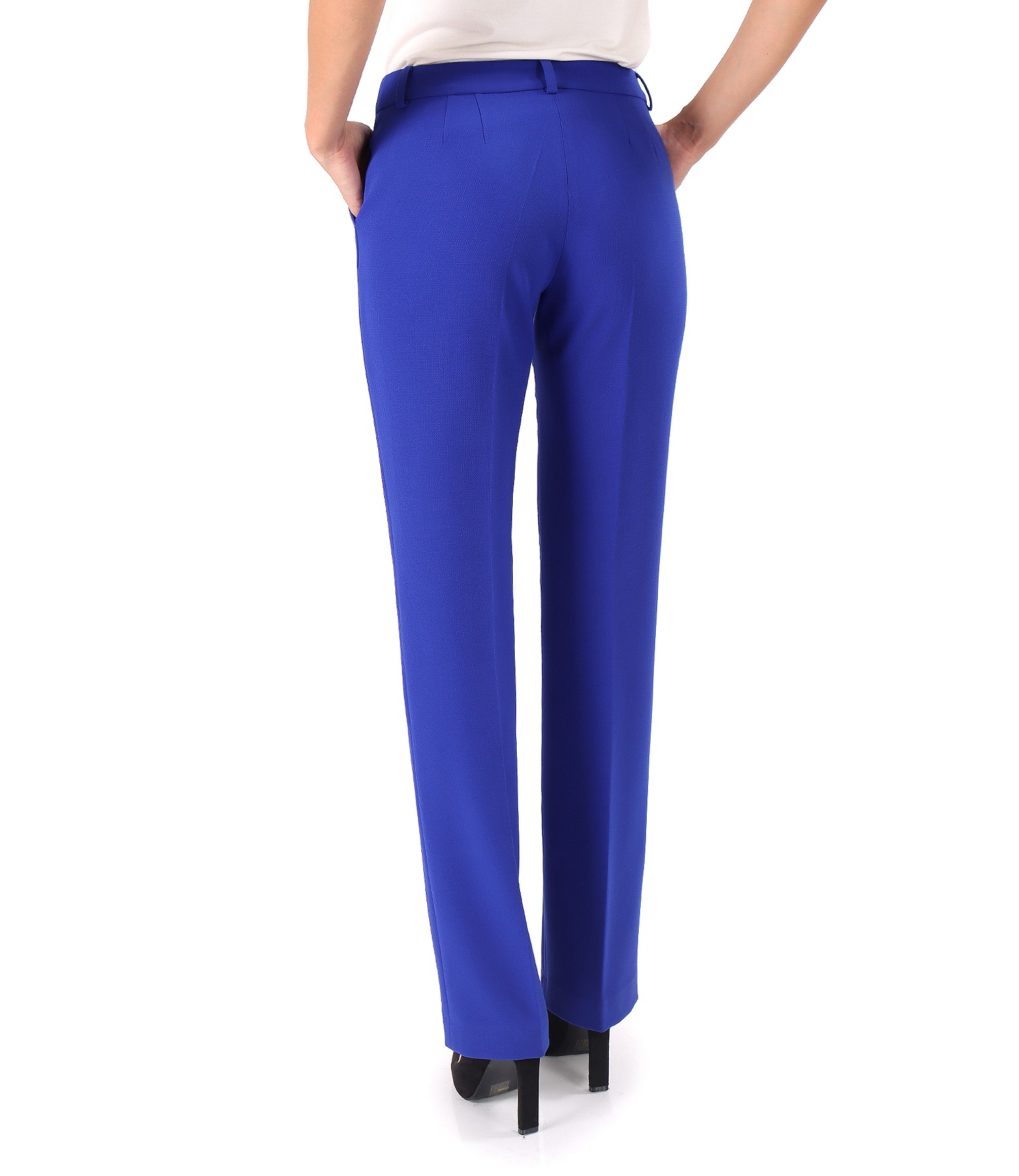 Straight pants made of elastic fabric, with front stripe and oblique side pockets. Closes with normal zipper, a button and 2 front staples.