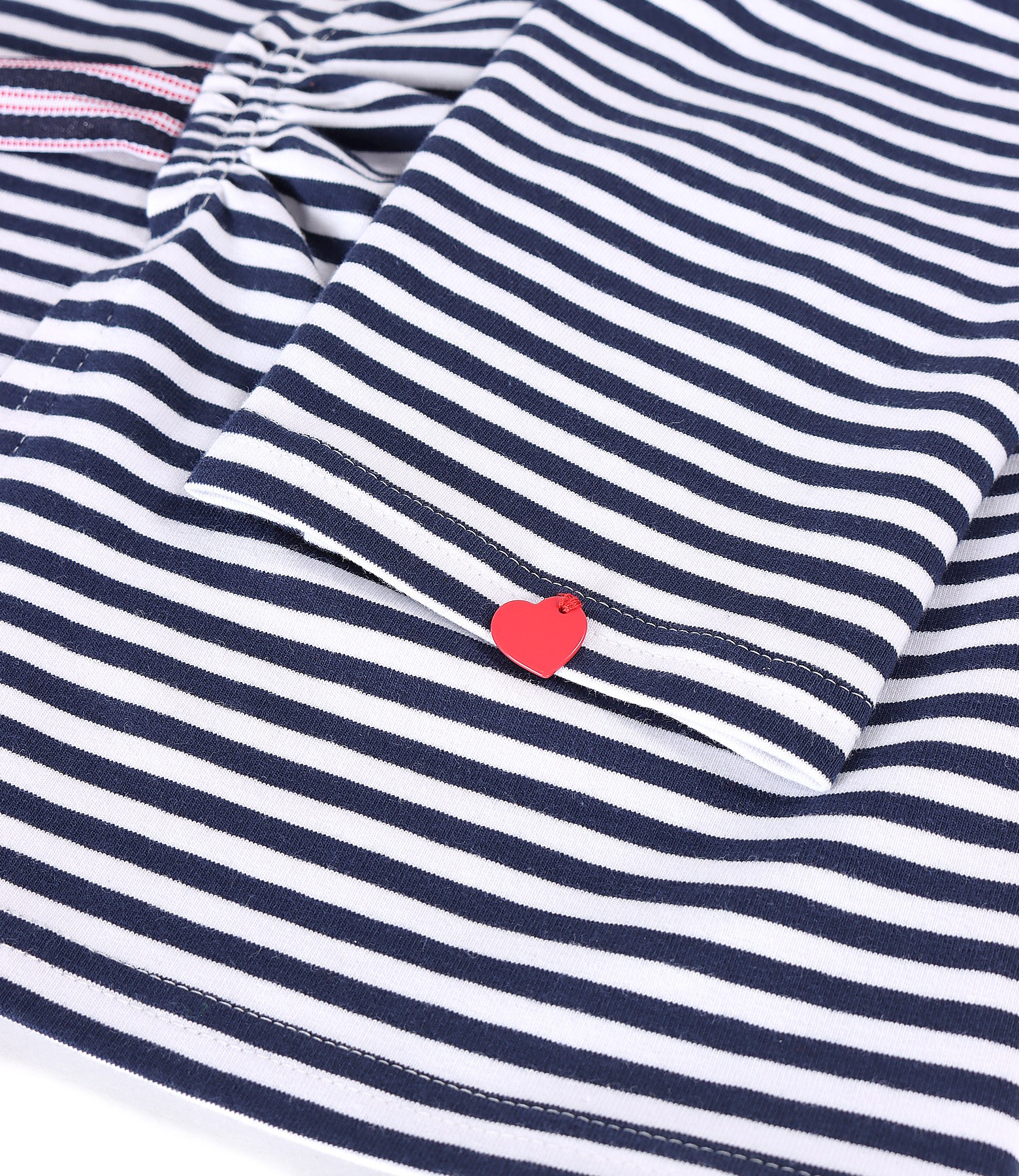 Striped printed jersey blouse, open at the front and wrinkled at the waist. With sleeve decorated with a metal heart. It is tied with a rips cord in front.