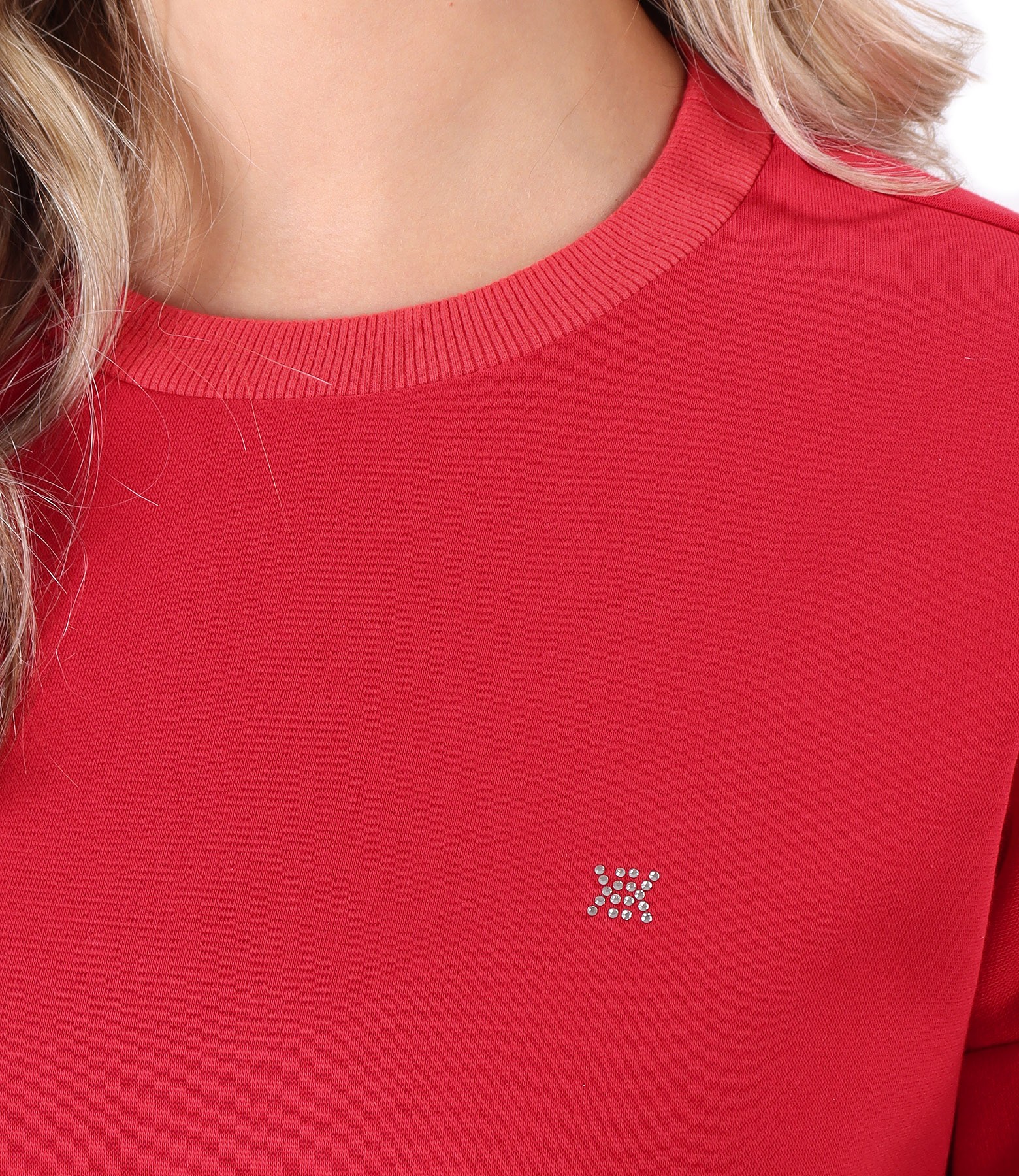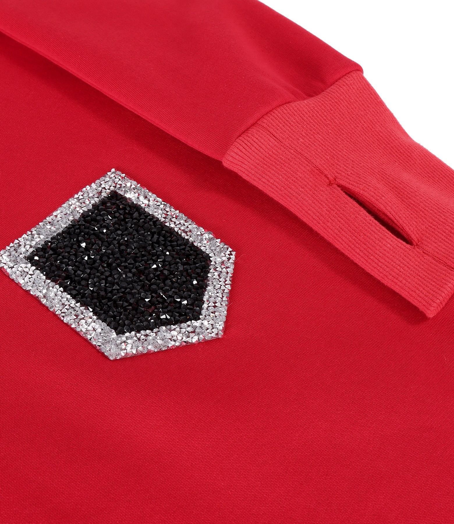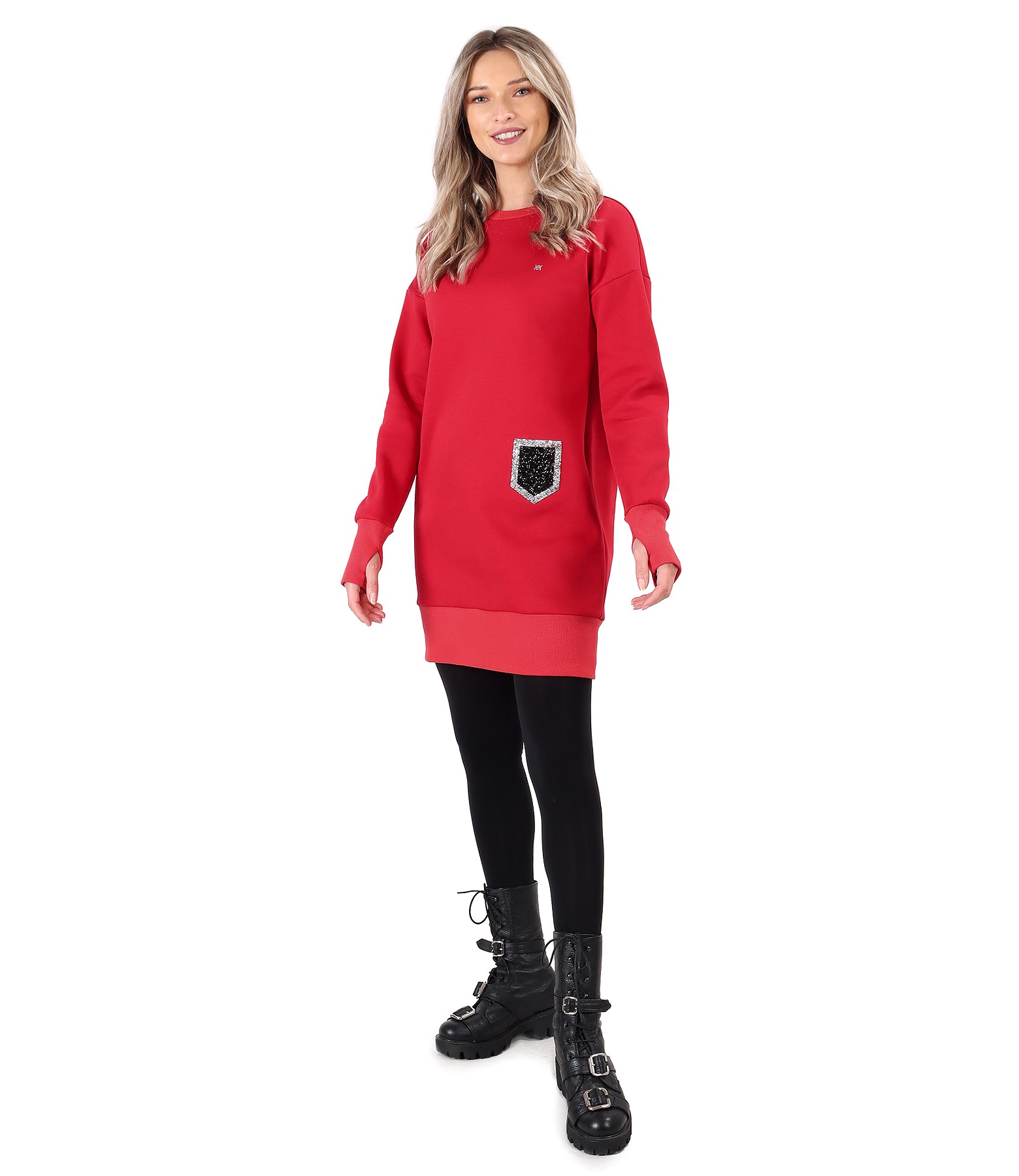 Sweatshirt dress made of thick cotton, with long sleeves, round decolletage and decorative pocket on the front.