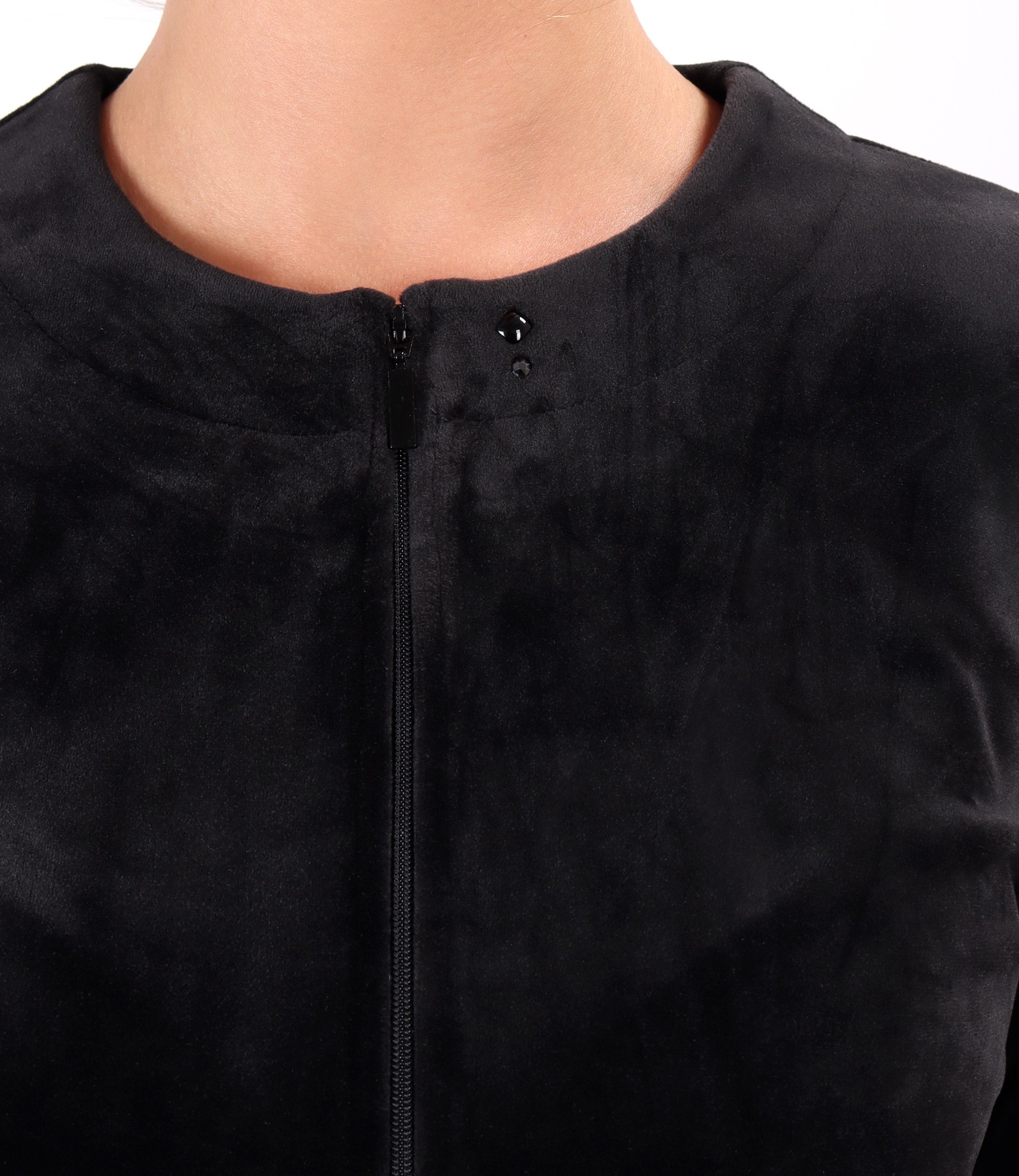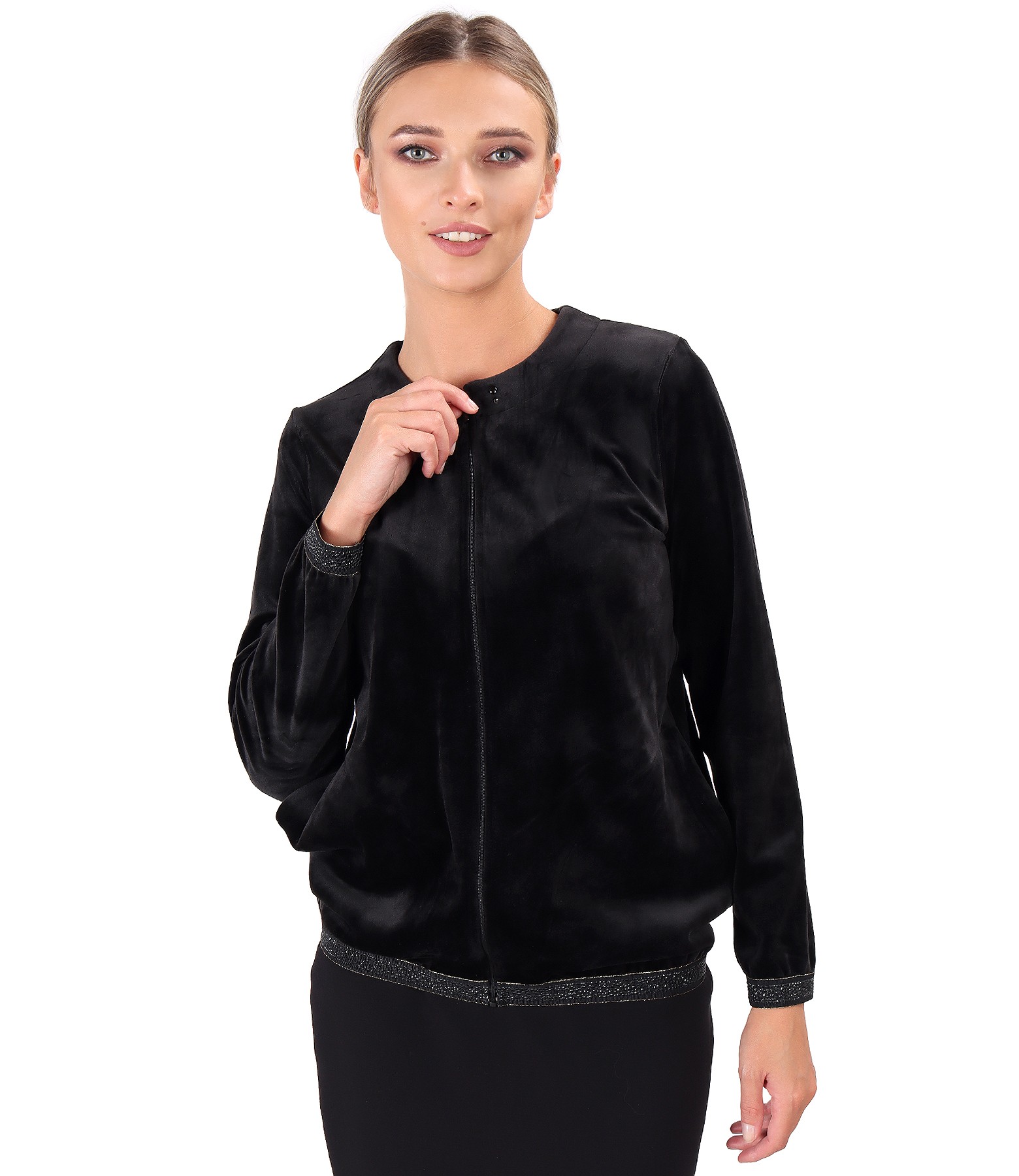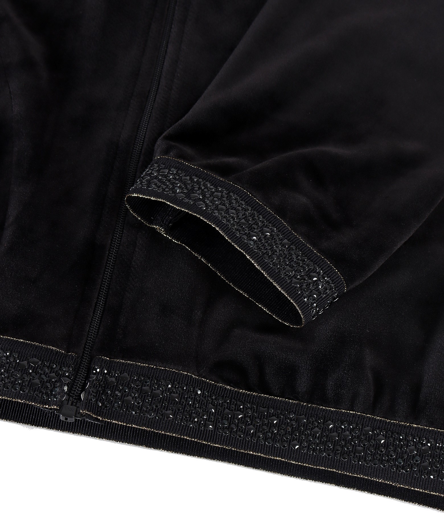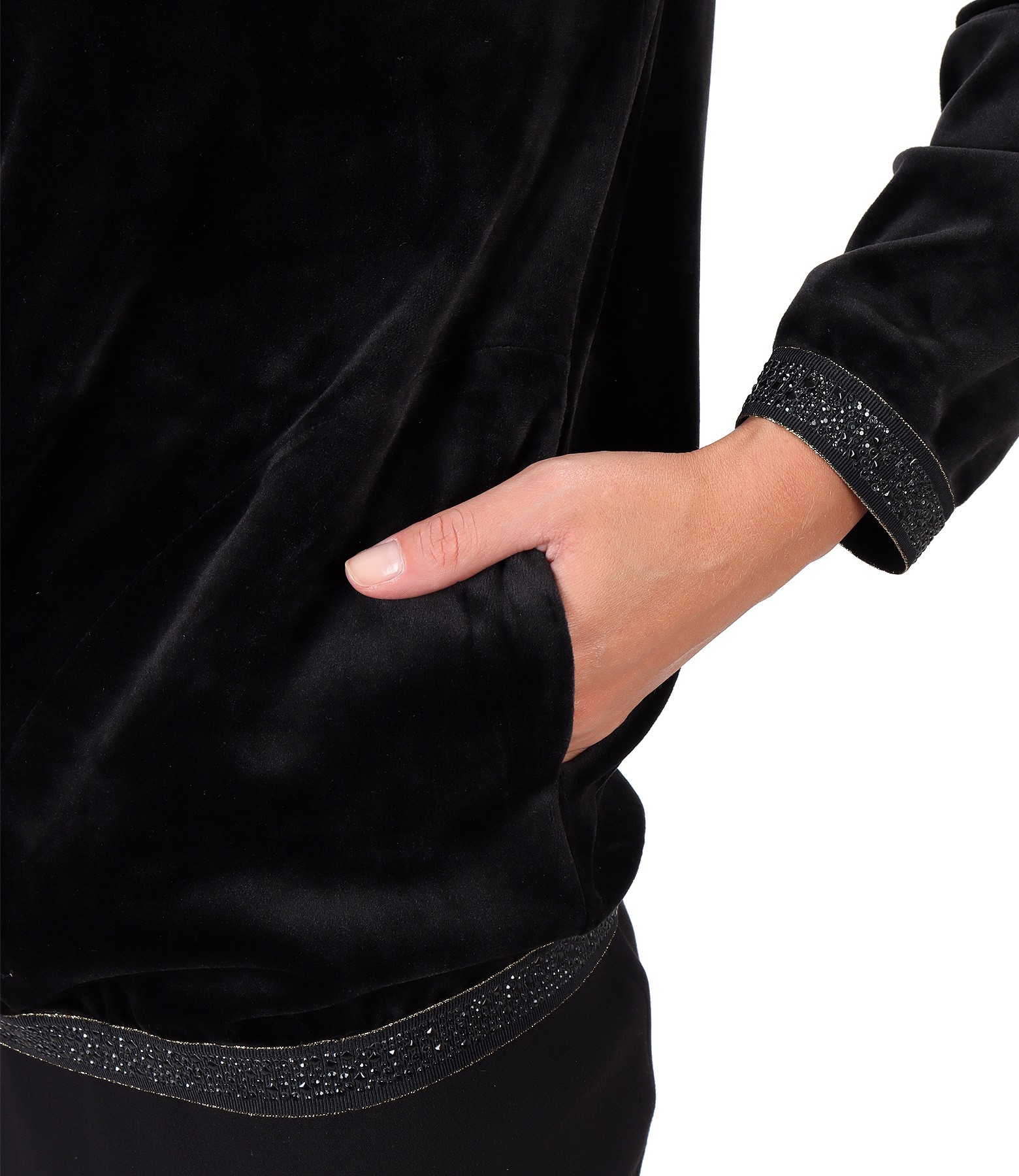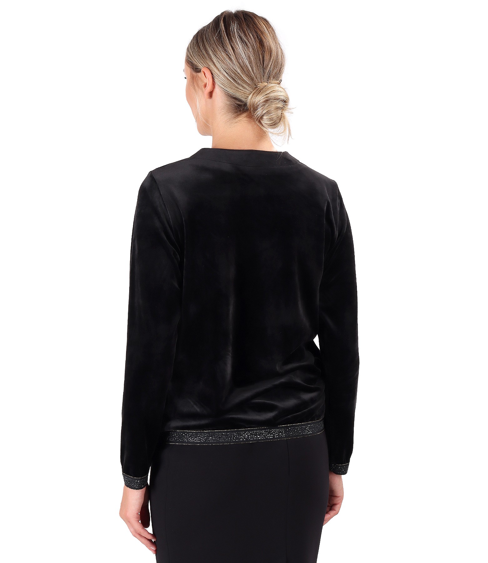 Sweatshirt made of elastic velvet printed with gold motifs, unlined, with long sleeves, embellished with crystals. on the decolletage. Closes with a zipper in the middle of the front.