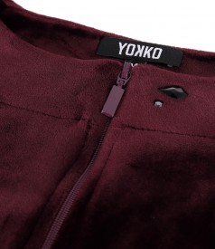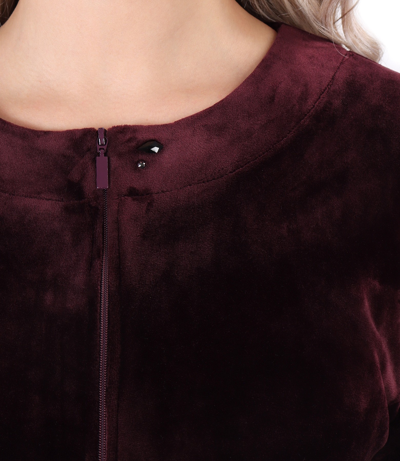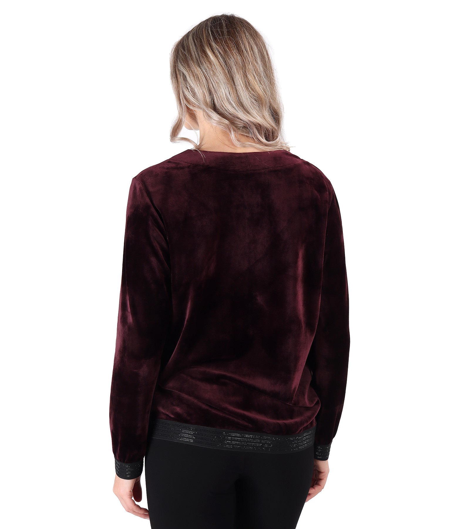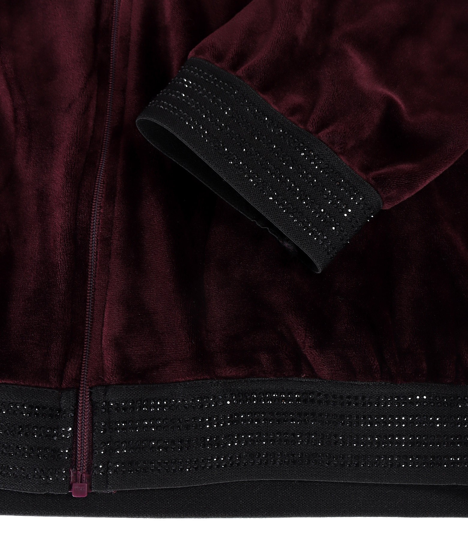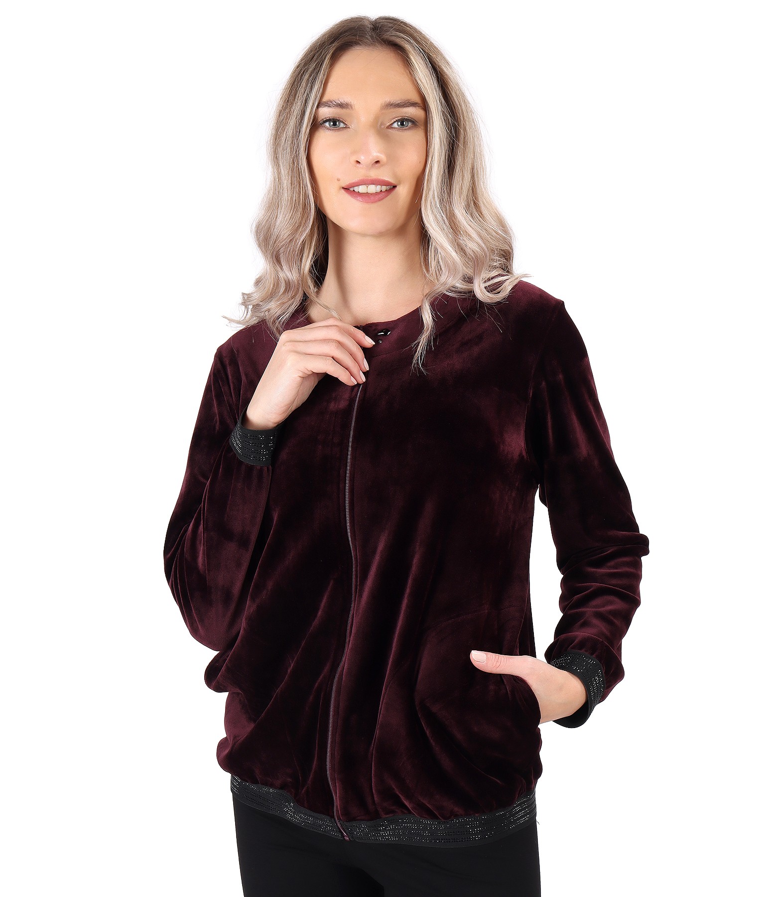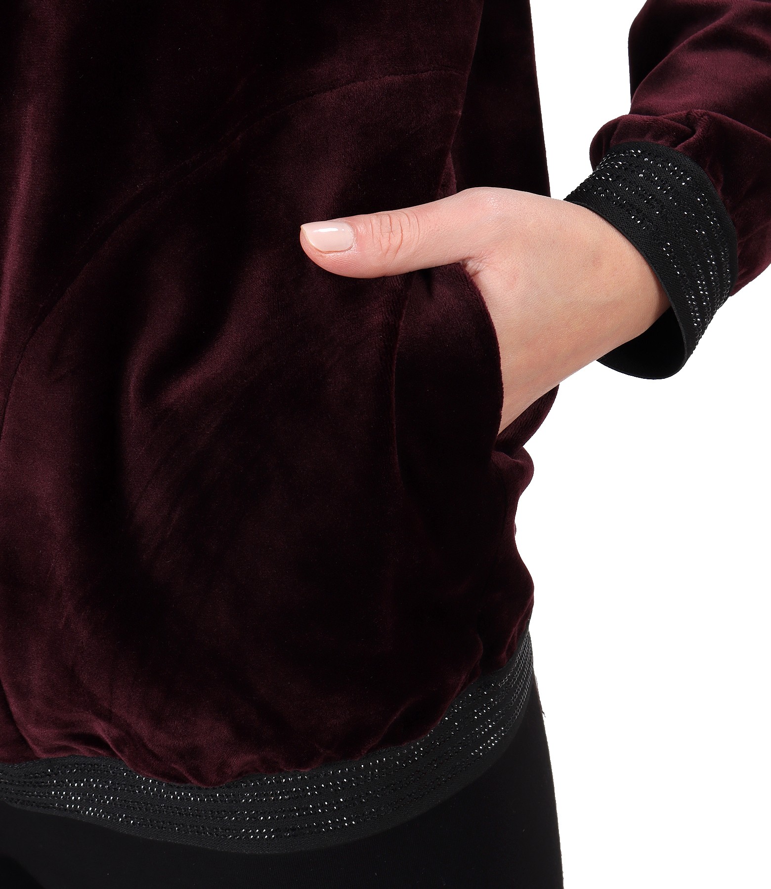 Sweatshirt without hood made of elastic velvet, unlined, with long sleeves, embellished with crystals. at the decolletage. Closes with a zipper in the middle of the front.