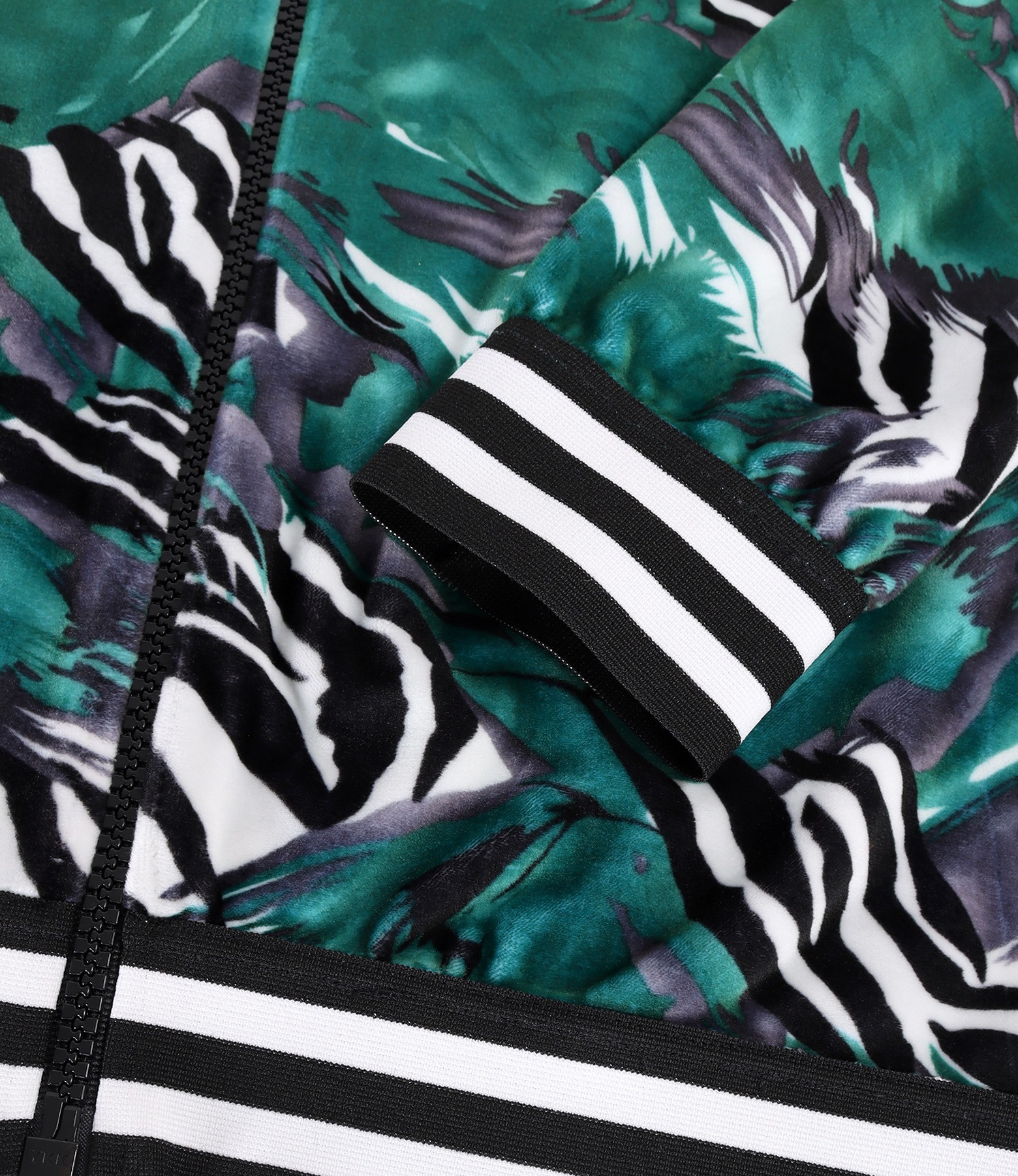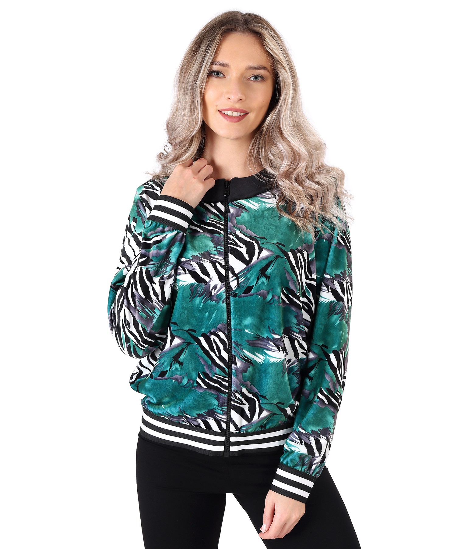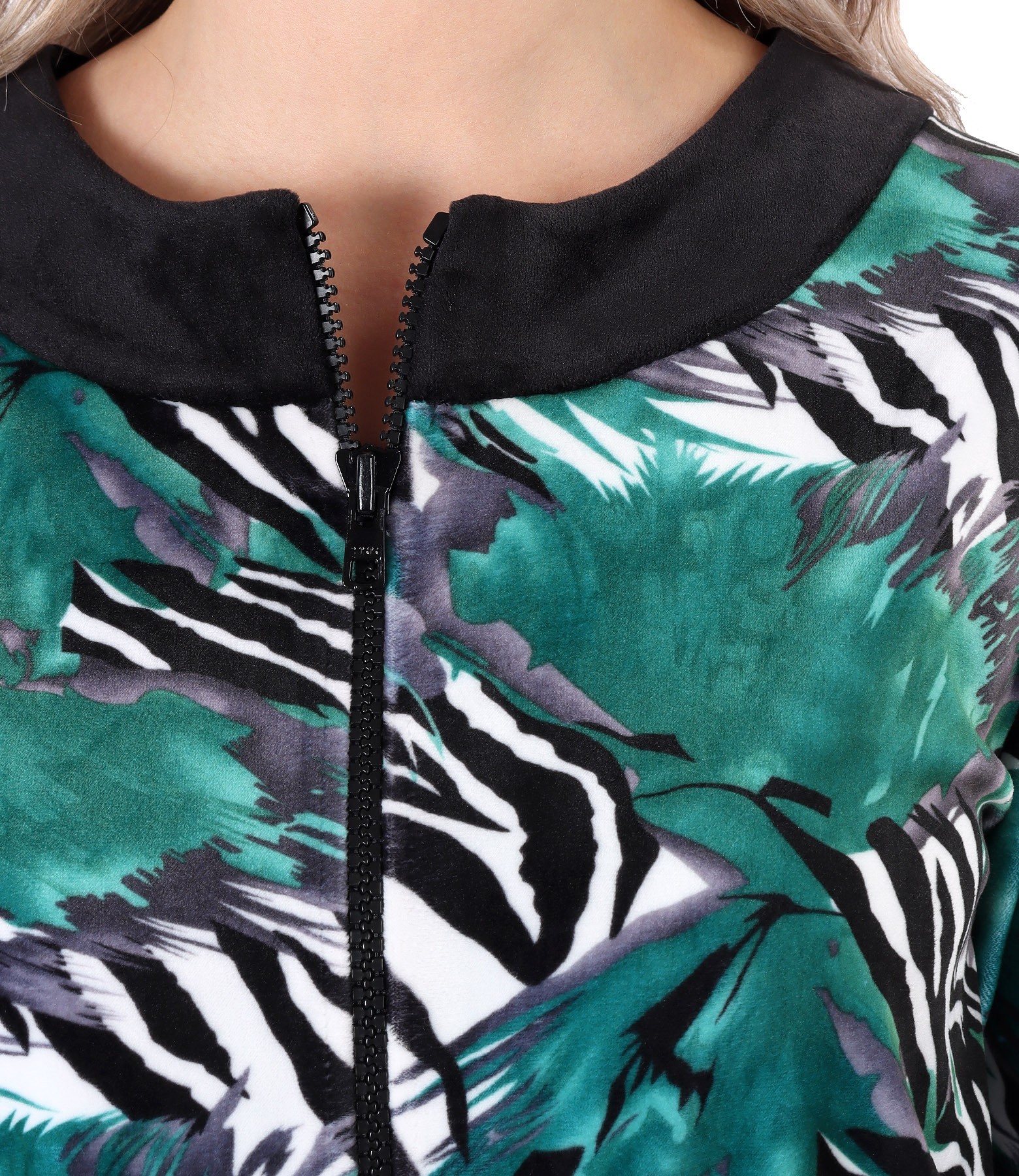 Sweatshirt without hood made of printed elastic velvet, unlined, with long sleeves and elastic at the ends. Closes with a zipper in the middle of the front.
