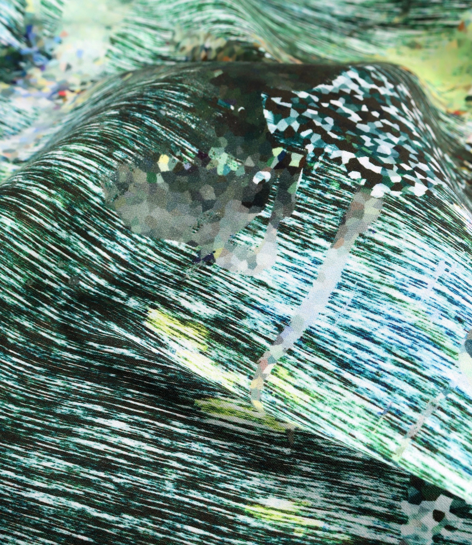 Tapered dress made of digitally printed elastic cotton, unlined, with a round neckline, short sleeves, and a slit in the middle of the back. It closes with a hidden zipper in the middle of the back.