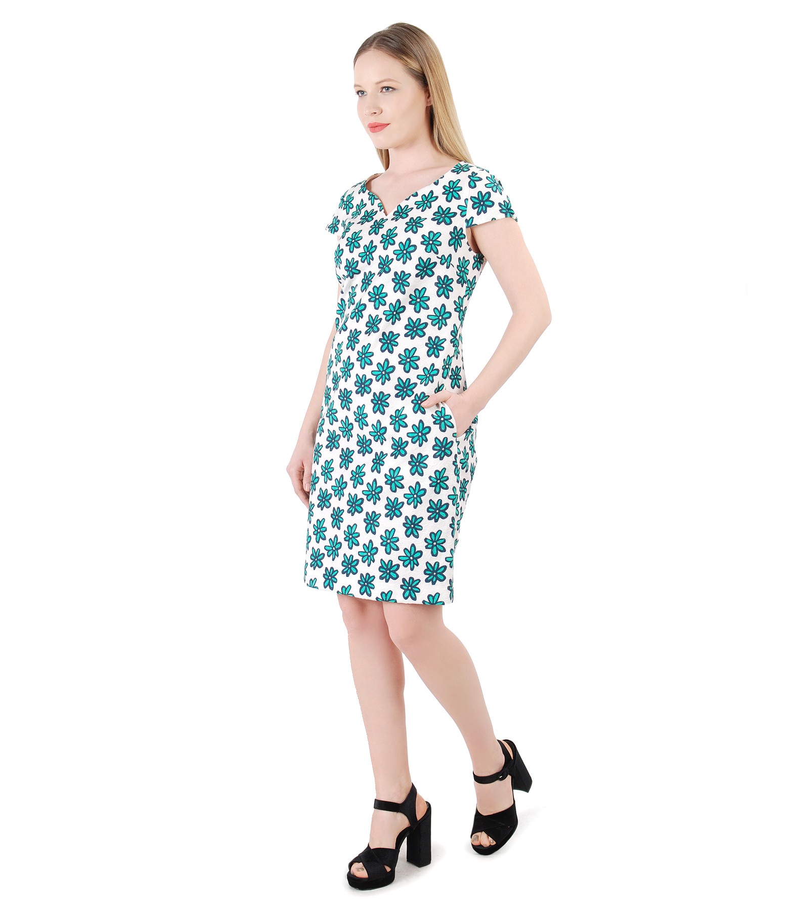 Dress made of elastic cotton brocade , with digital print with floral motifs, unlined , with side pockets and short sleeves. Have no closing system.