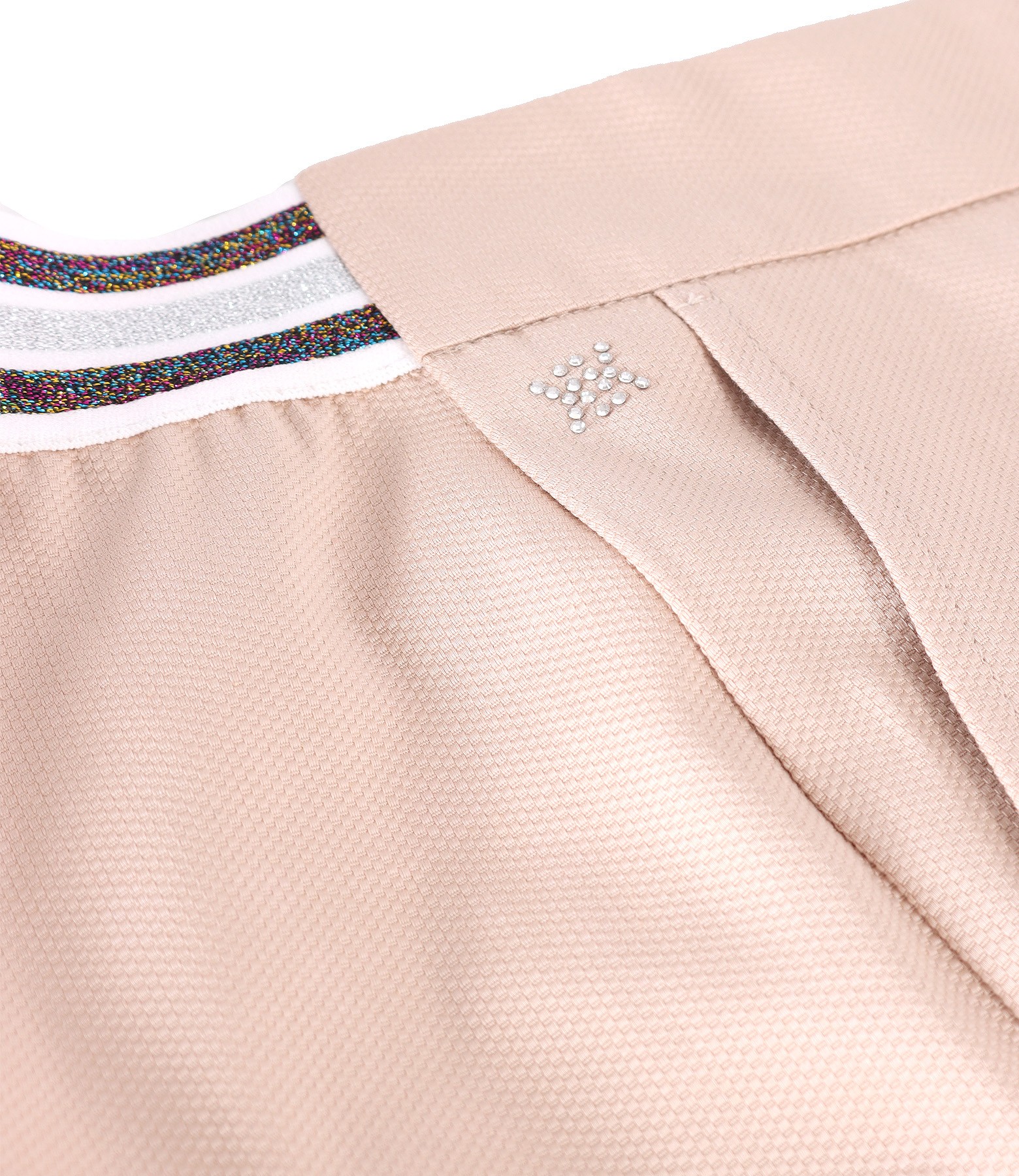 Textured cotton pants, with front pockets, cuffs at the end, and multicolored elastic with metallic thread at the waist. They close with a normal zipper, counter-button, and 2 staples on the face.