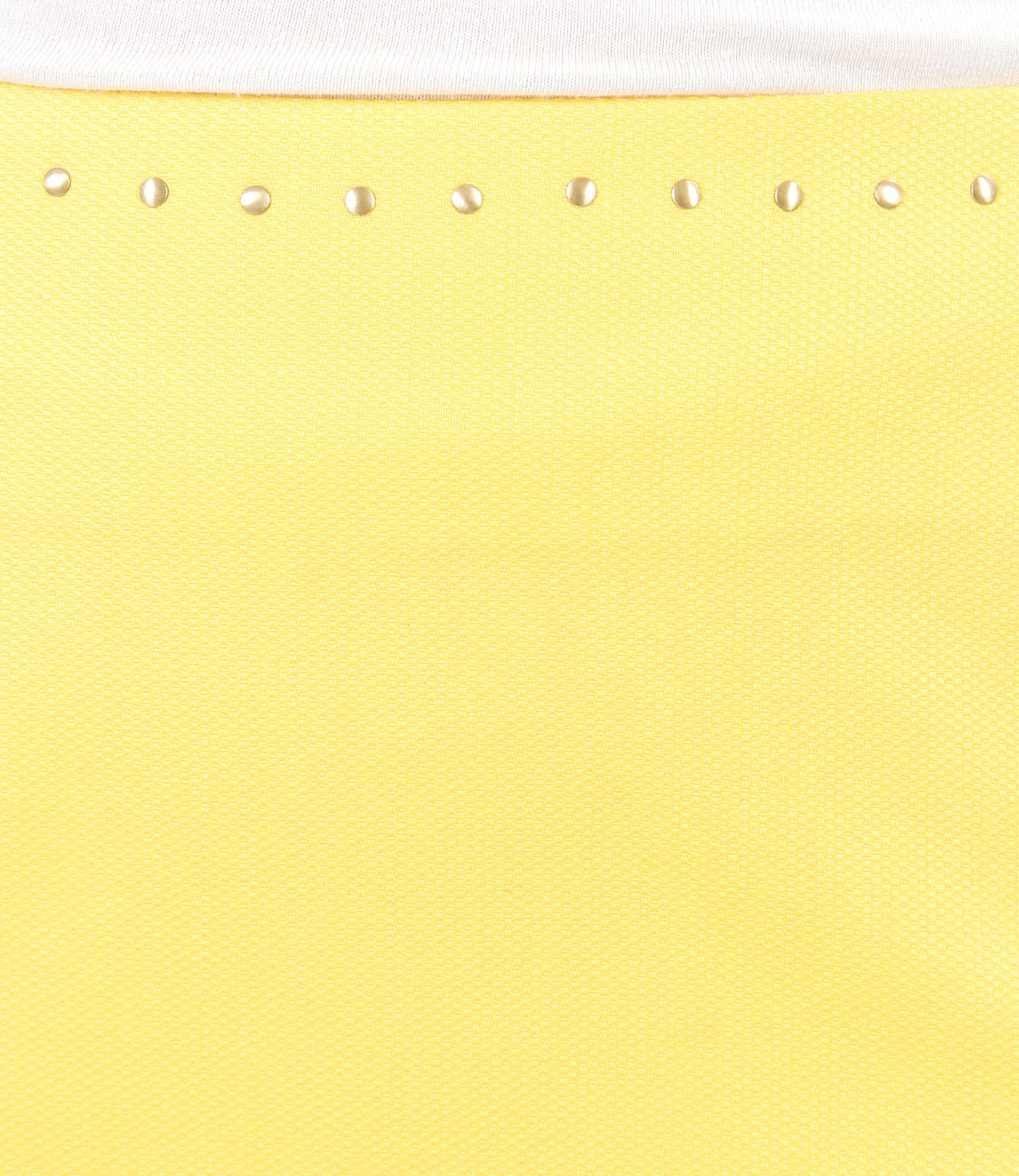 Textured cotton tapered skirt, padded with viscose, with front slit, with fringe and metal staples embellished with crystals. Closes with hidden zipper on the middle back.