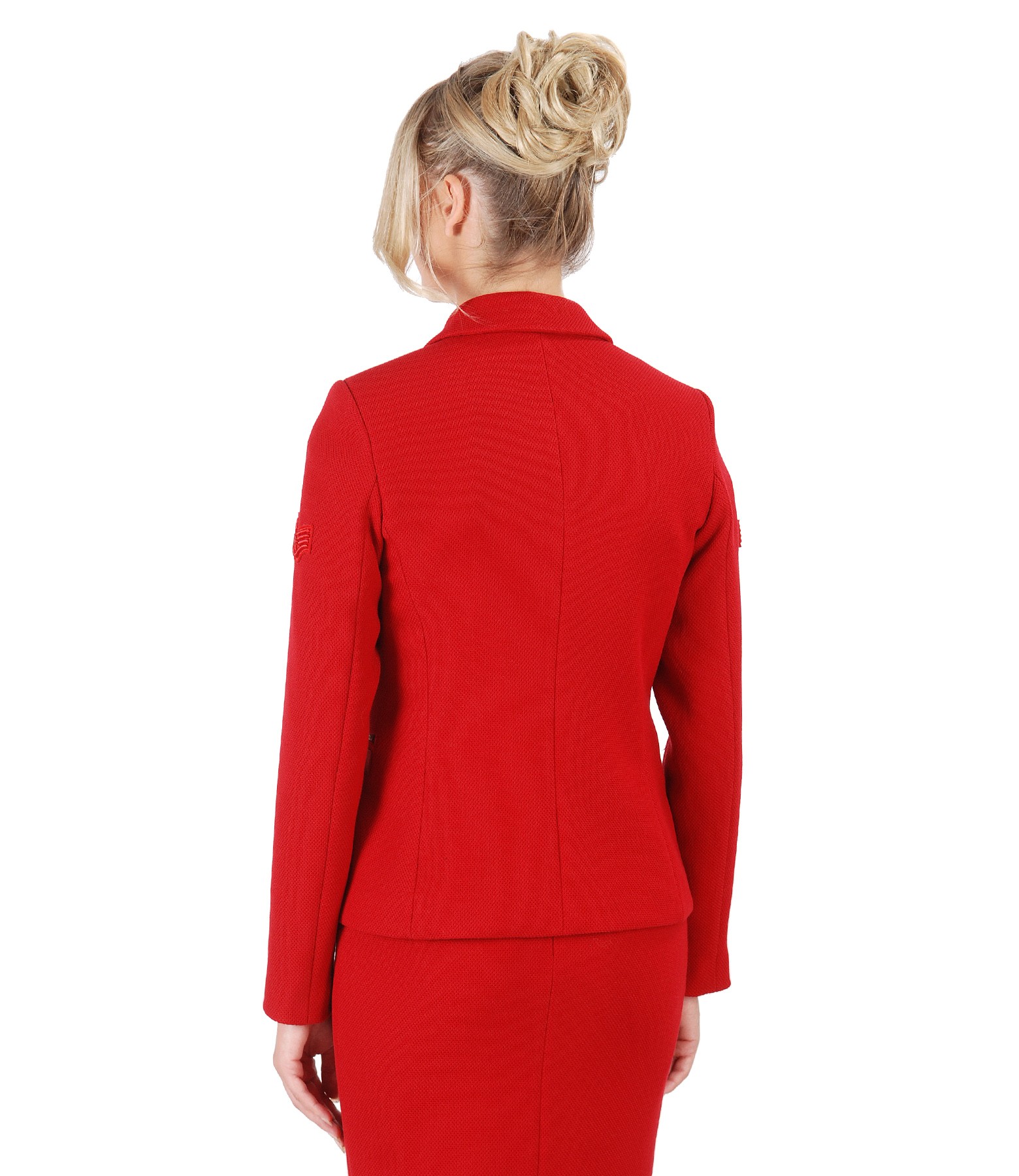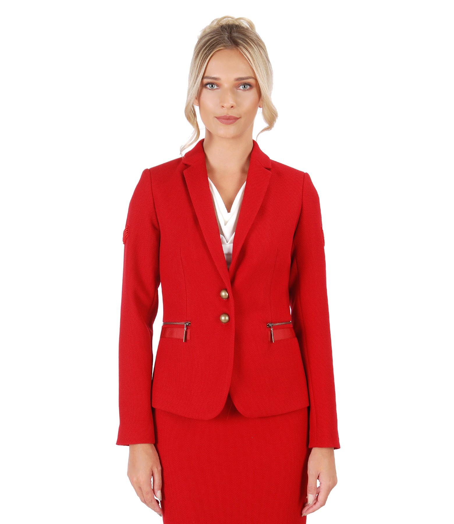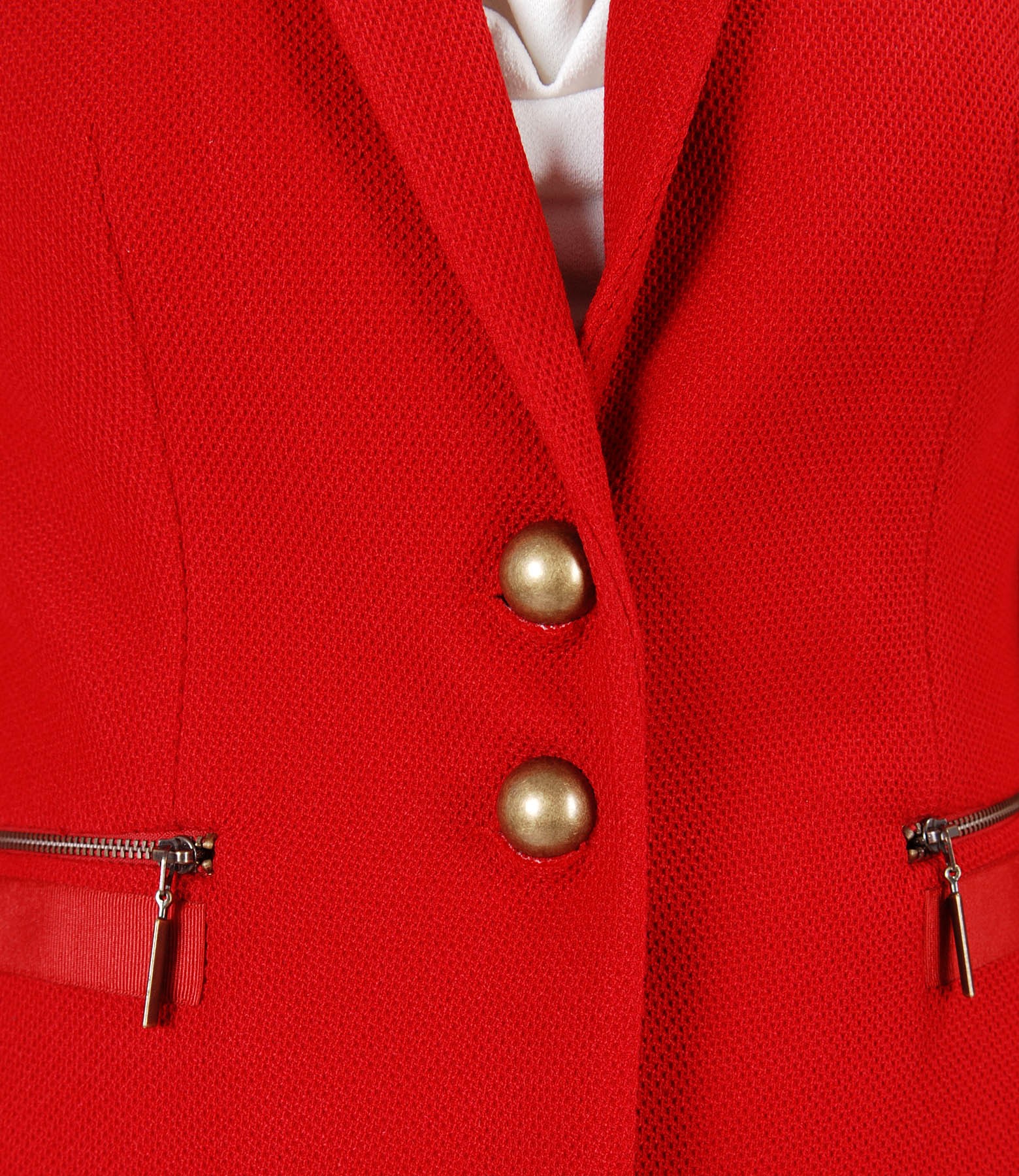 Textured fabric office jacket, padded, with deep low-cut neck, pockets with zipper waist and rips band. Closes with two front buttons.