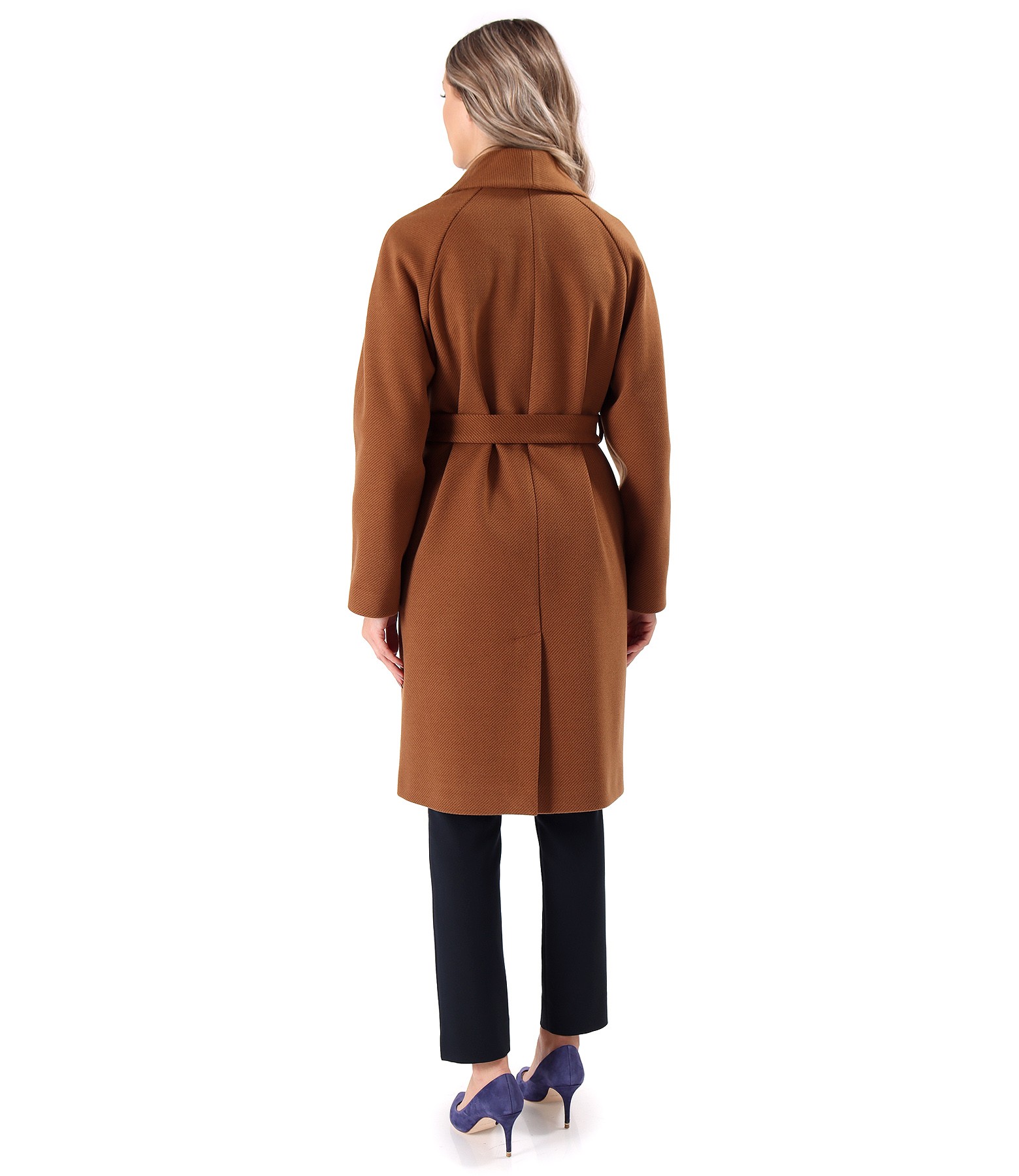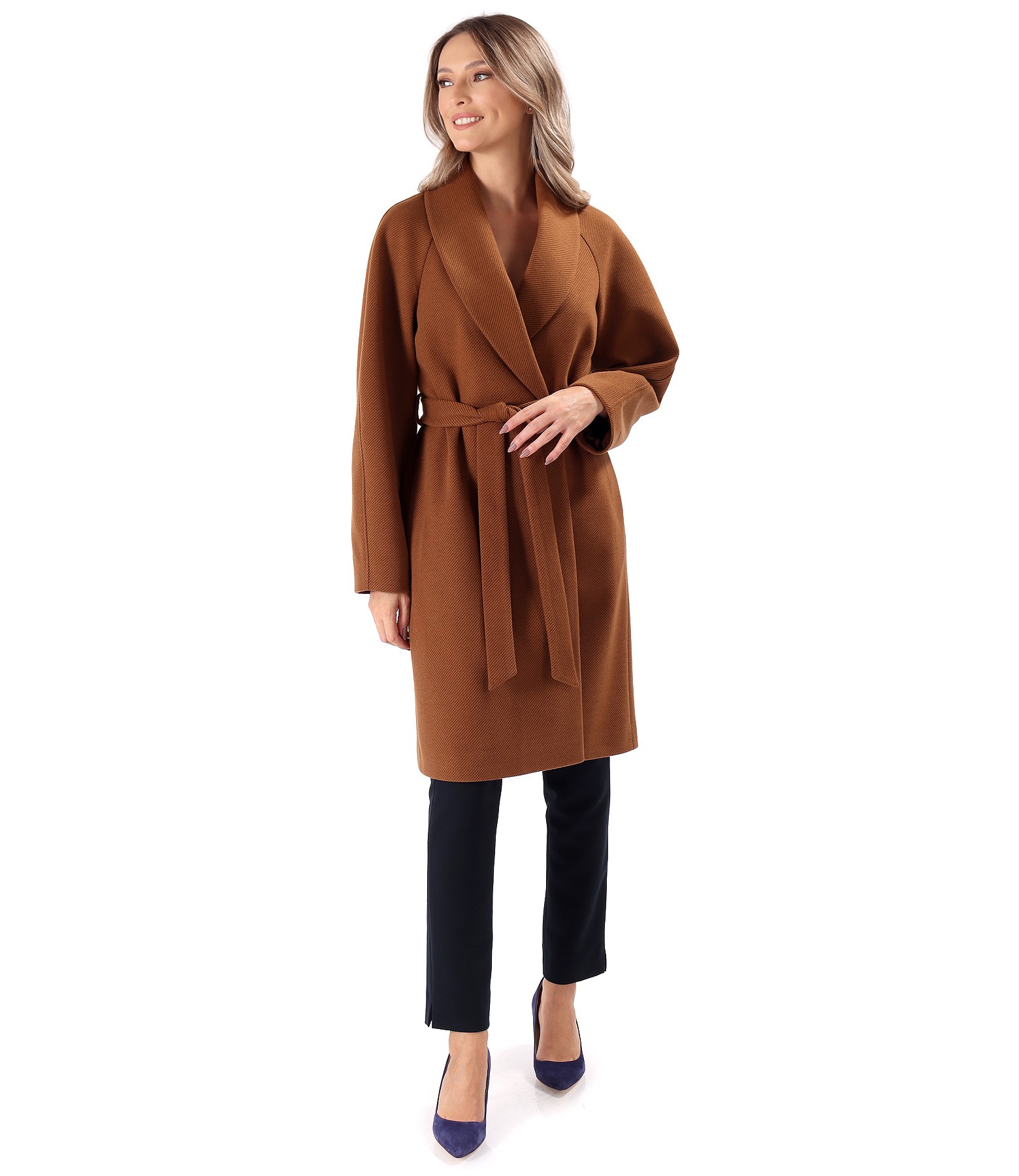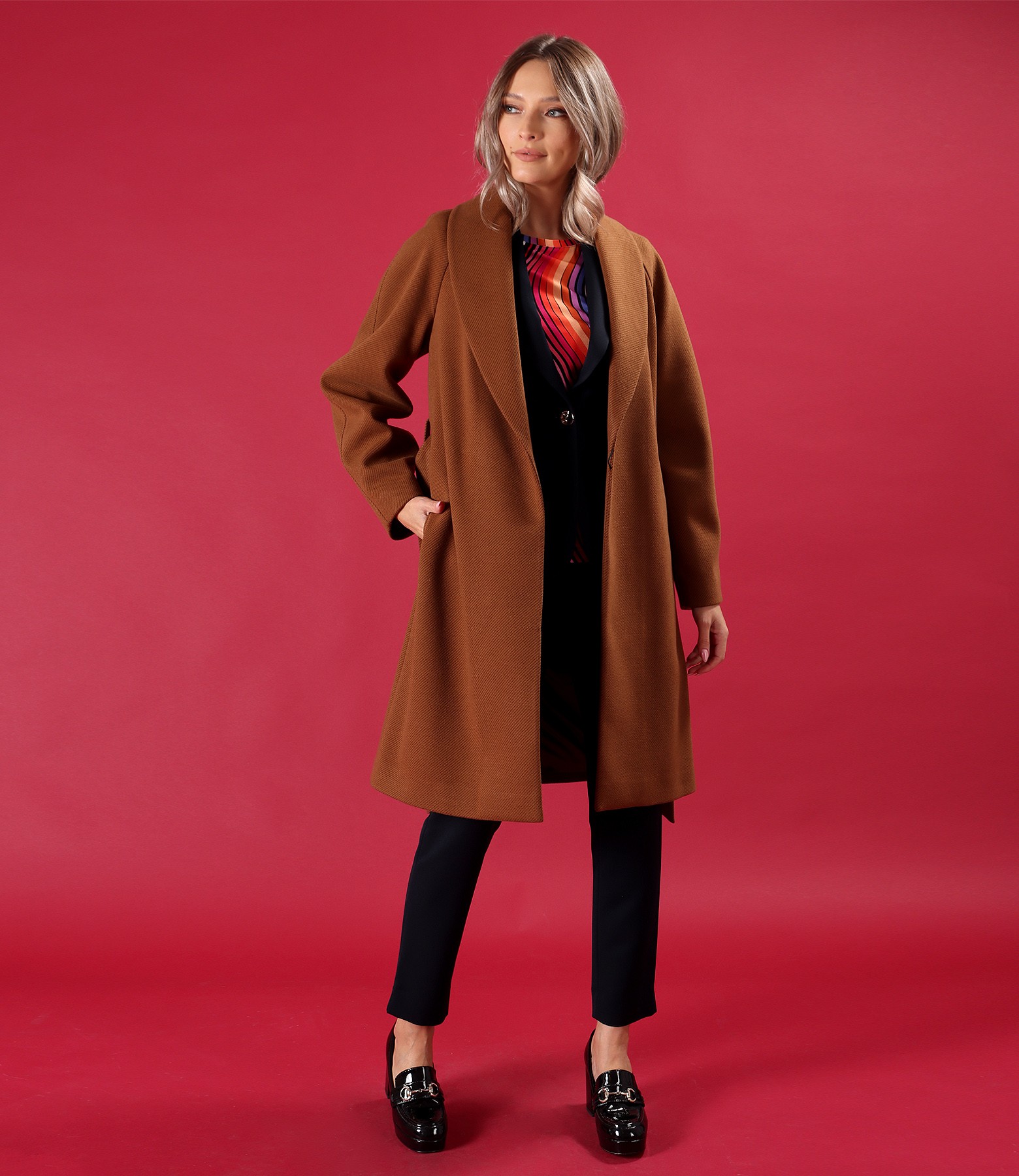 Overcoat made of thick fabric, padded with viscose, with side pockets, long raglan sleeves, and a slit in the middle of the back. It closes with a cord fixed to the side.