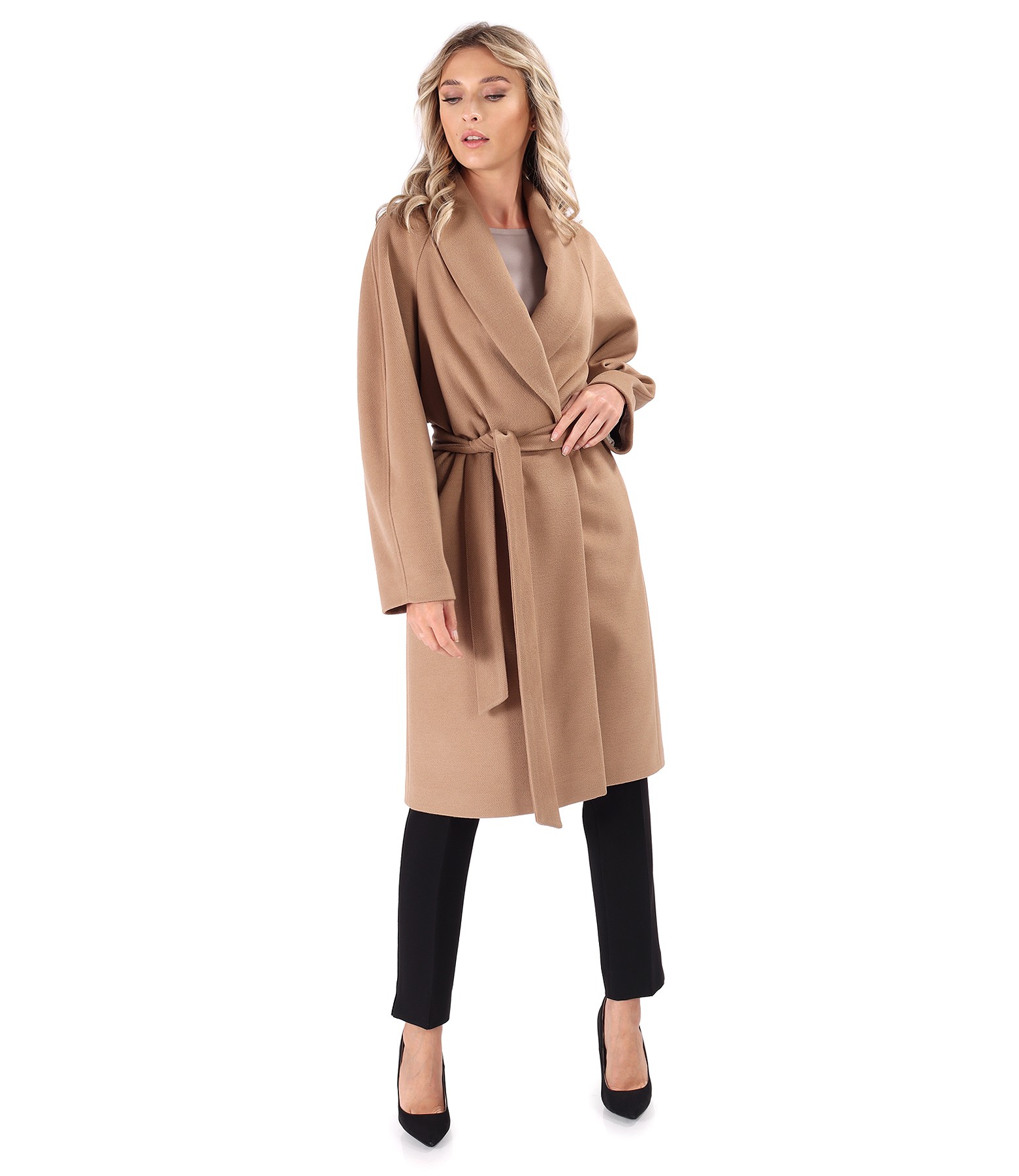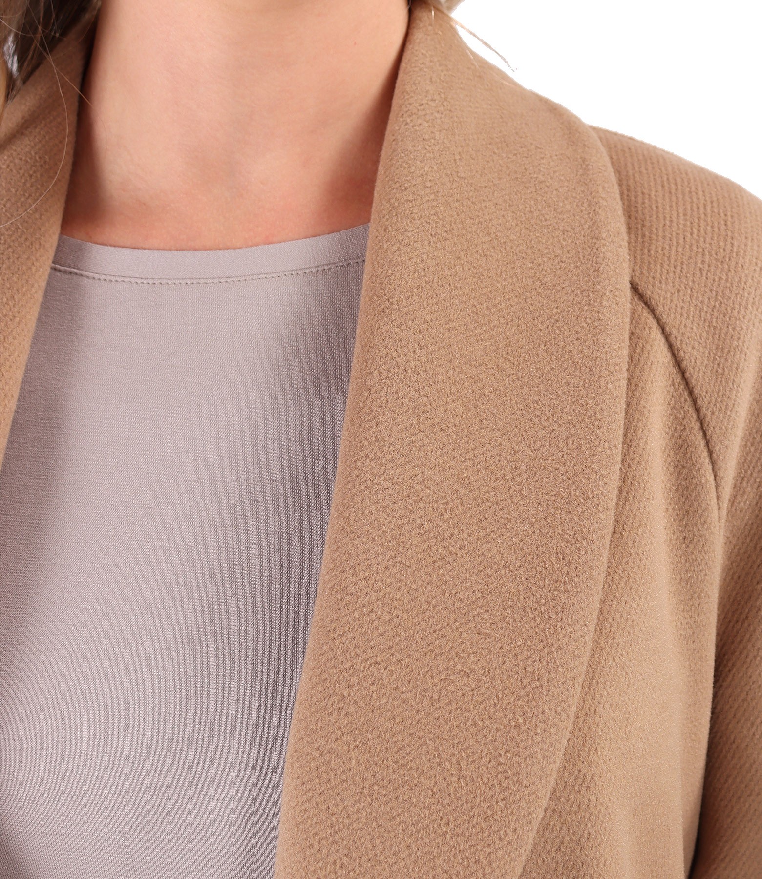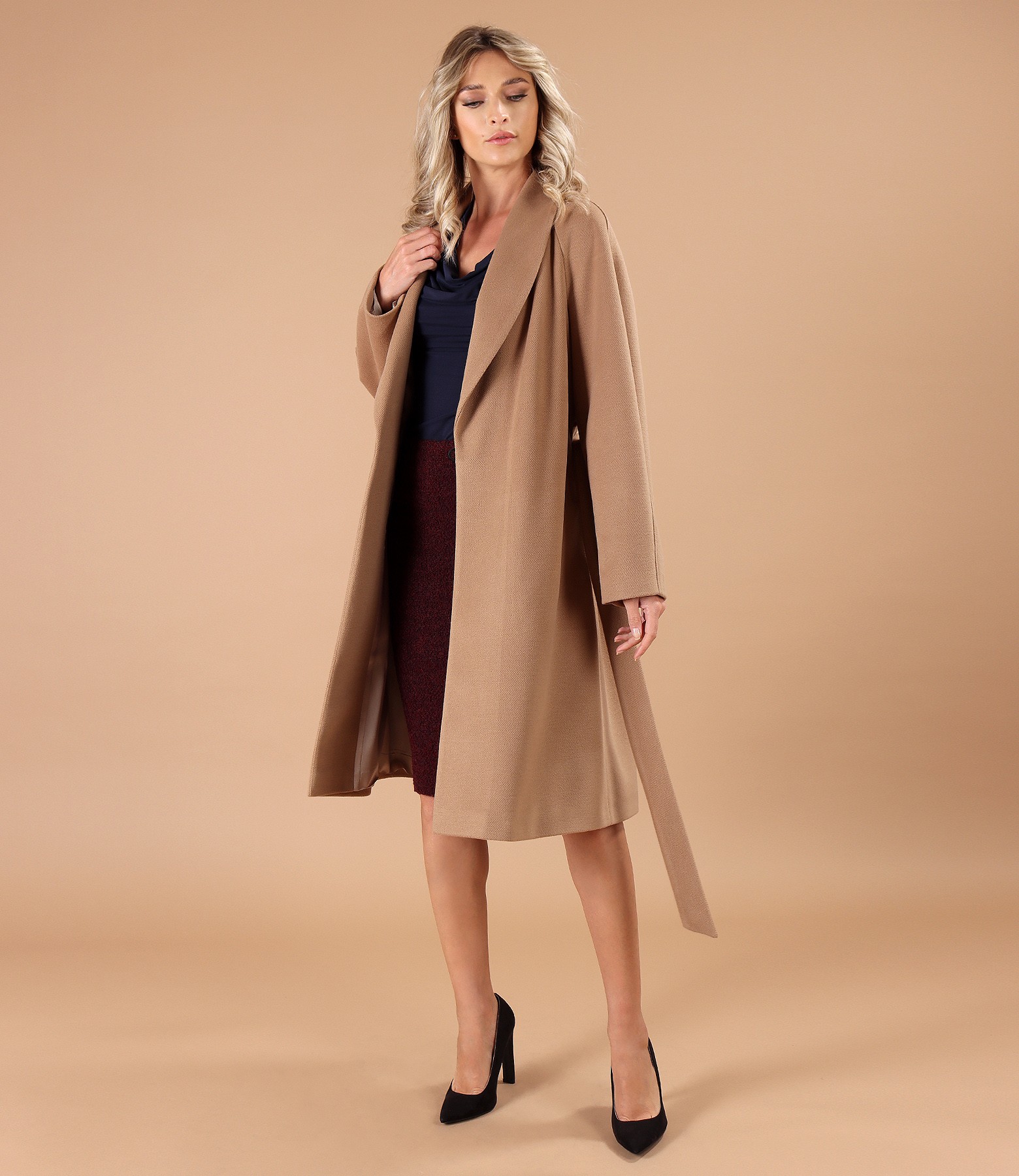 Overcoat made of thick viscose fabric, padded, with side pockets, long raglan sleeves, and a slit in the middle of the back. It closes with a cord fixed to the side.