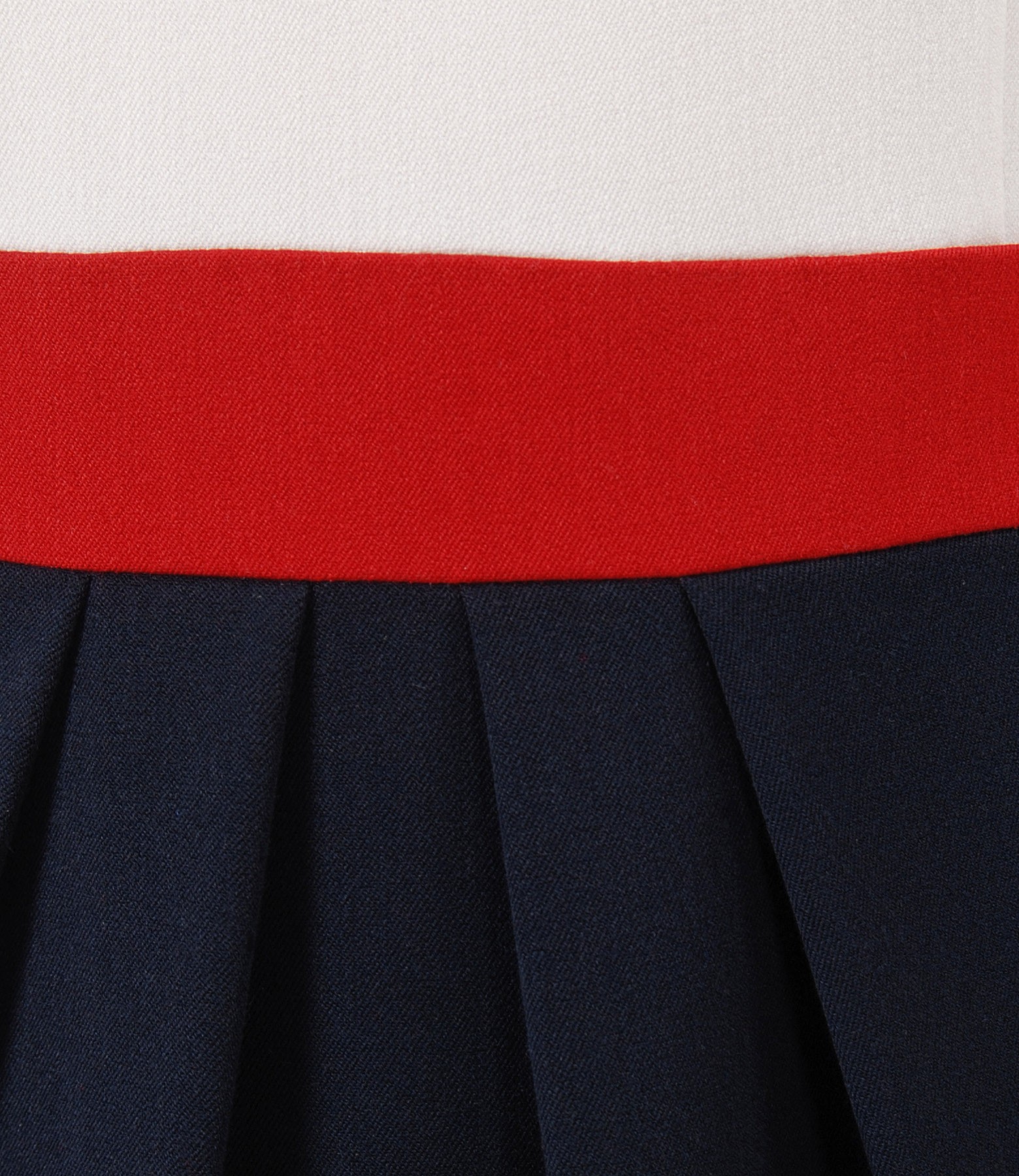Three colors elegant dress, inlay, with round low-cut neck, short sleeves and front folds. Closes with hidden zipper on the left side.