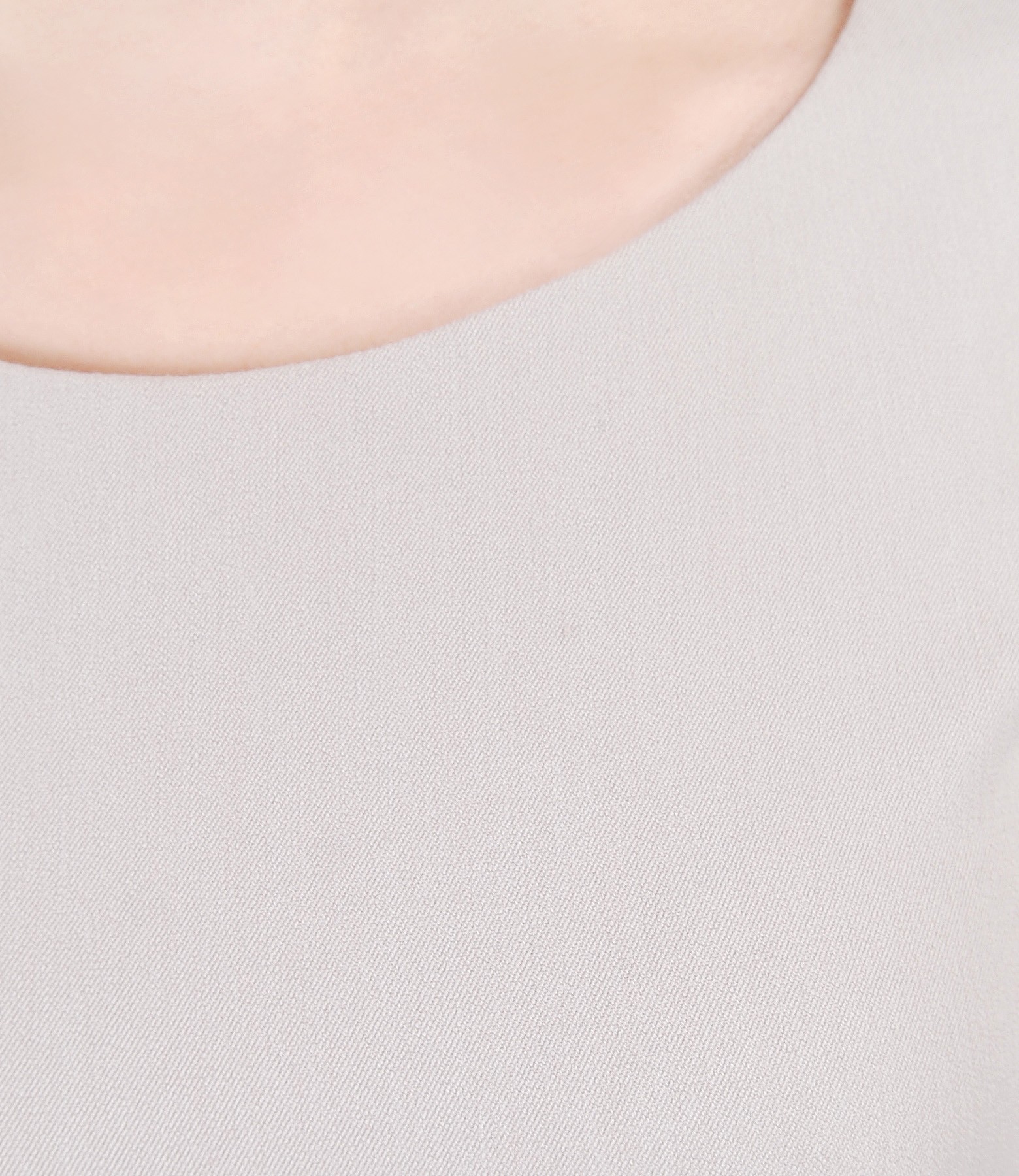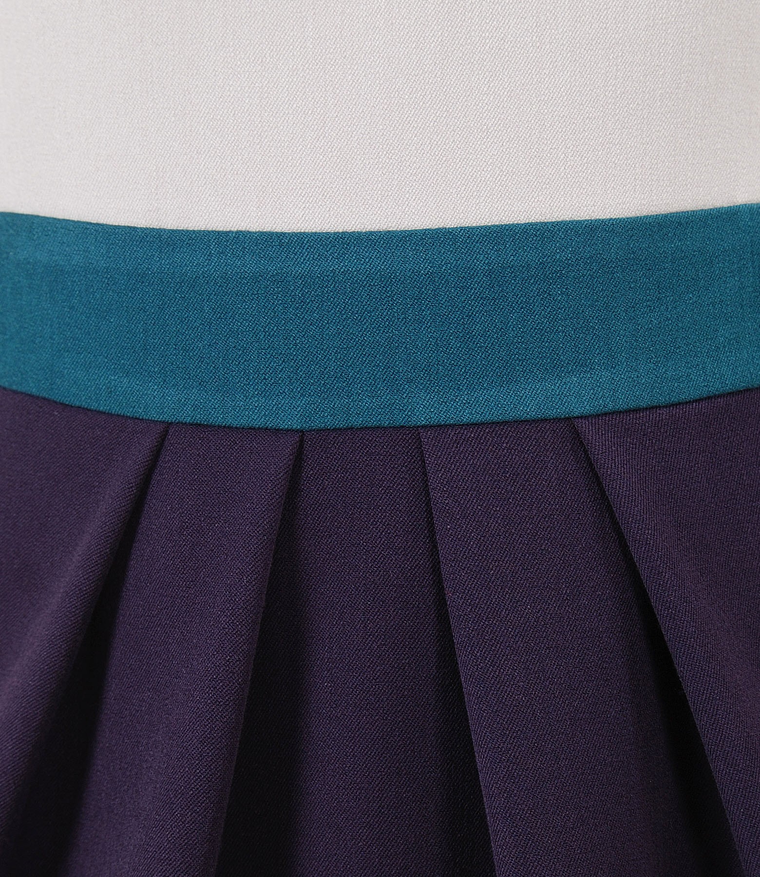 Three colors elegant dress, inlay, with round low-cut neck, short sleeves and front folds. Closes with hidden zipper on the left side.