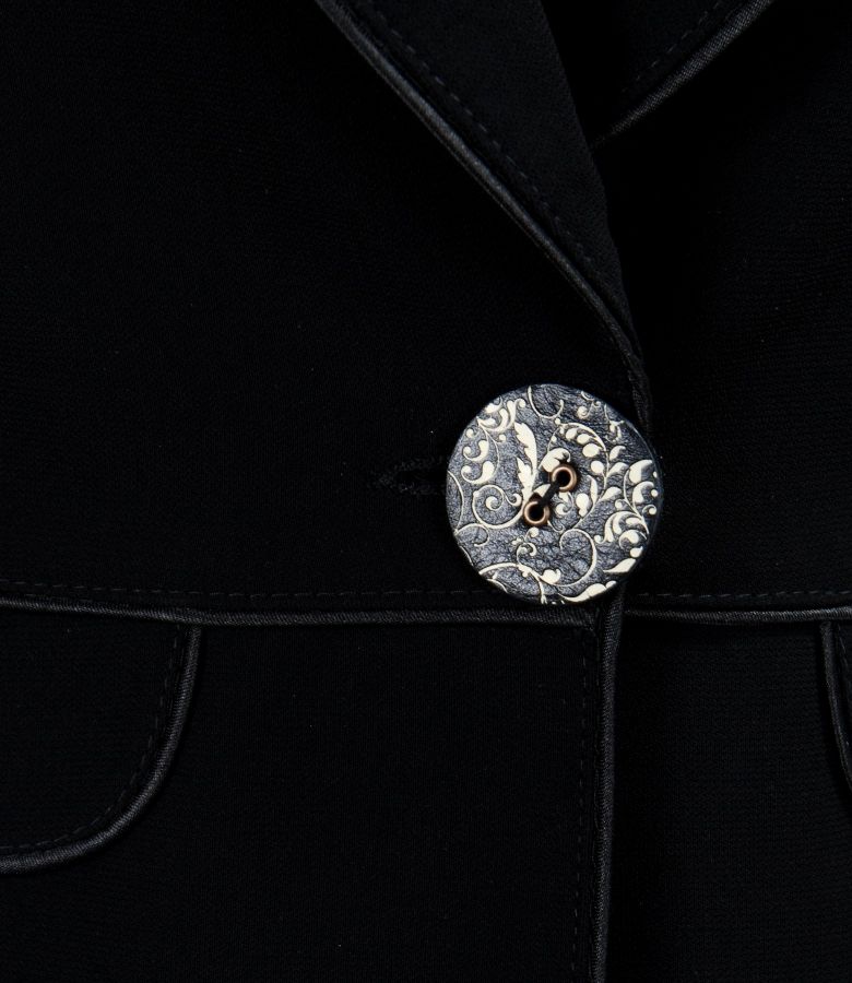 Elegant jacket with collar and rounded lapels, with 2 flaps on waist and in tone garnish. Closes with one front leather button