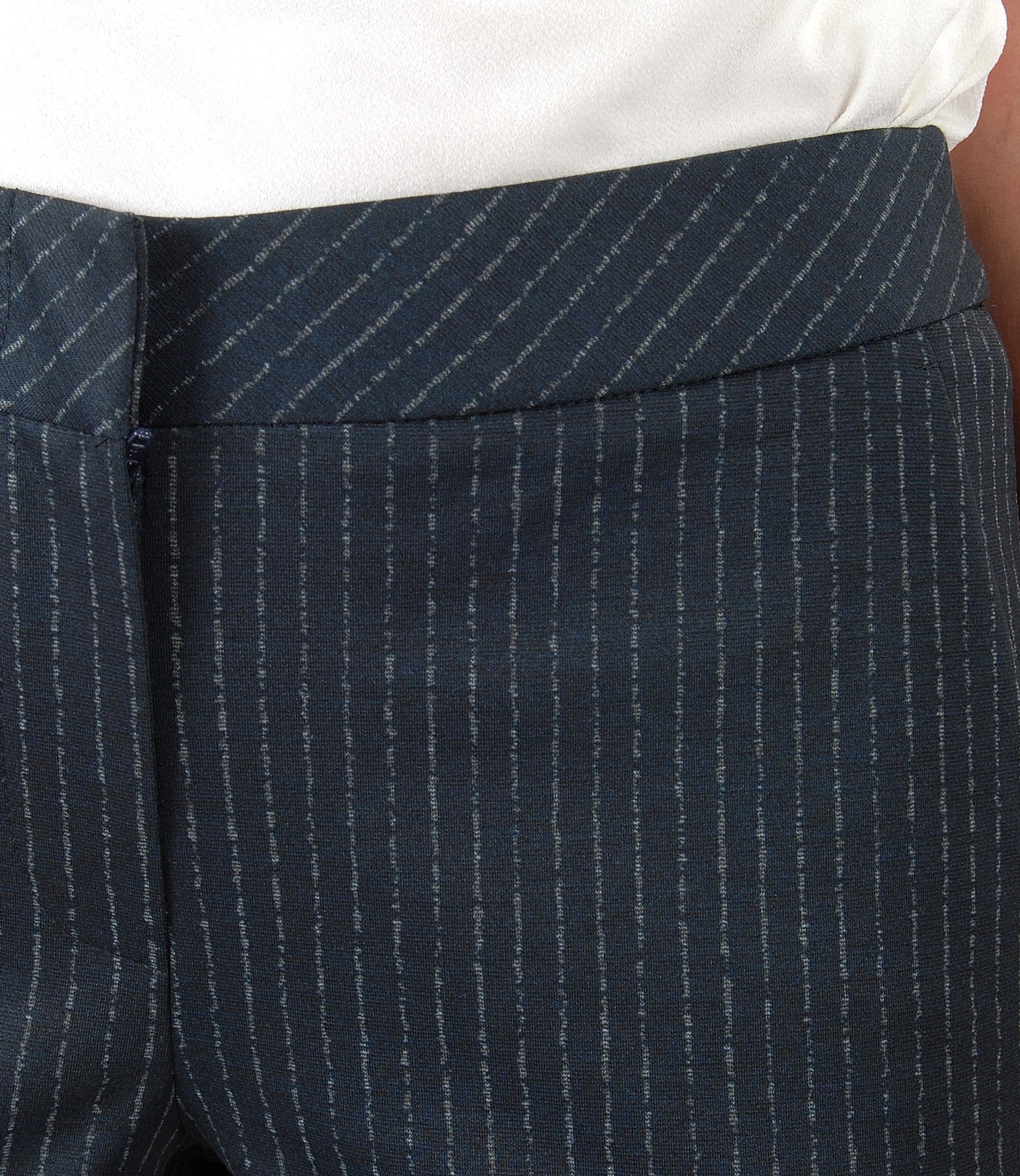 Trousers made of thick elastic jersey with fine vertical stripes, with a cord in the front and elastic on the back and side pockets. It closes with a normal zipper, contra-buttons and 2 staples on the face.