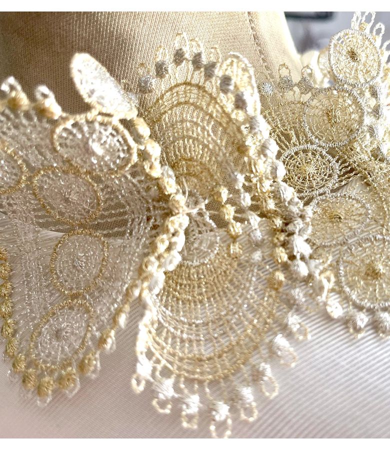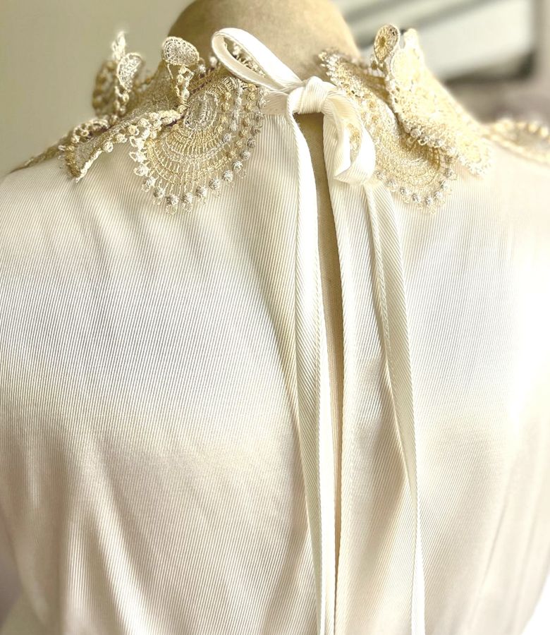 Cream-white tulle dress for girls aged 2-12, with a ribbed satin bodice and a skirt made of several layers of tulle. The dress has a decorative trim on the neckline and is doubled with viscose.