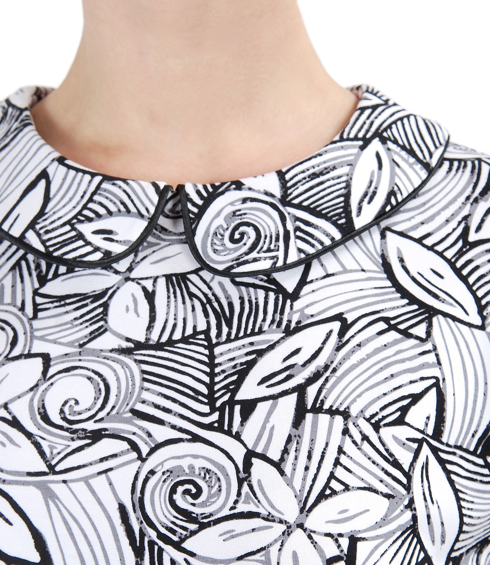 Elastic jersey blouse with floral print , with short sleeves and round collar. Closes with a back button.
