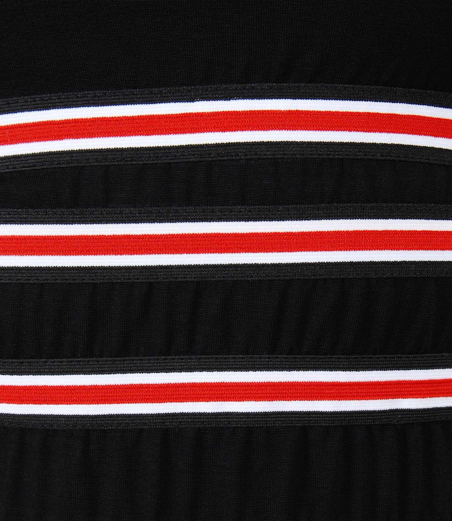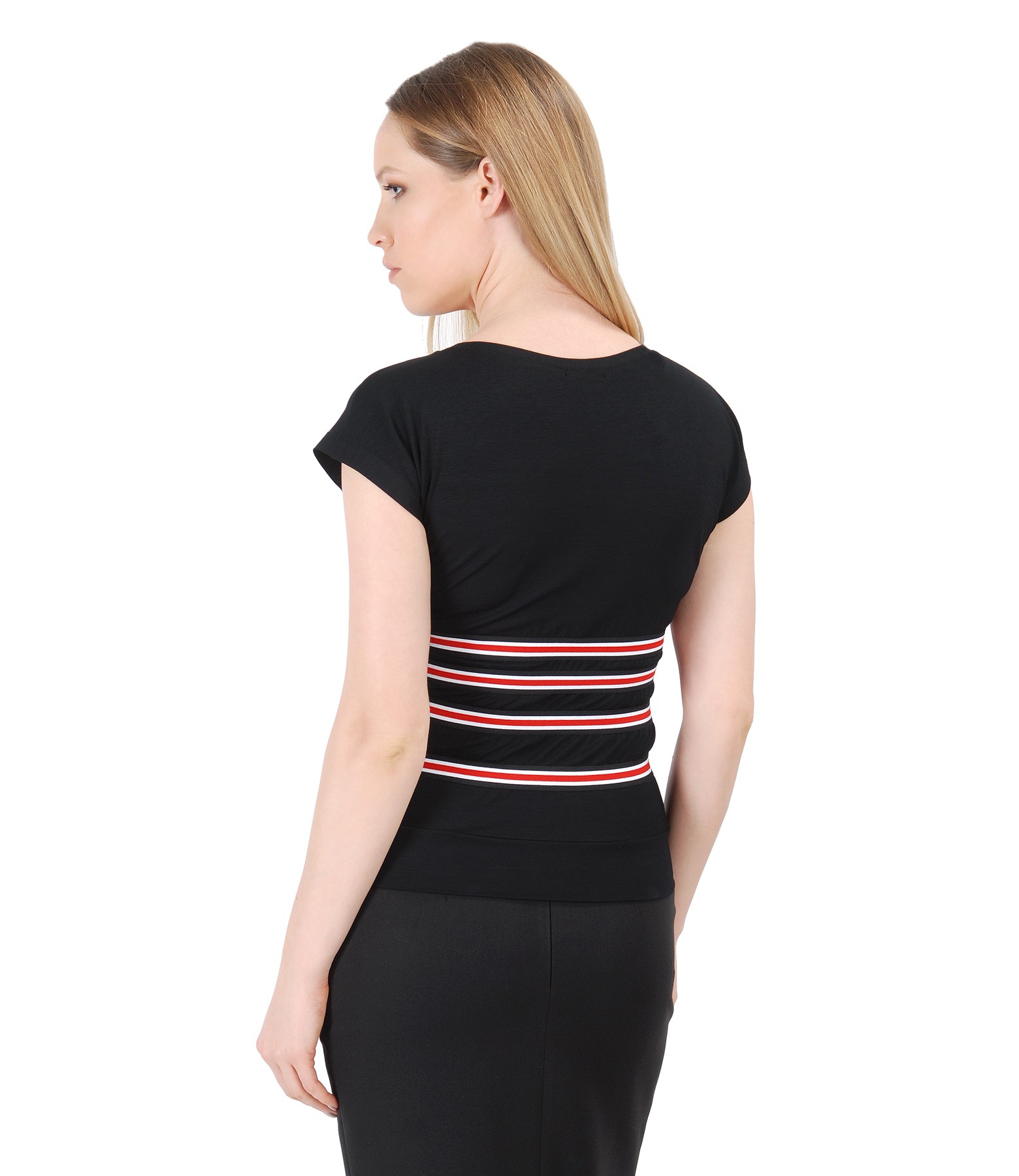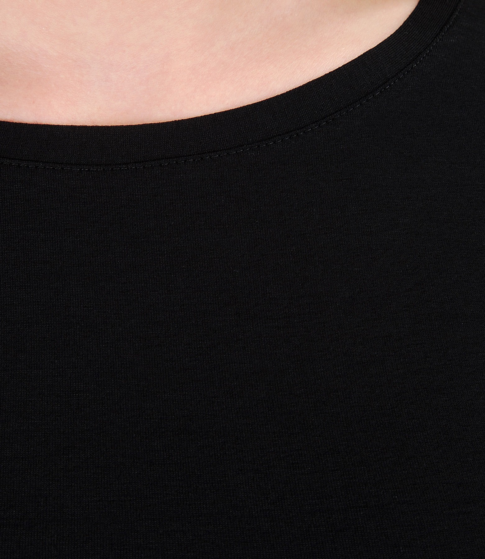 Elastic jersey t-shirt, with round low-cut neck, short sleeves and elastic waist. Have no closing system.