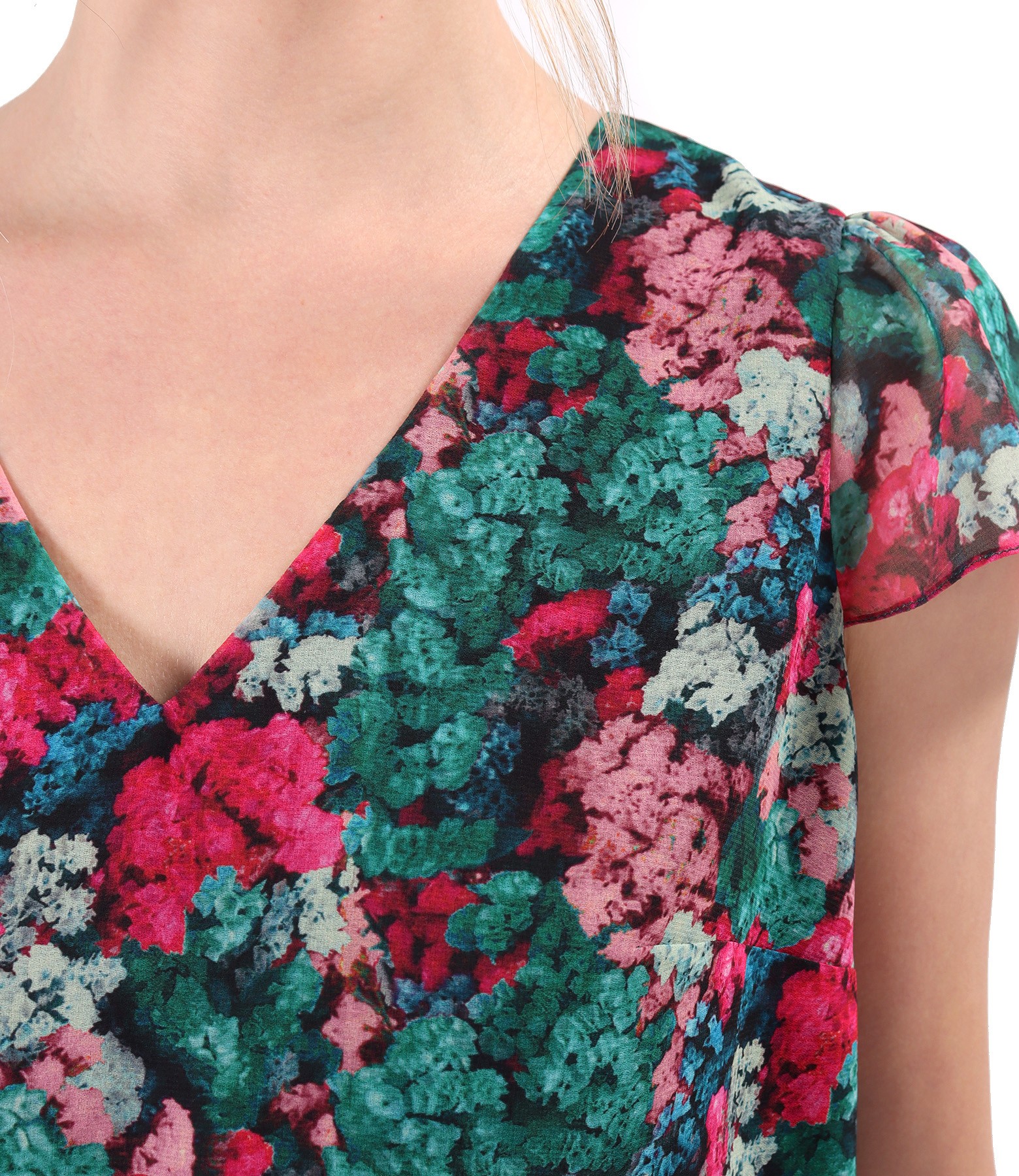 Blouse made of veil printed with floral motifs, doubled with viscose, short sleeves, and V-neckline.