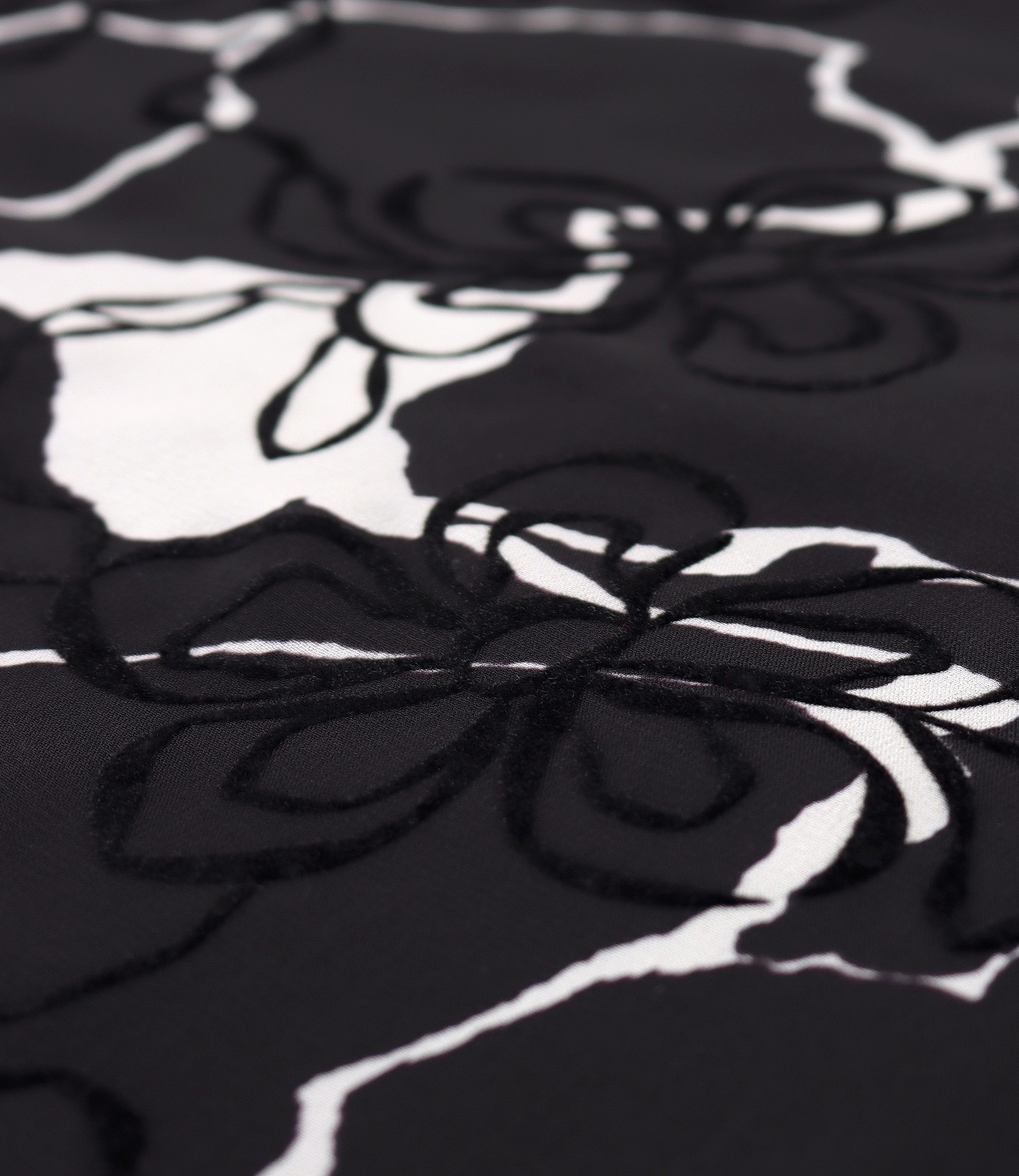 Veil blouse with floral motifs brocaded with velvet, doubled with satin, with collar and long sleeves. It closes with 2 buttons on the middle back. The position of the print varies per product.