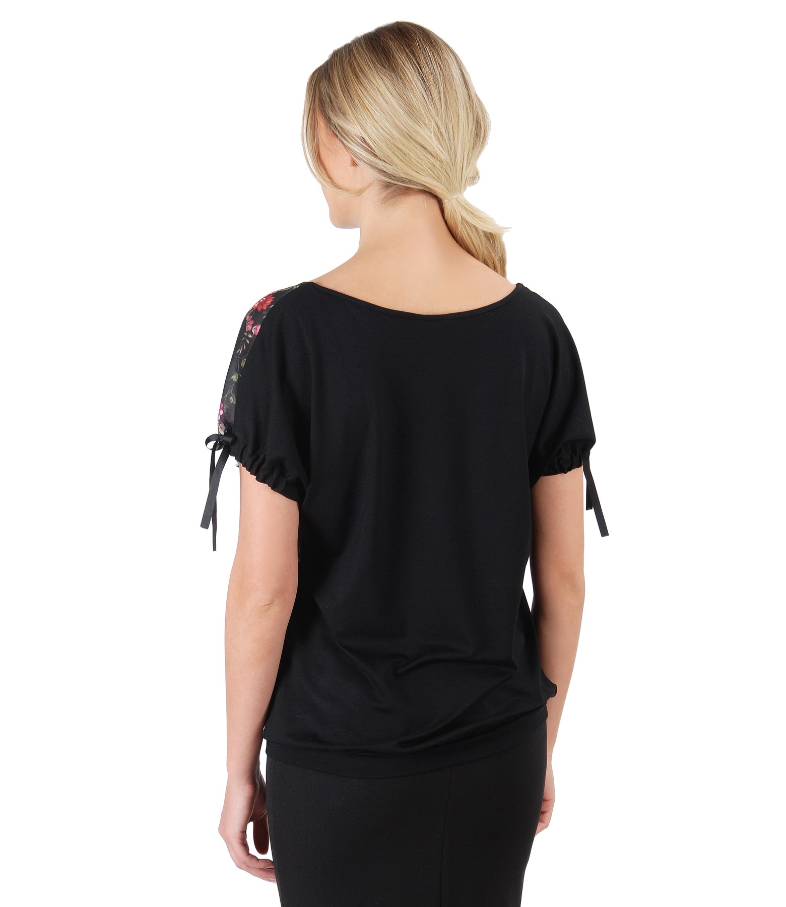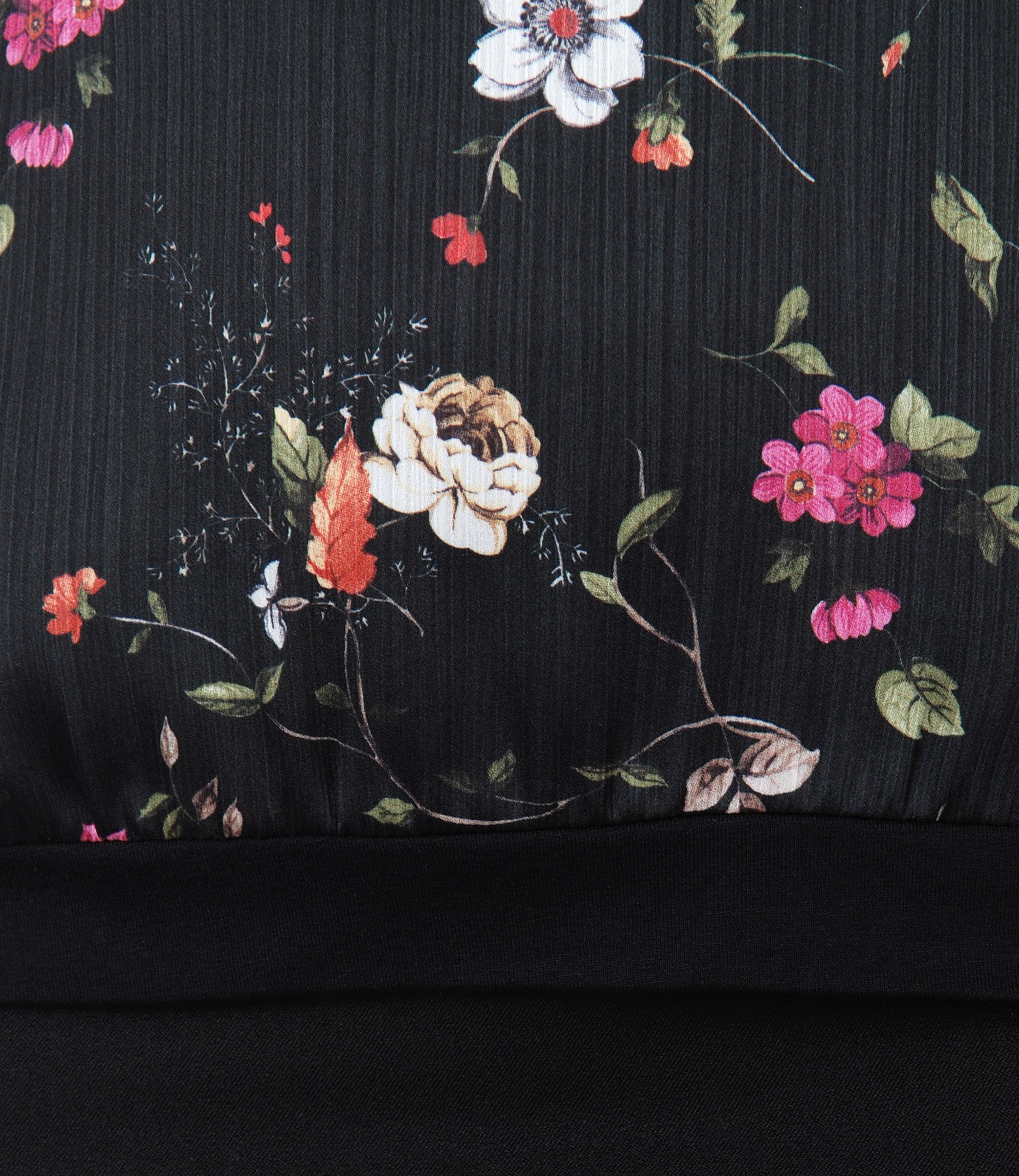 Veil blouse with floral print, with uni viscose back, round low-cut neck and trimmed edge. Have no closing system.