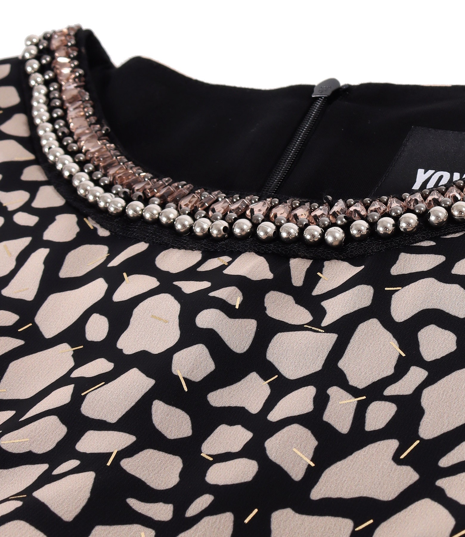 Elegant veil dress with animal print, doubled with viscose, short sleeves and trimmings at the neckline. It closes with a hidden zipper on the middle back.