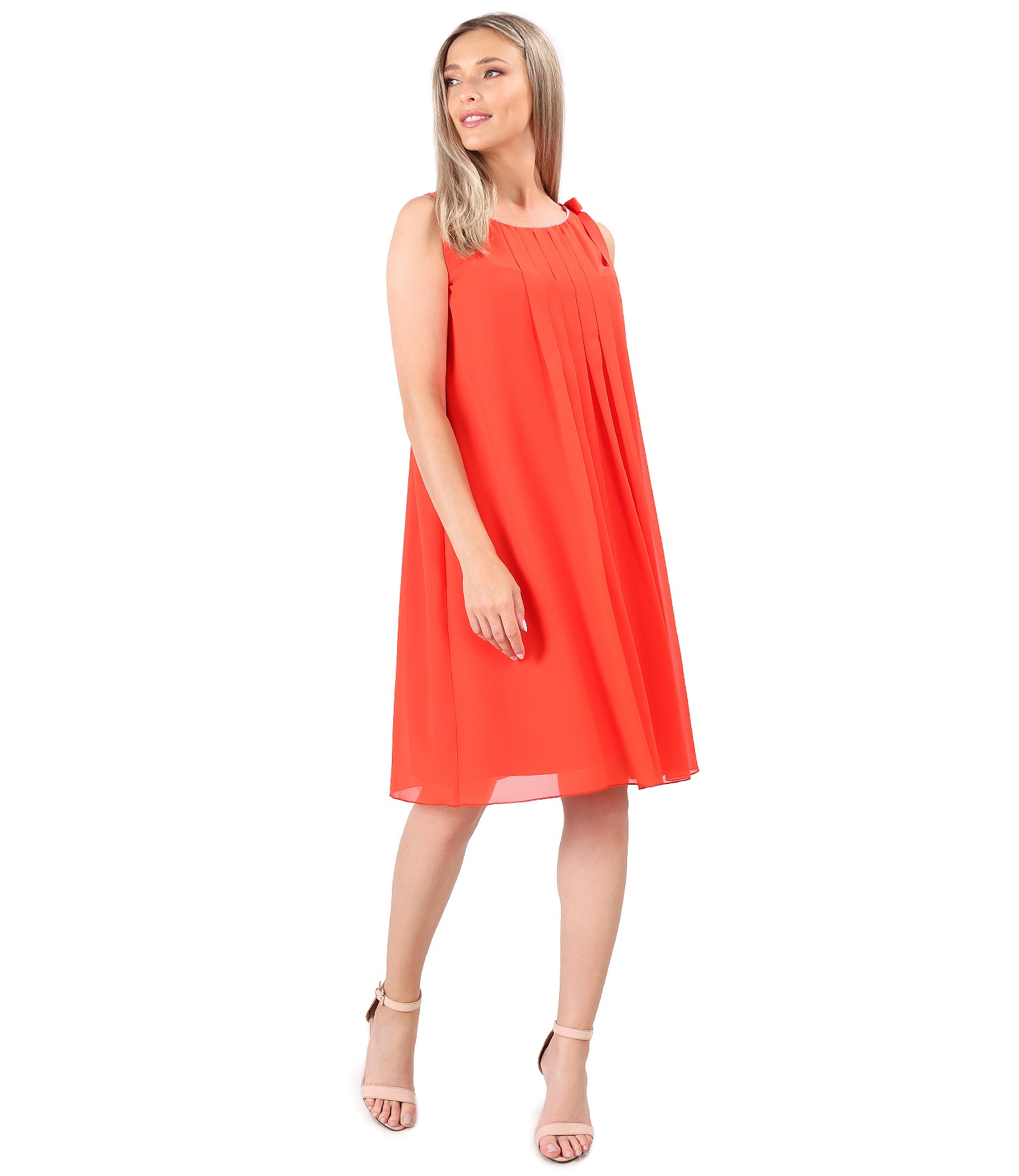 Casual veil dress, without sleeves, with front folds, embellished with crystals. Has no closing system.