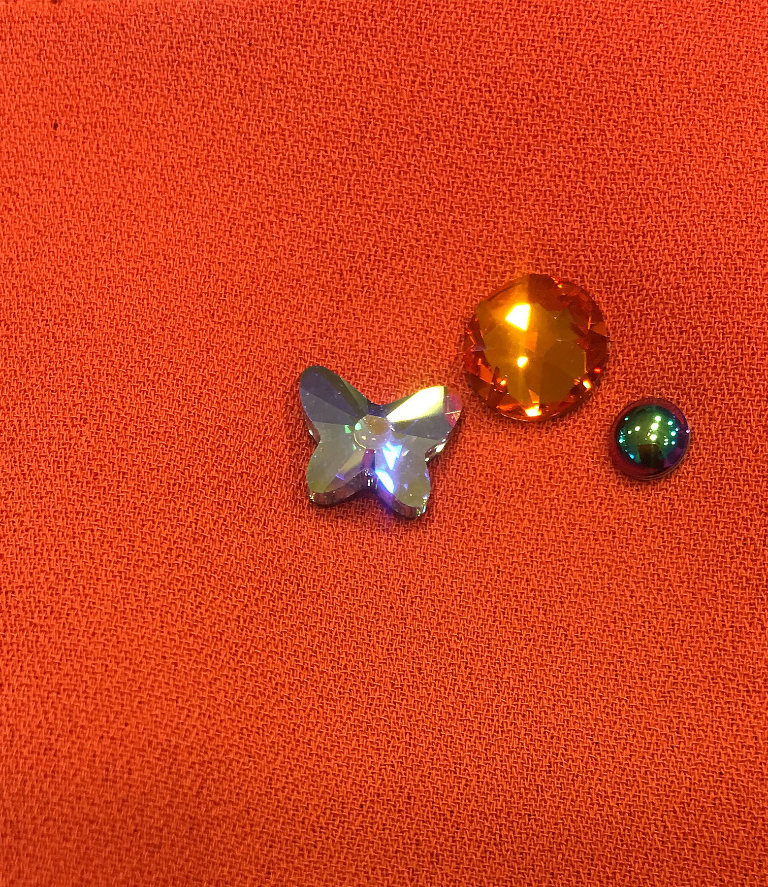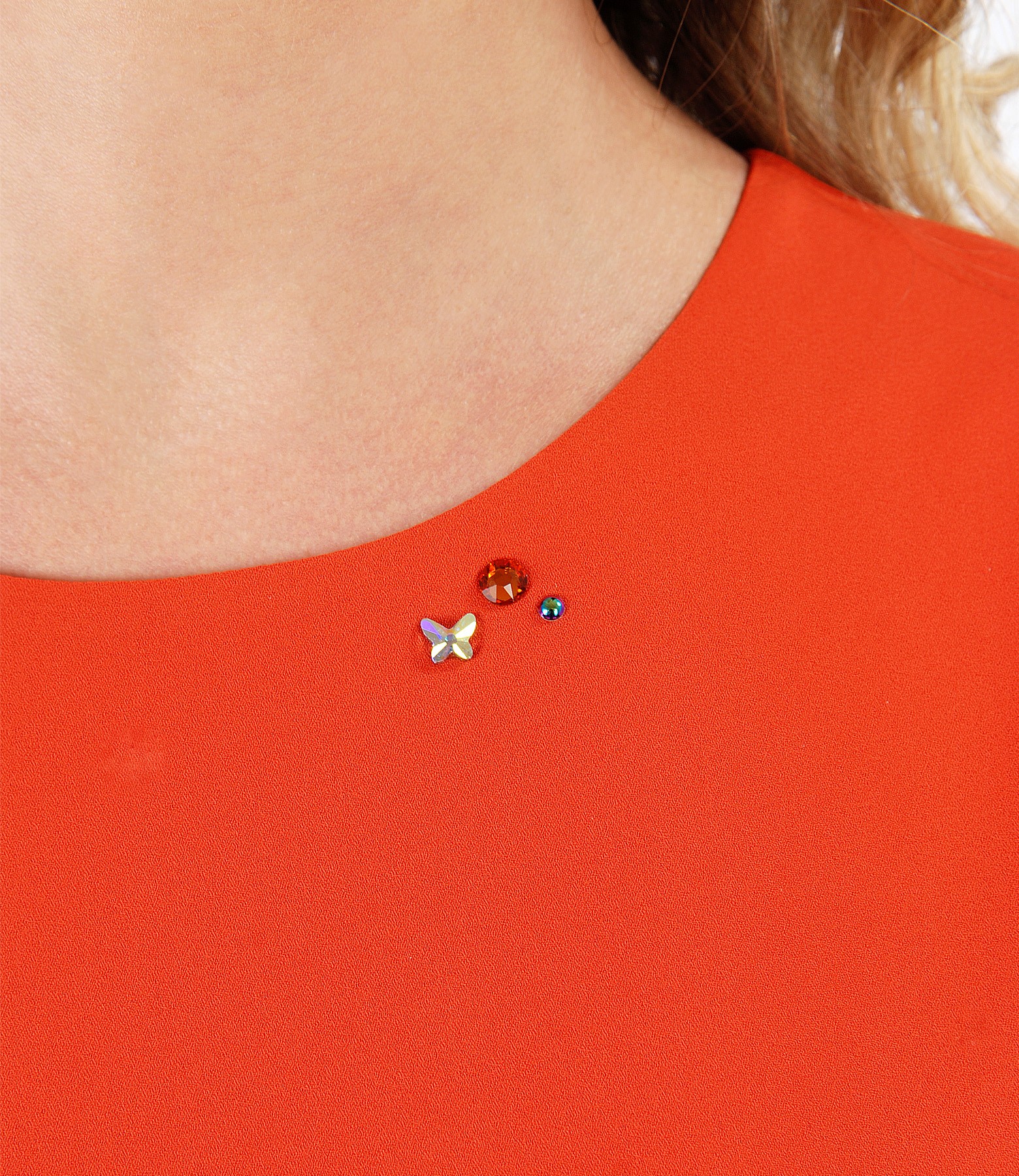 Veil dress, doubled with viscose, short sleeves, round low-cut neck, embellished with crystals on decolletage. Closes with a button and zipper on the middle back.