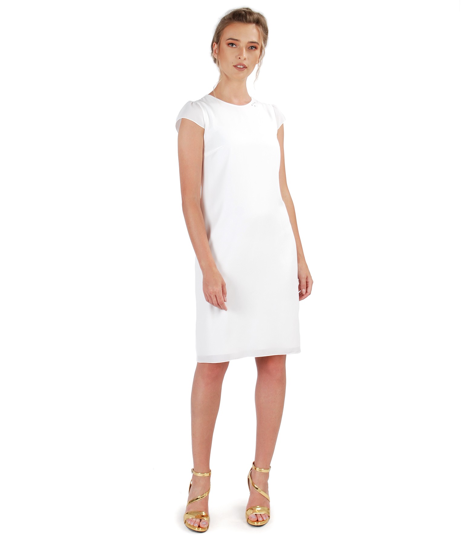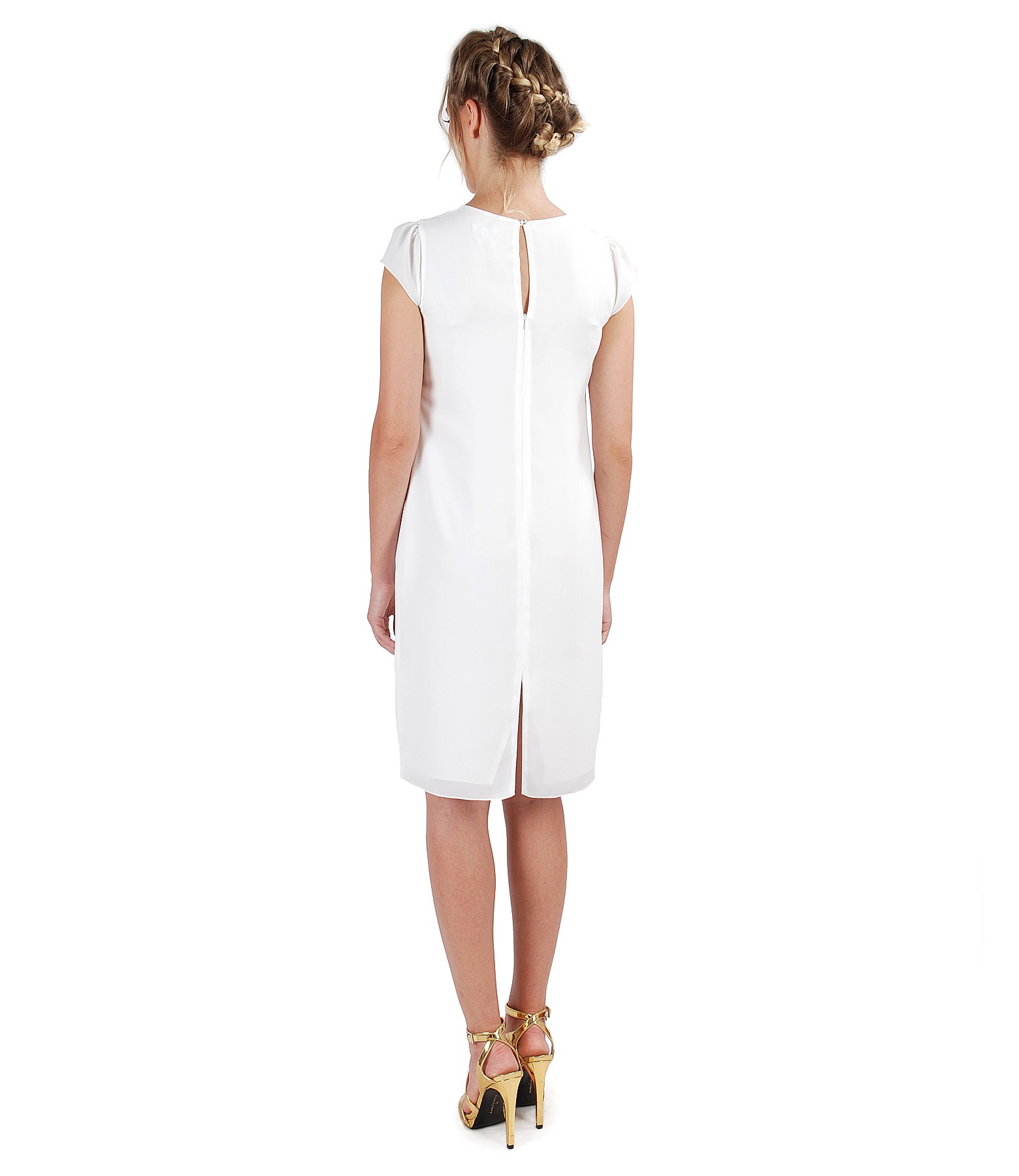 Veil dress, doubled with viscose, short sleeves, round low-cut neck, embellished with crystals on decolletage. Closes with a button and zipper on the middle back.