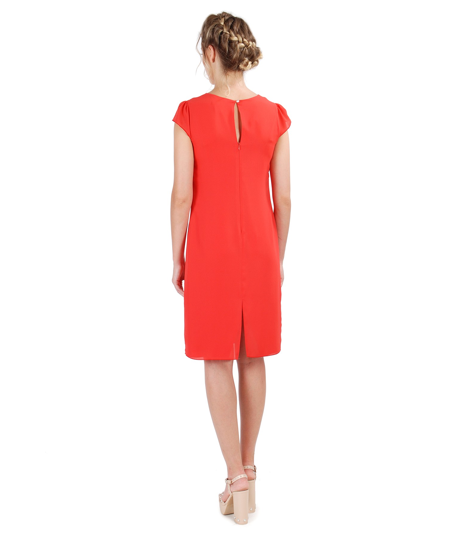 Veil dress, doubled with viscose, short sleeves, round low-cut neck, embellished with crystals on decolletage. Closes with a button and zipper on the middle back.