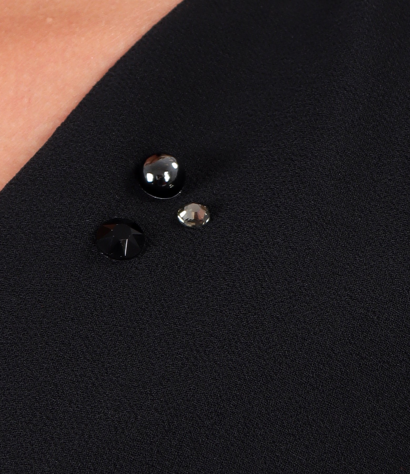 Printed veil midi dress with floral motifs,doubled with viscose,short sleeves and round decolletage. It closes with a button and a zipper in the middle.