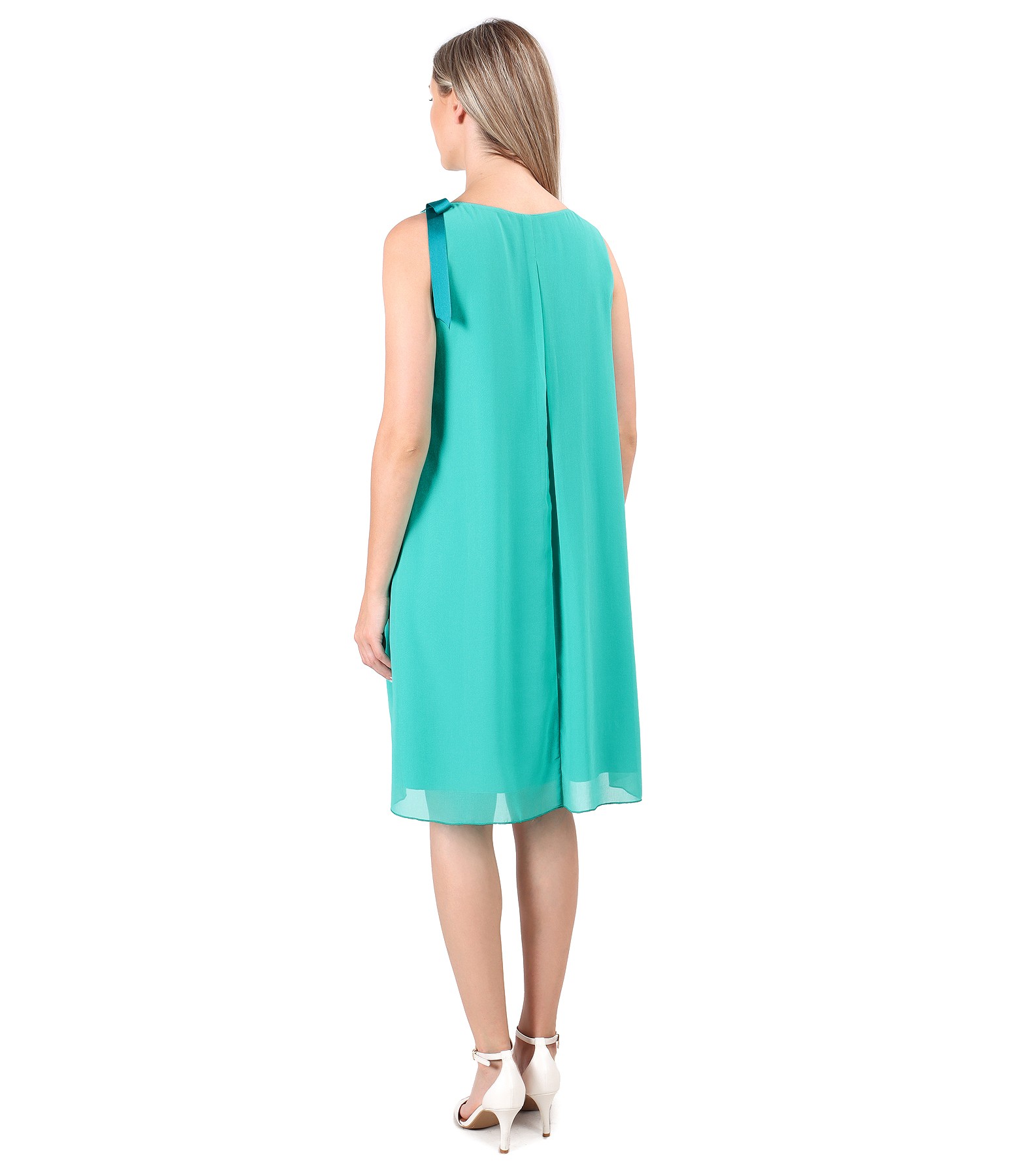 Casual veil dress, without sleeves, with front folds, embellished with crystals. Has no closing system.