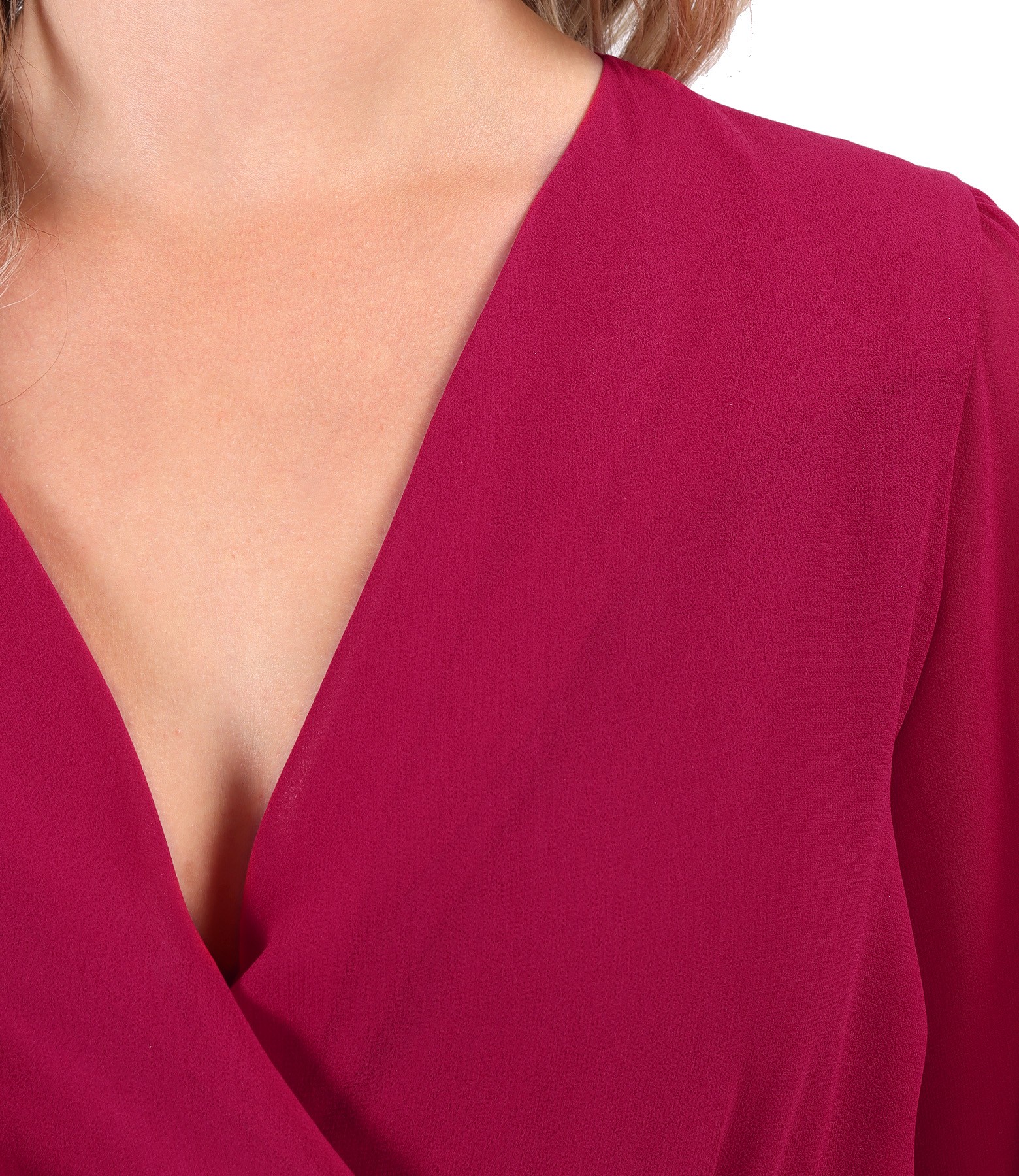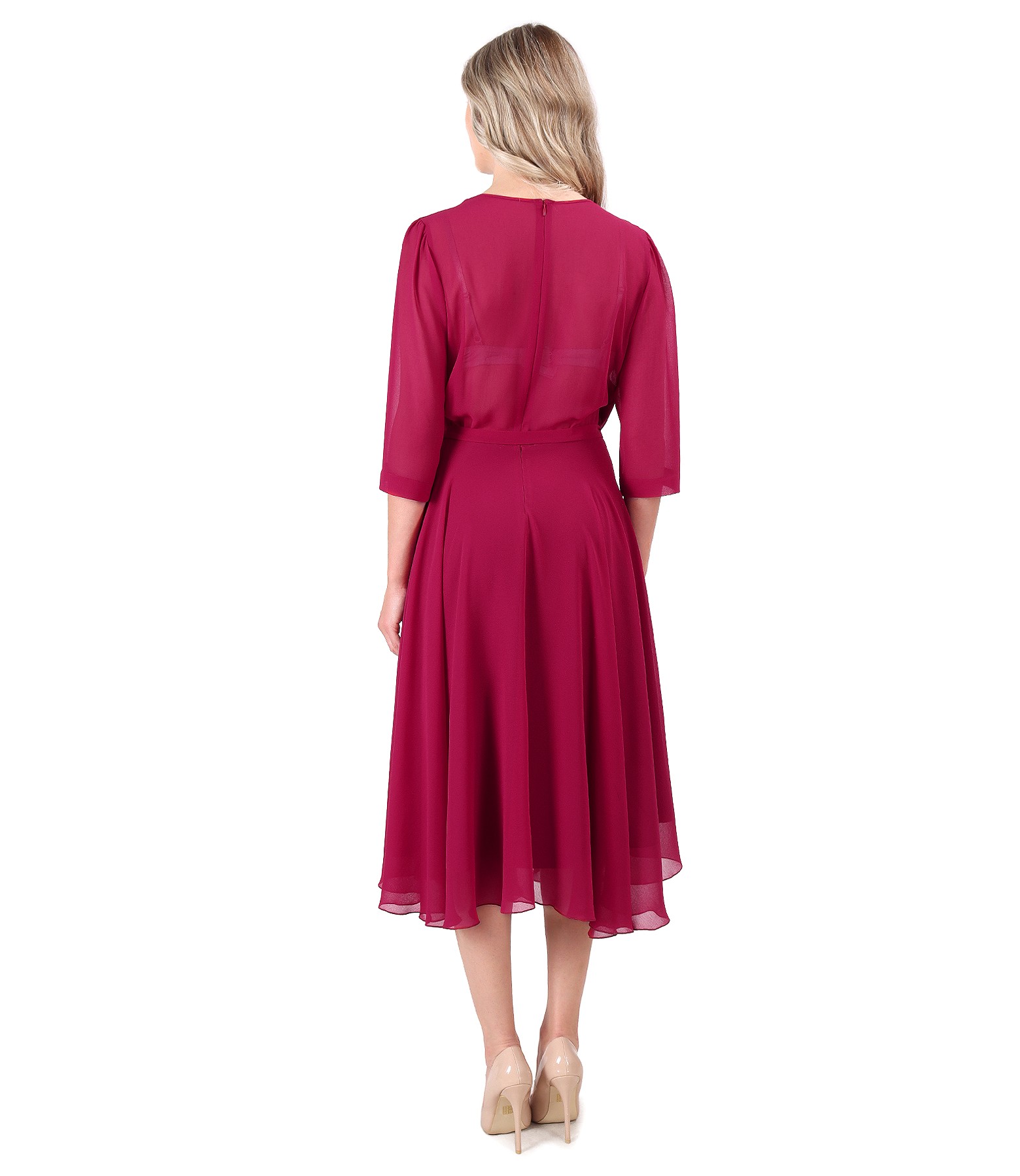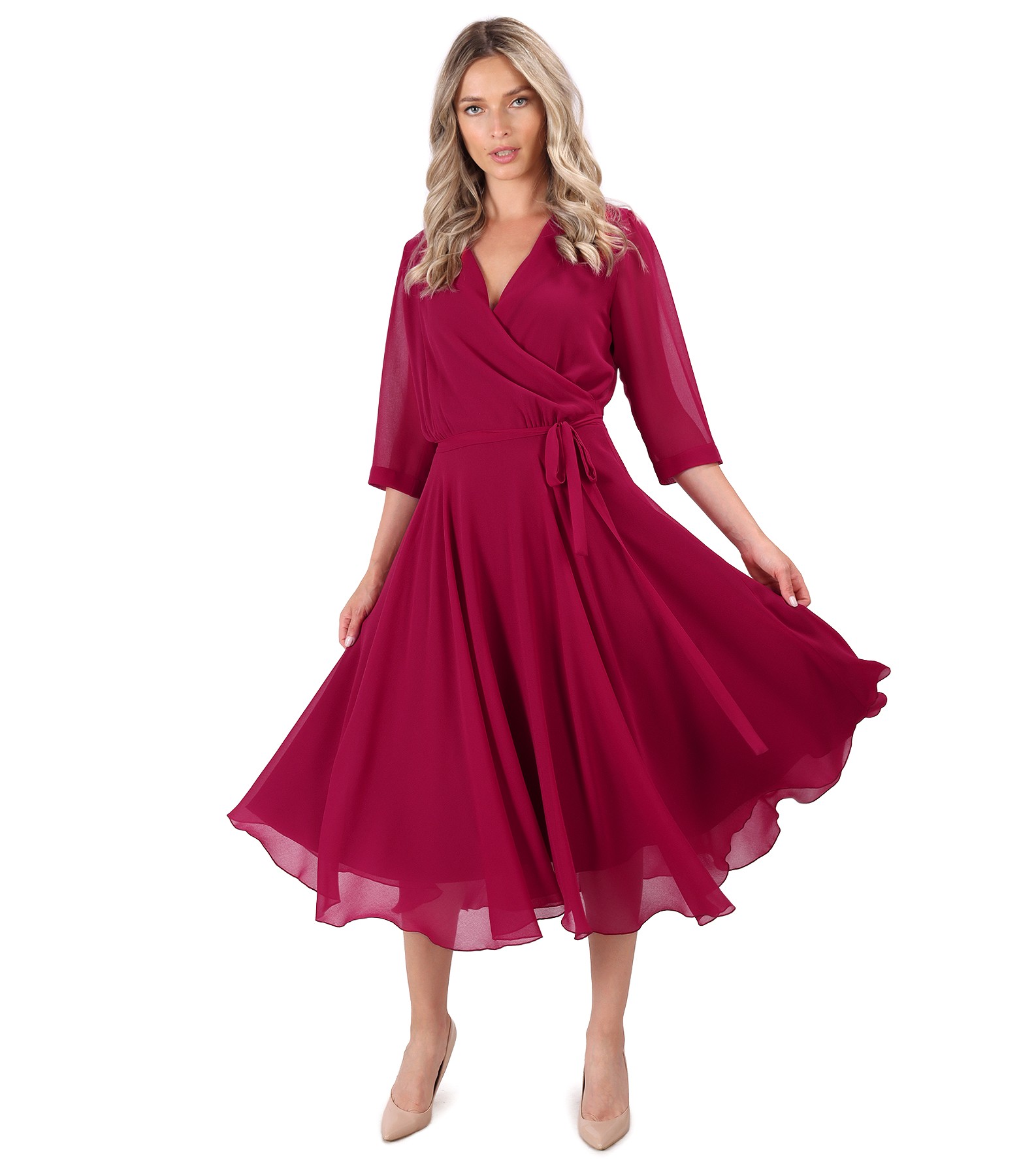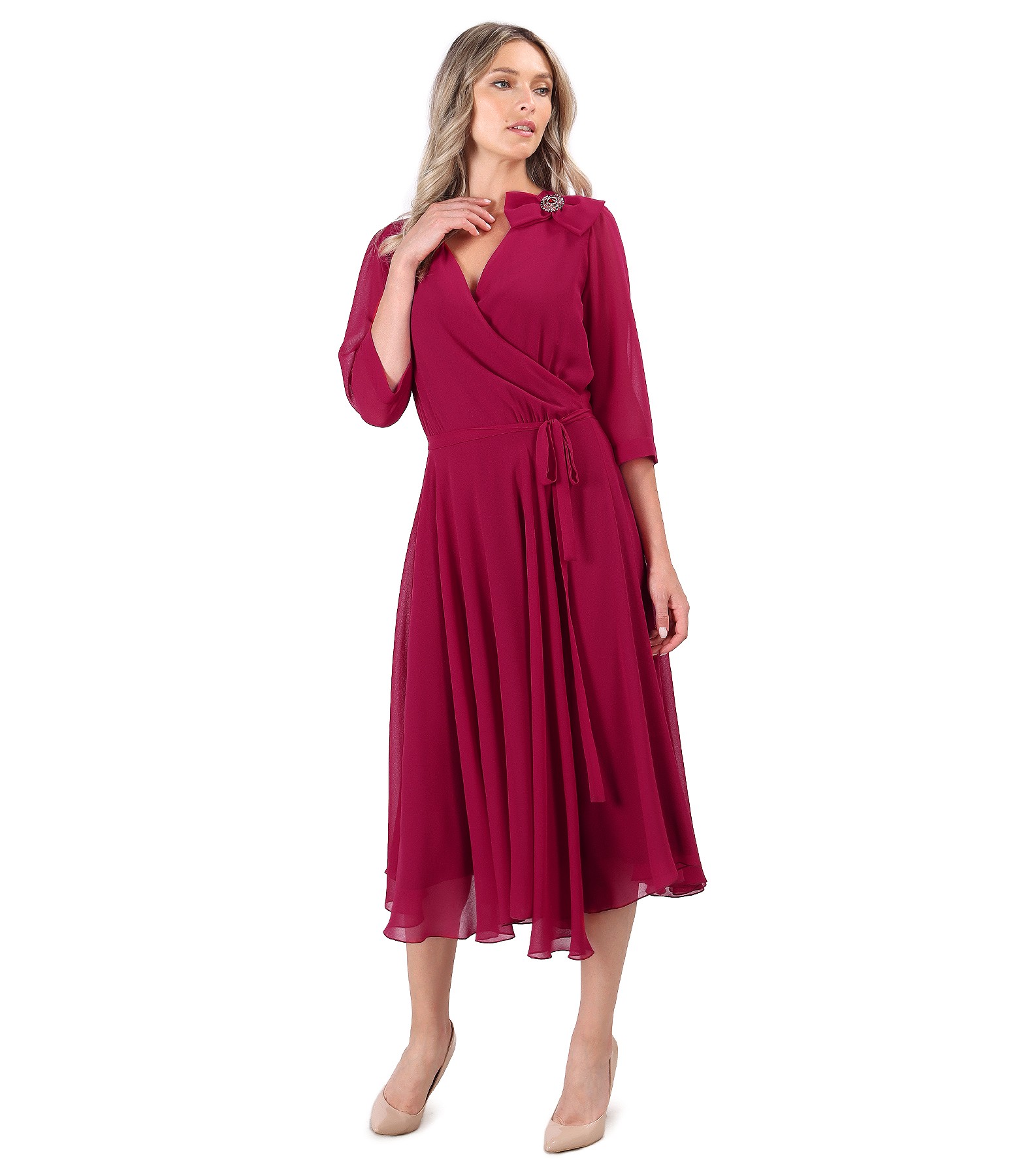Elegant veil dress, padded with viscose, with 3/4 sleeves, pleated chest, drawstring waist and detachable brooch with crystals. It closes with a concealed zipper on the middle back. At XL-3XL sizes, the back is doubled.