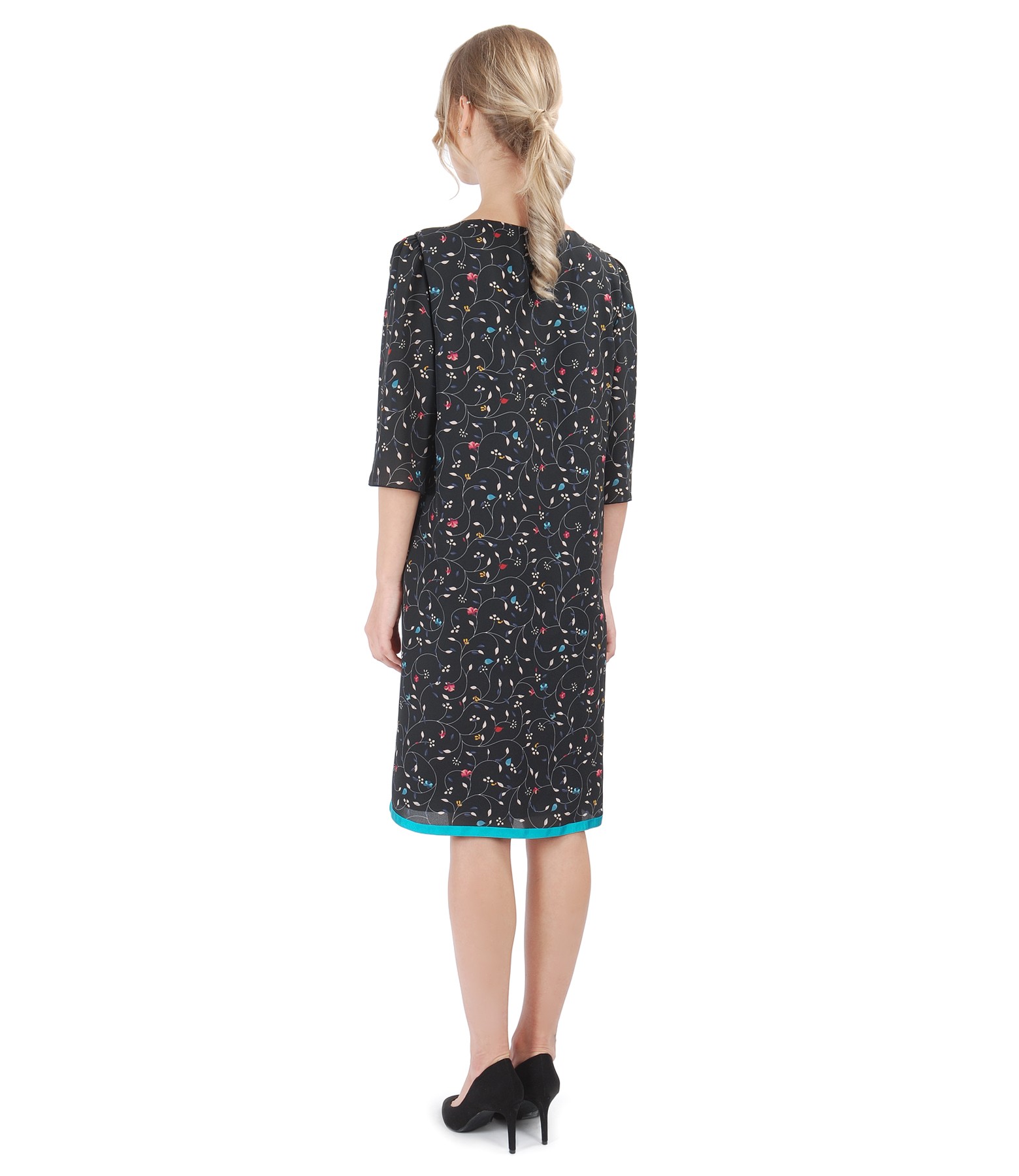 Flaring veil dress with floral print, casual, doubled with viscose, with round low-cut neck and rips band at the edge. Have no closing system.